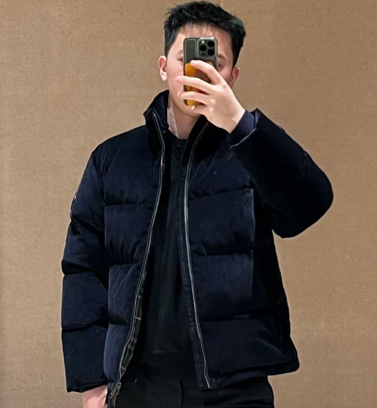 在穿著體感上,它提供了非常紮實的包裹感,填充分佈極為均勻,不會有局部厚度不一的情況。無論是搭配簡約的針織衫還是休閒衛衣,這件燈芯絨羽絨外套都能讓你在寒冷冬季依然保持俐落有型的個人風格。