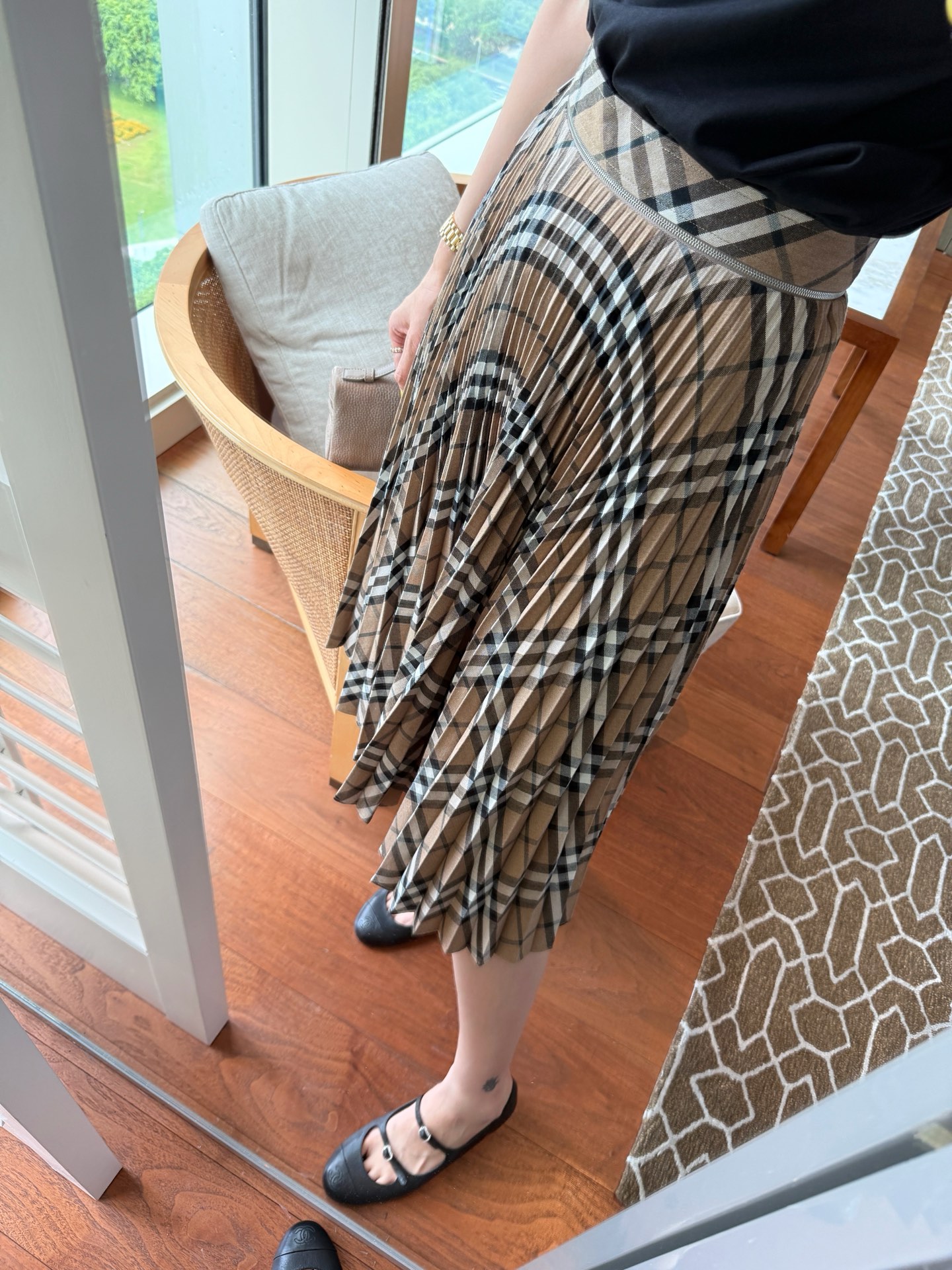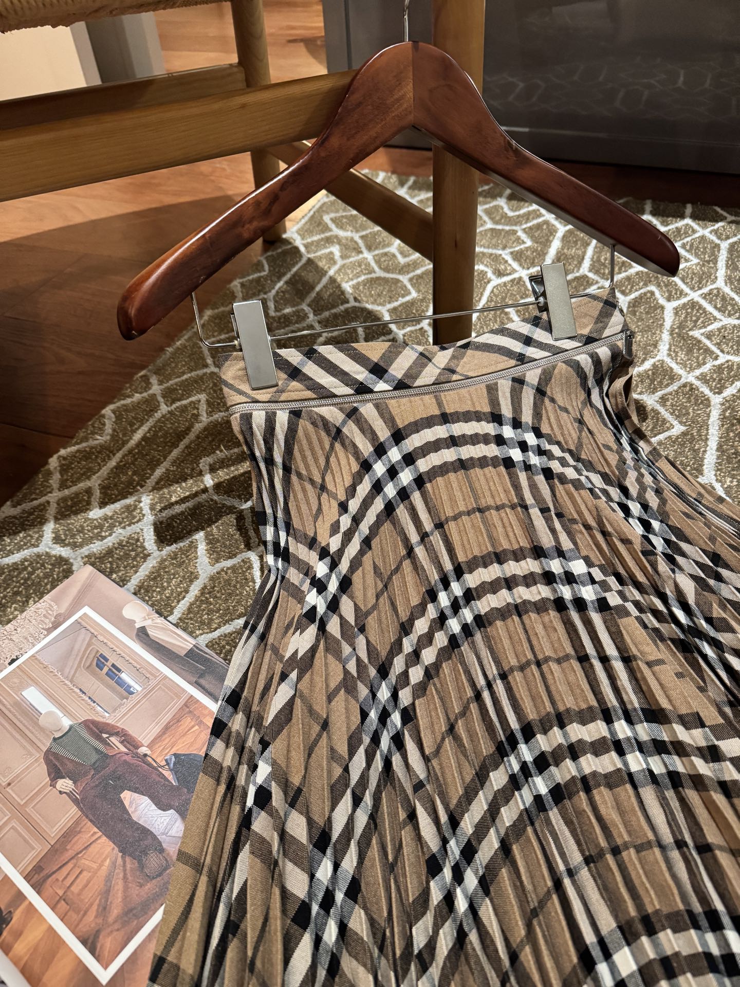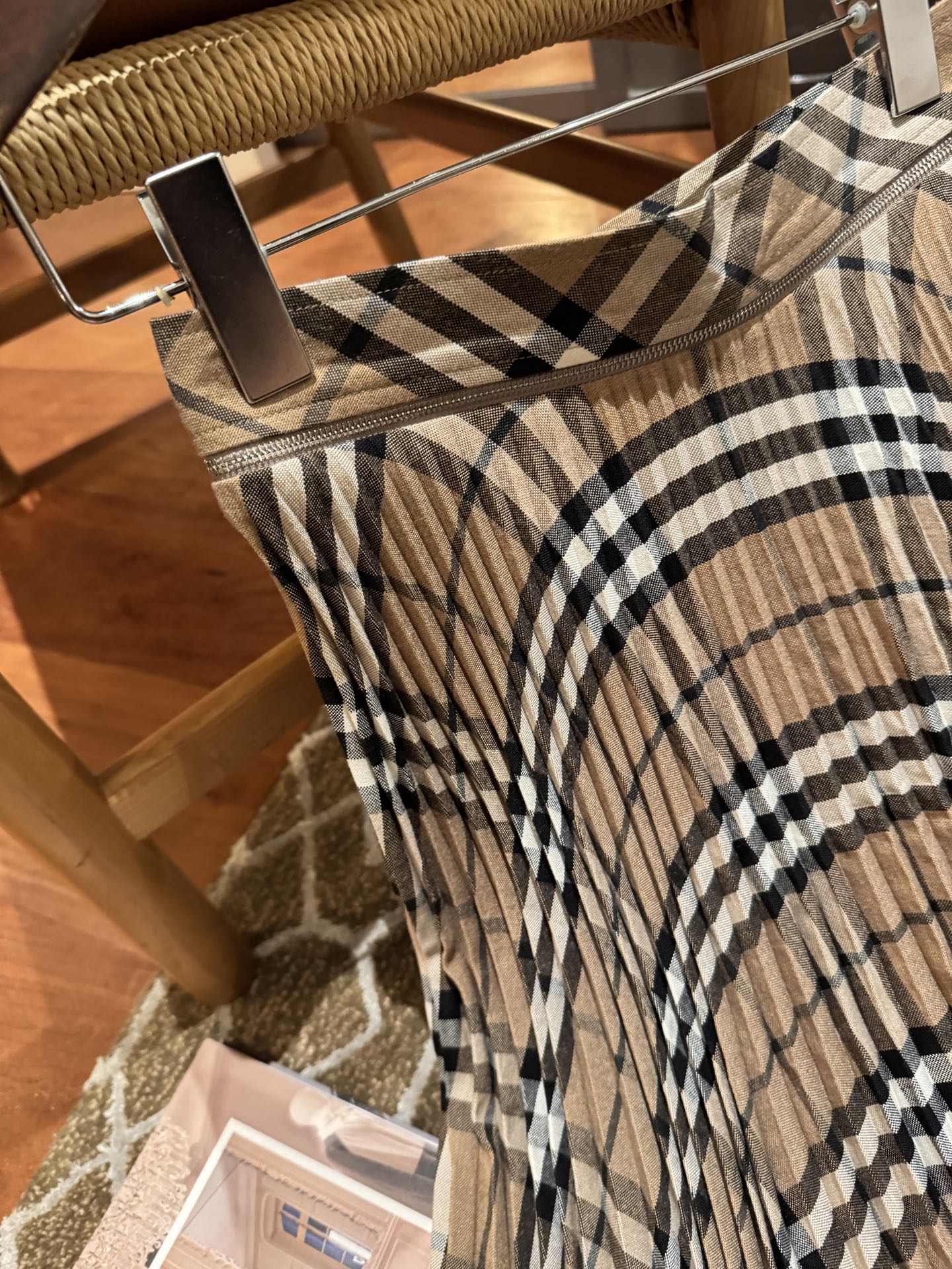 這款裙子整體走的是優雅又復古的風格,對格剪裁精準俐落,立體百摺設計讓裙身層次分明、走路時自帶律動感。