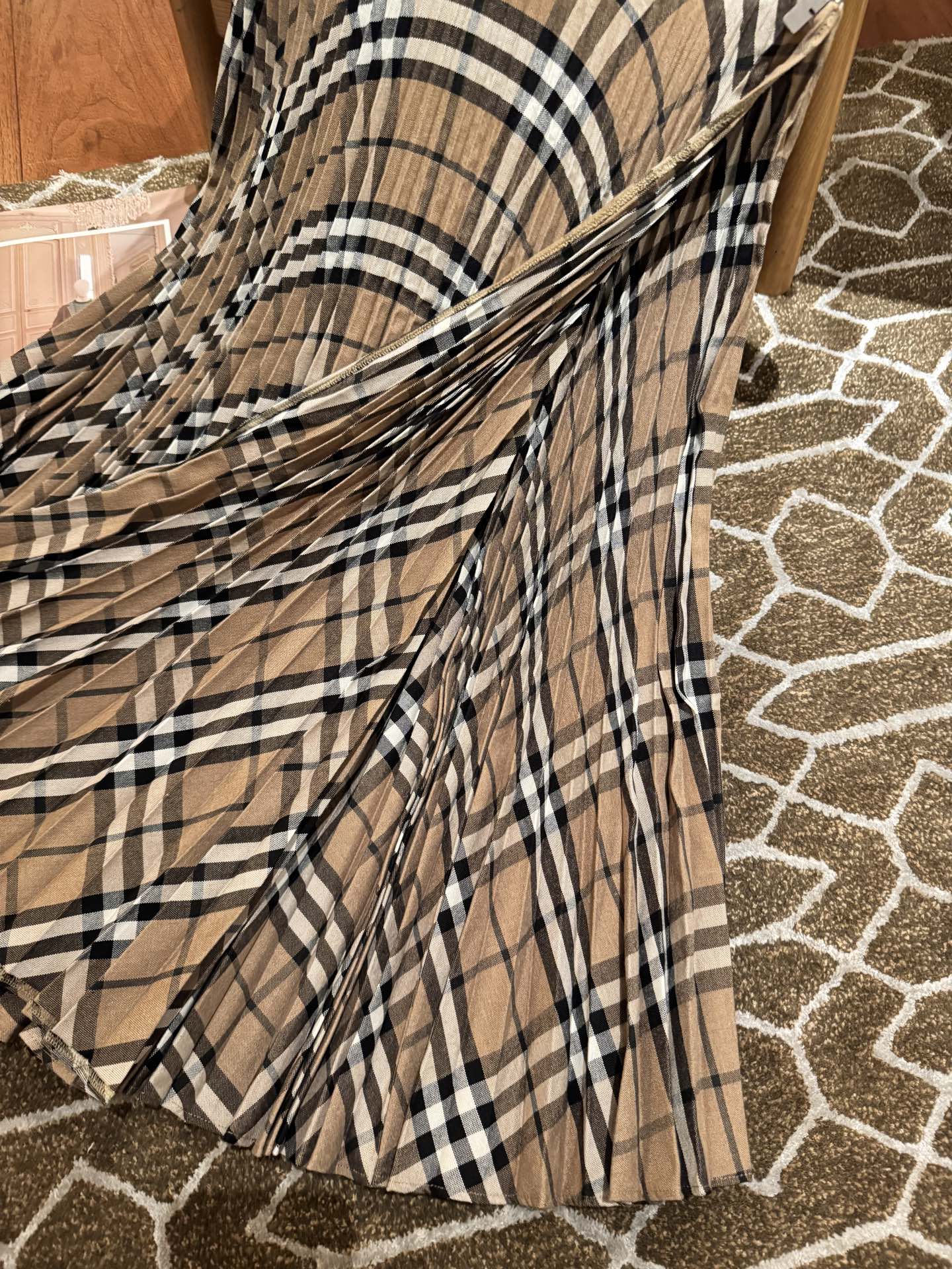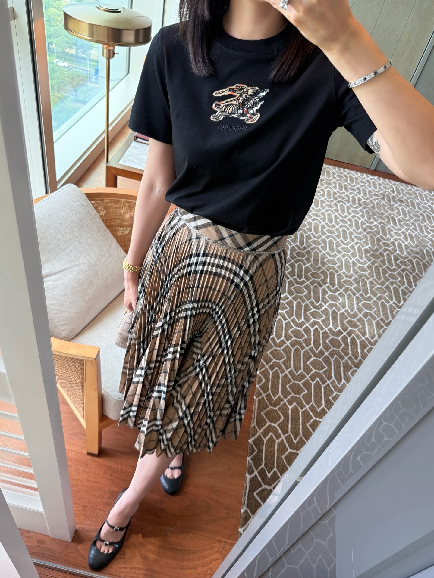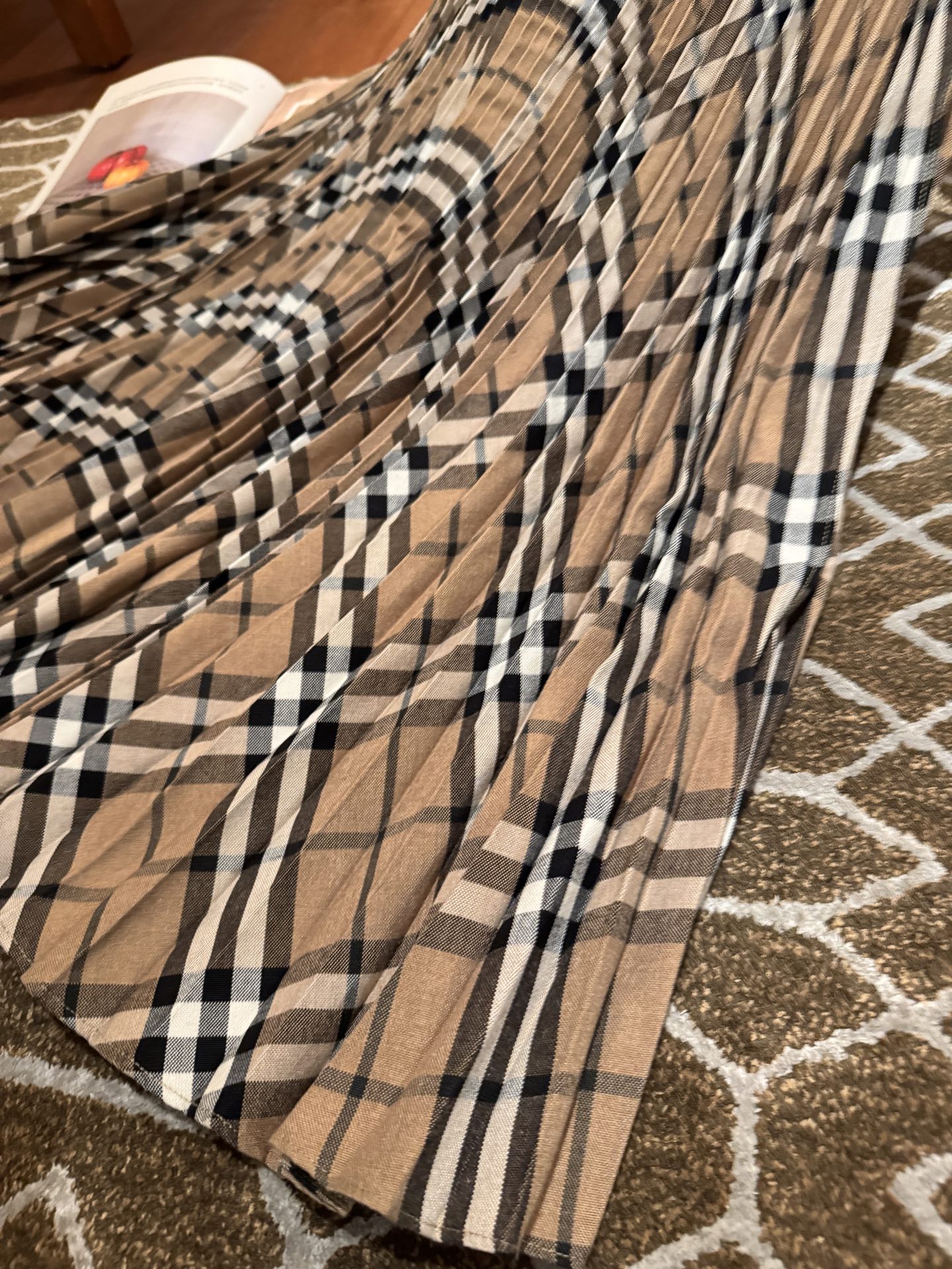這款裙子整體走的是優雅又復古的風格,對格剪裁精準俐落,立體百摺設計讓裙身層次分明、走路時自帶律動感。
