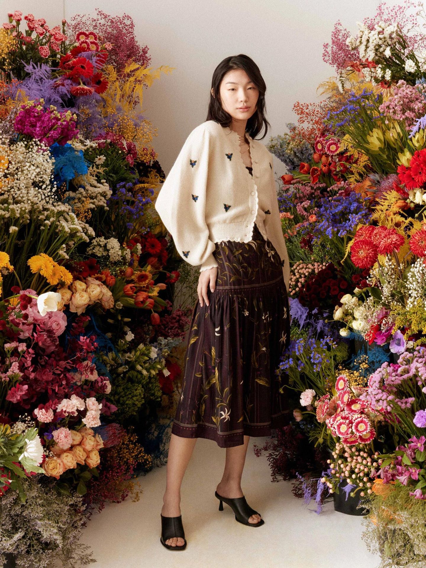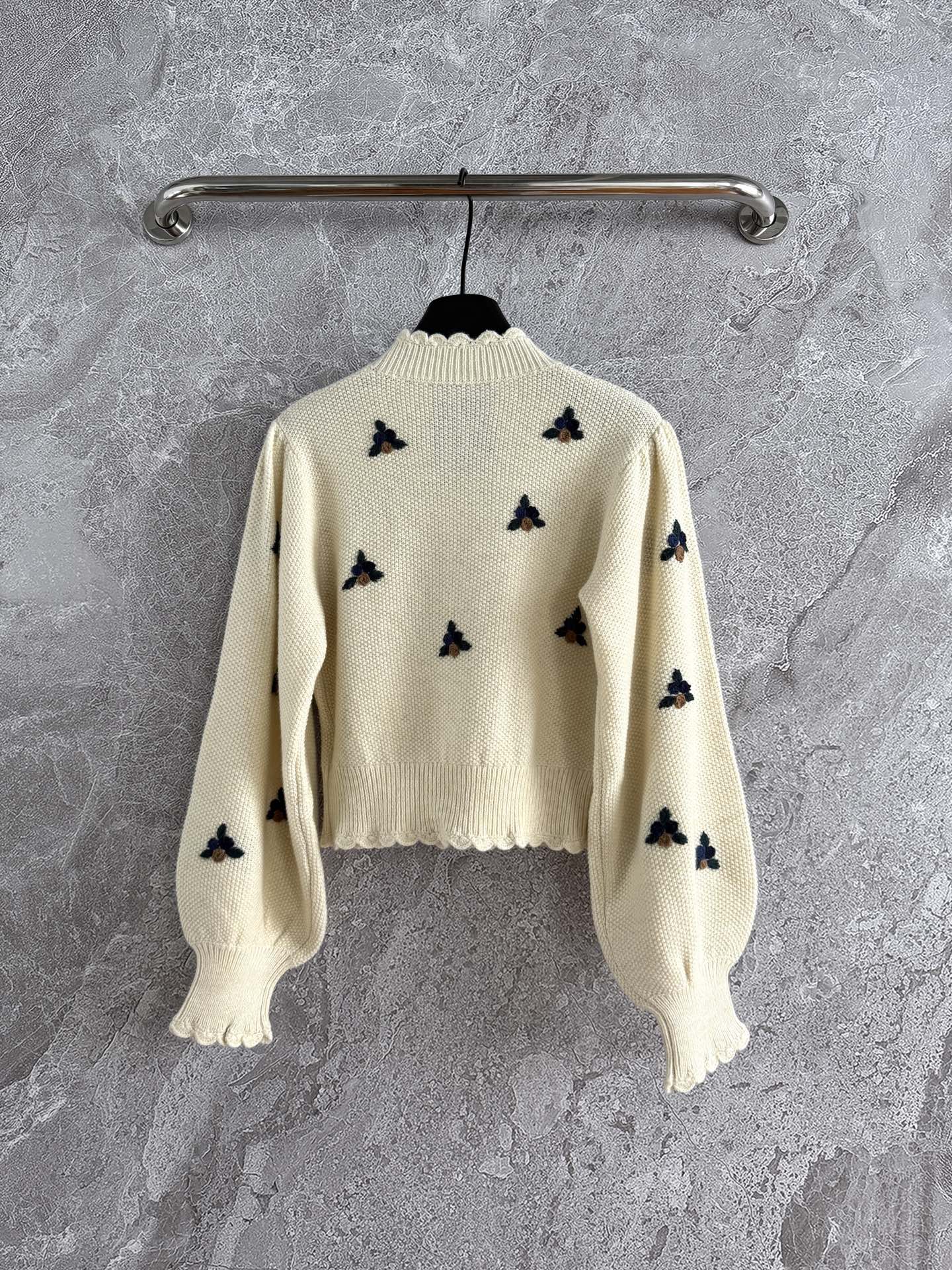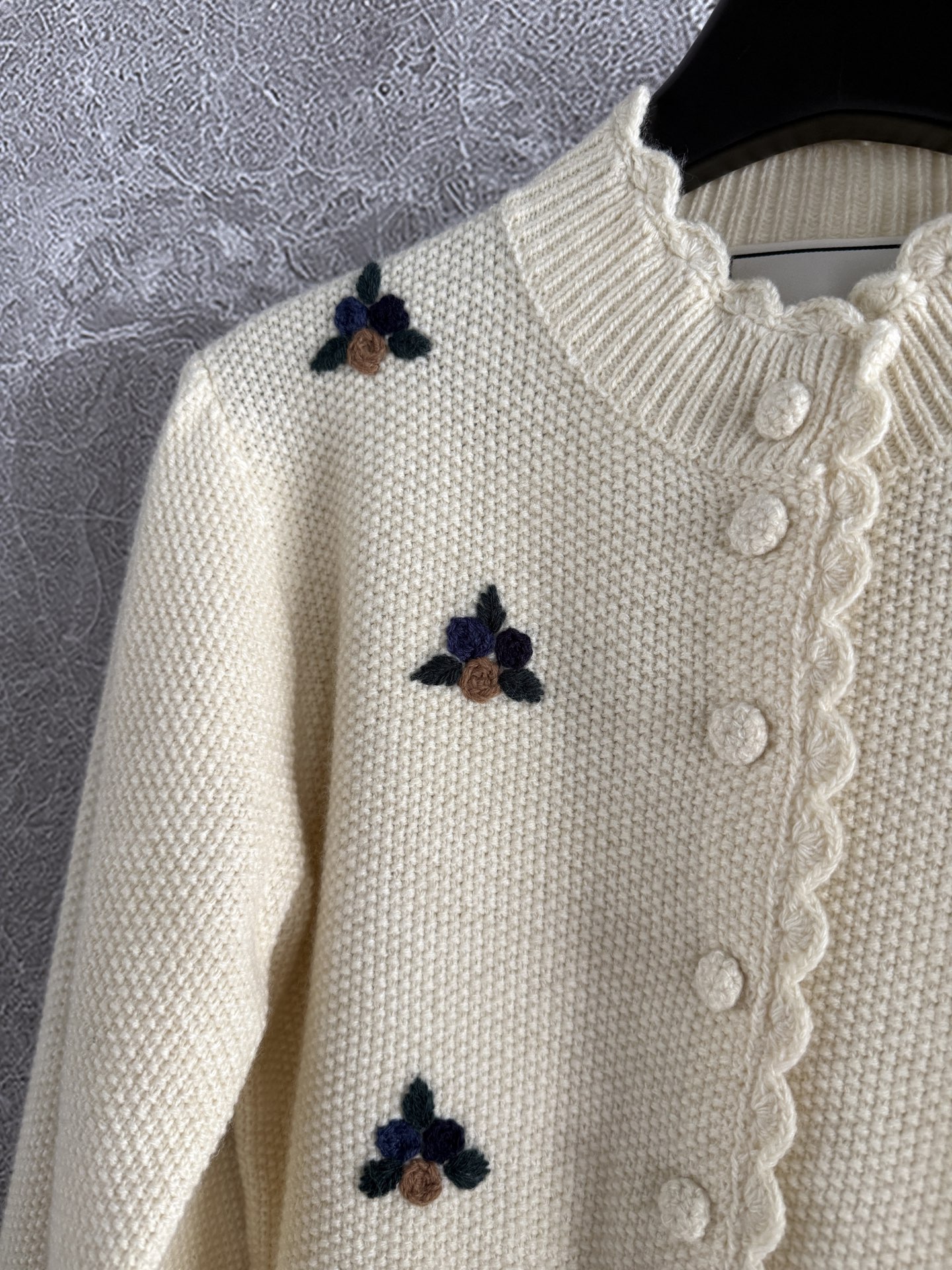 整件針織衫最大的亮點,就是點綴在上面的立體小花。每一朵都由工匠一針一線縫製而成,費時費工,細節裡滿是誠意。