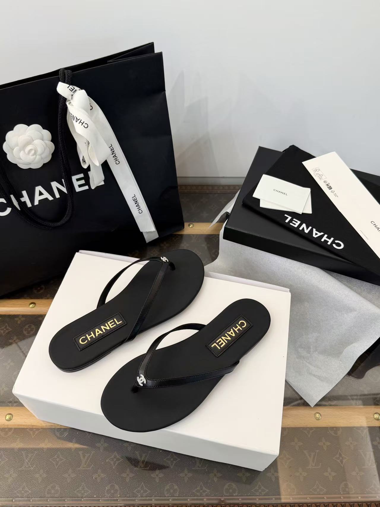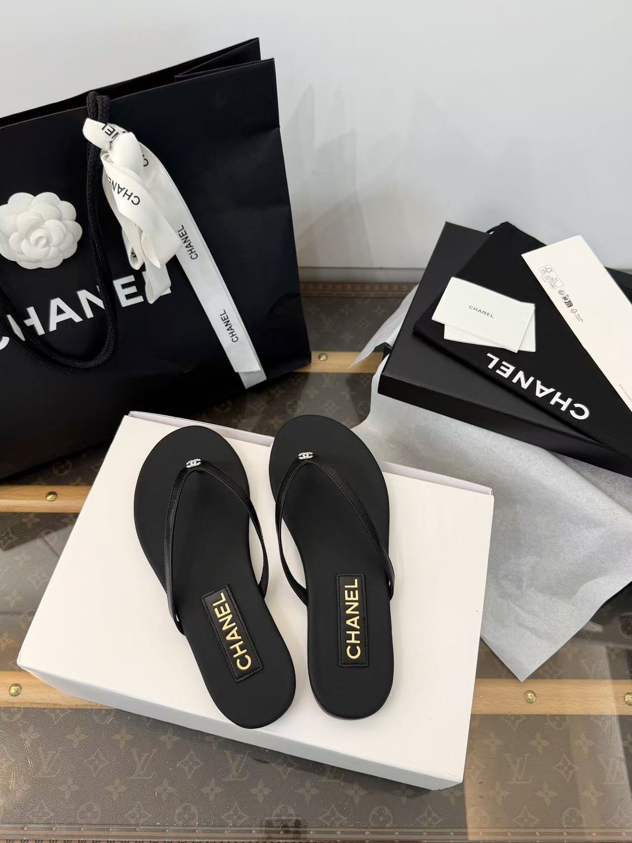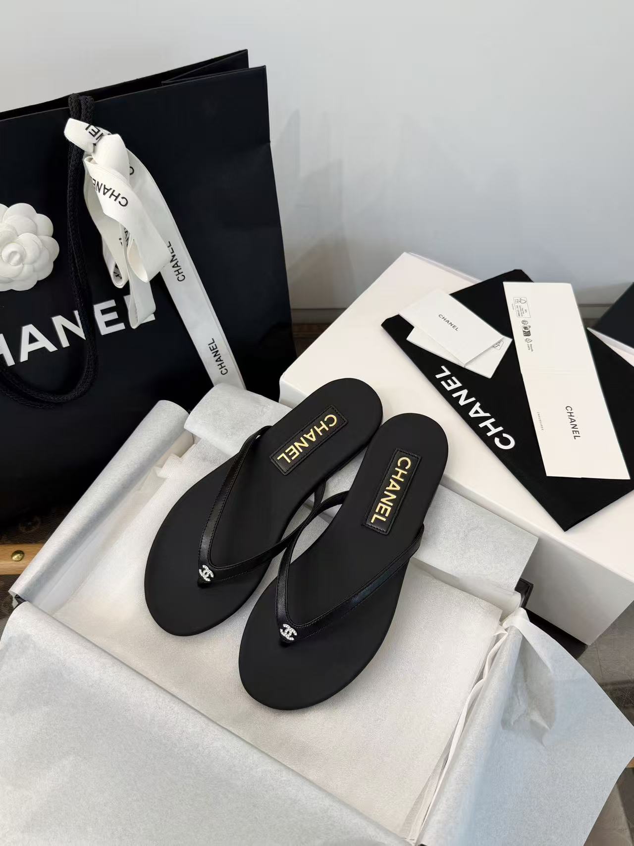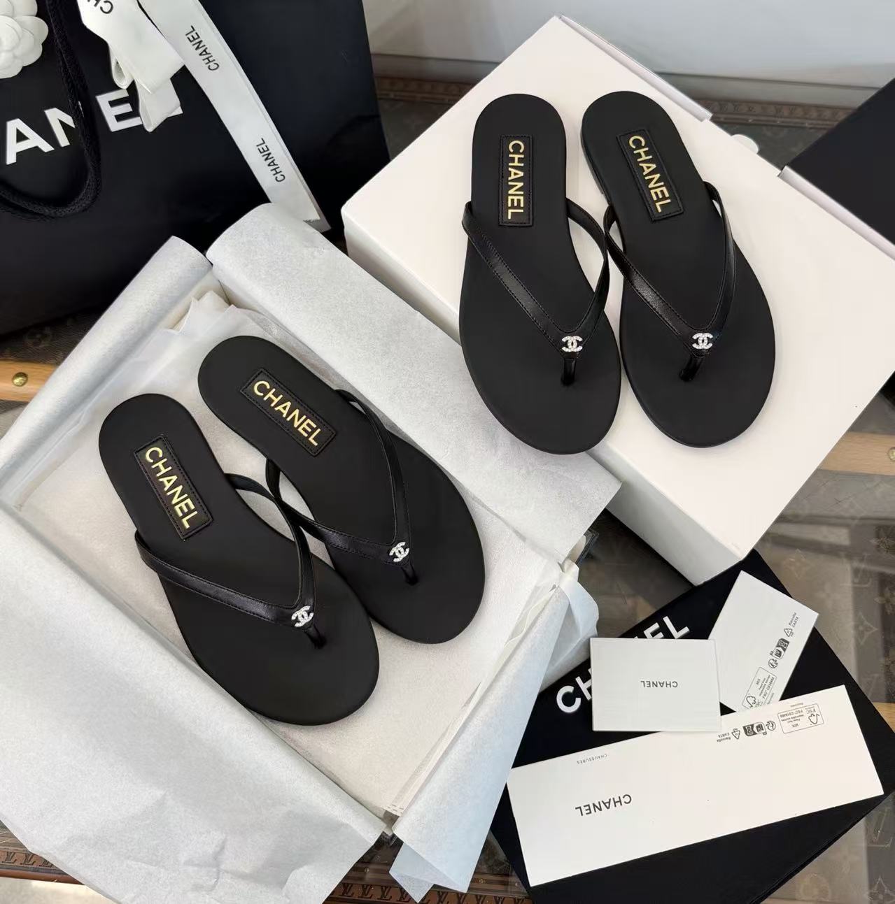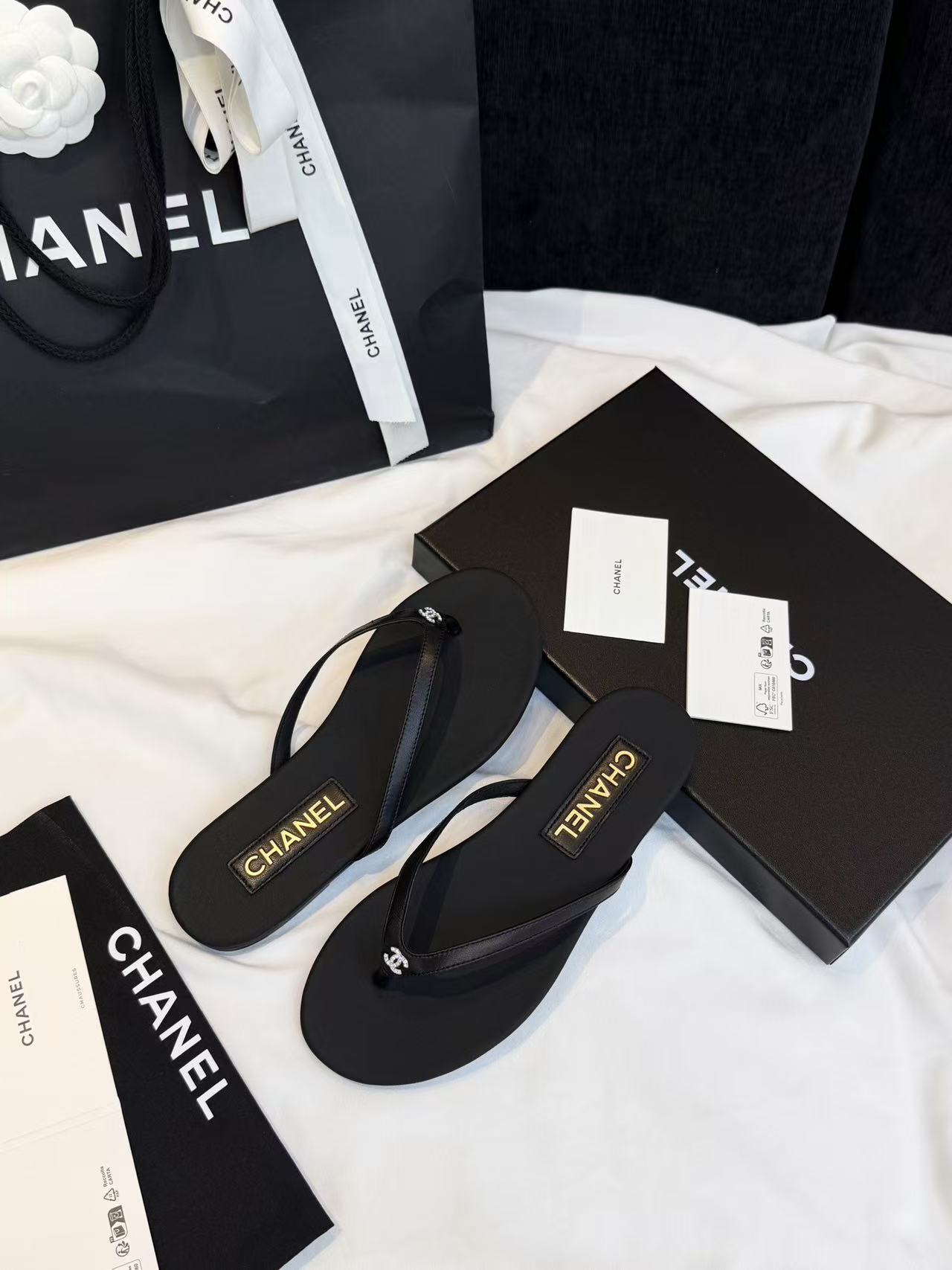 設計核心聚焦於「極簡廓形」與「奢華細節」的碰撞——在觸感極致細膩的小羊皮底座上,鑲綴了璀璨奪目的水鑽雙 C Logo,讓每一滴陽光都能在腳尖折射出精緻的光芒。