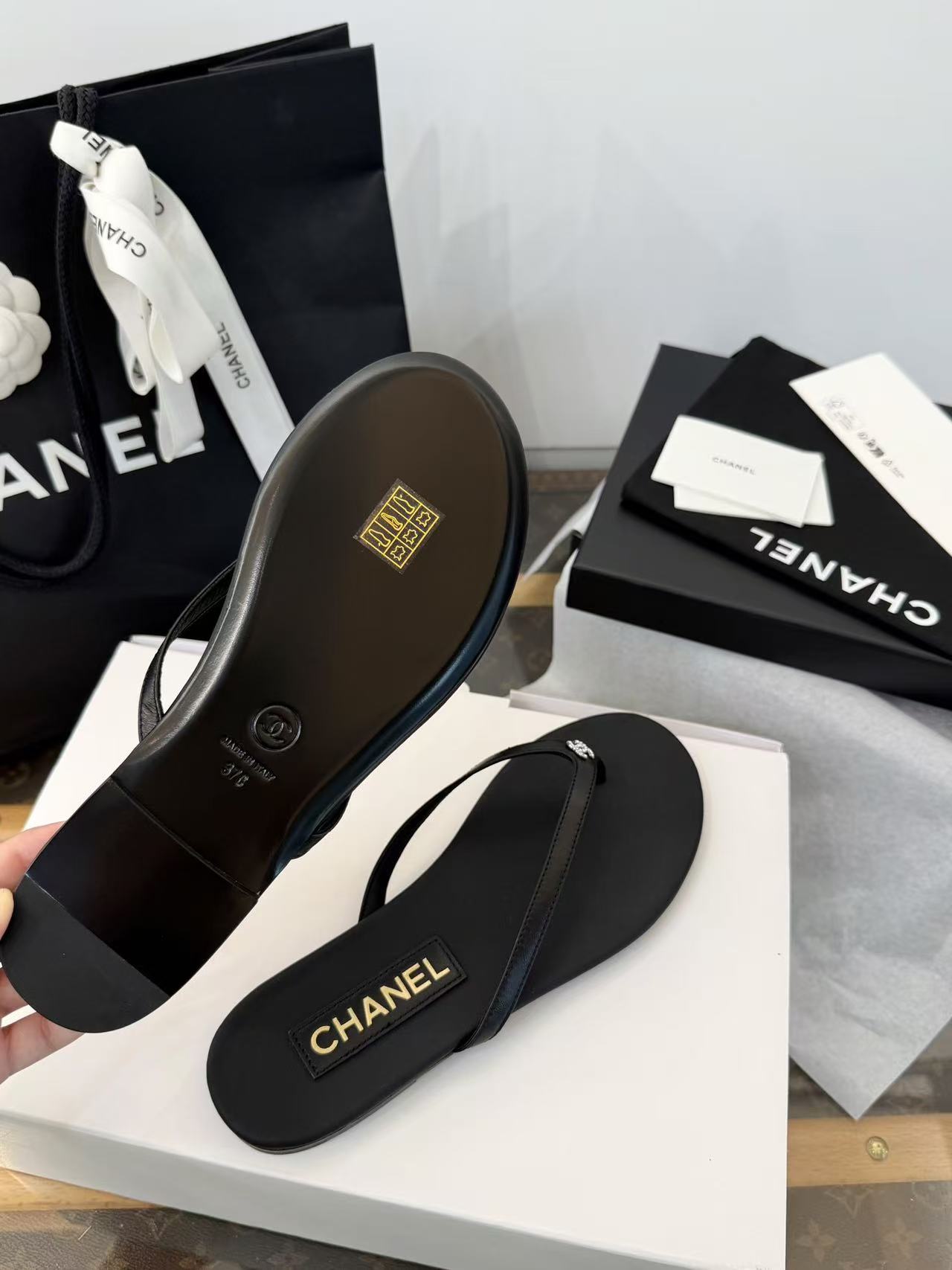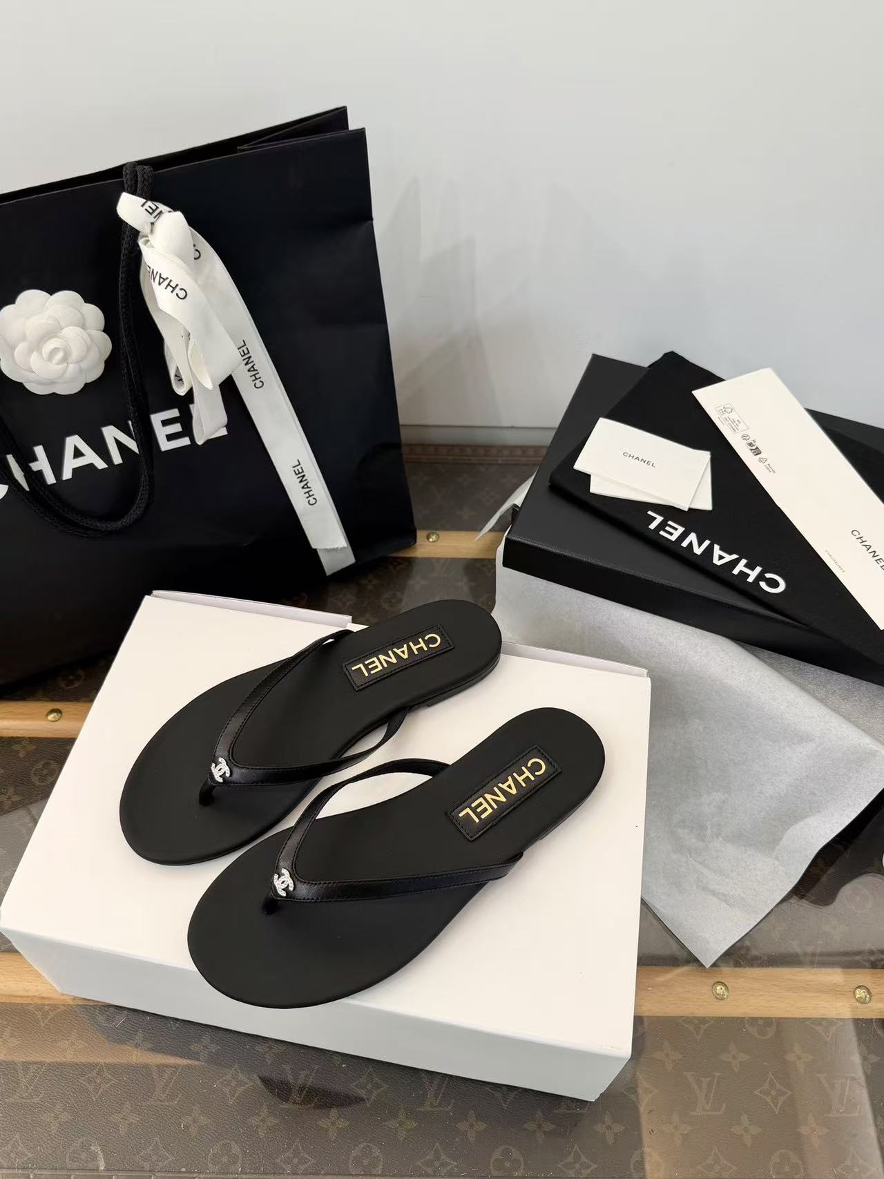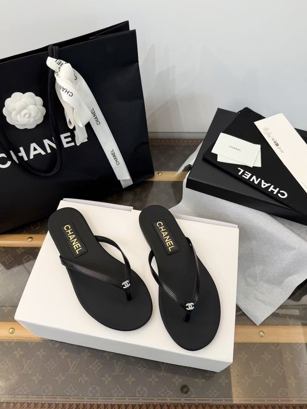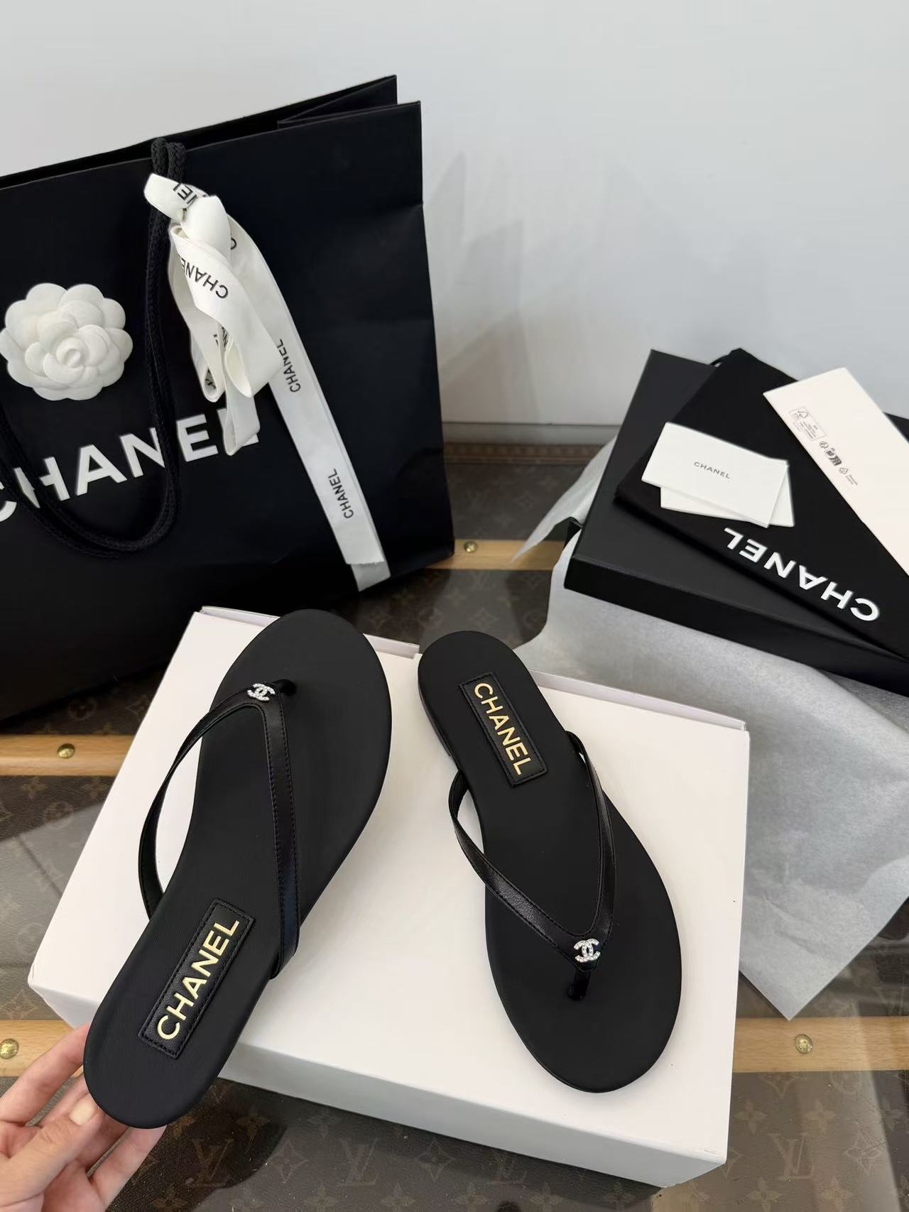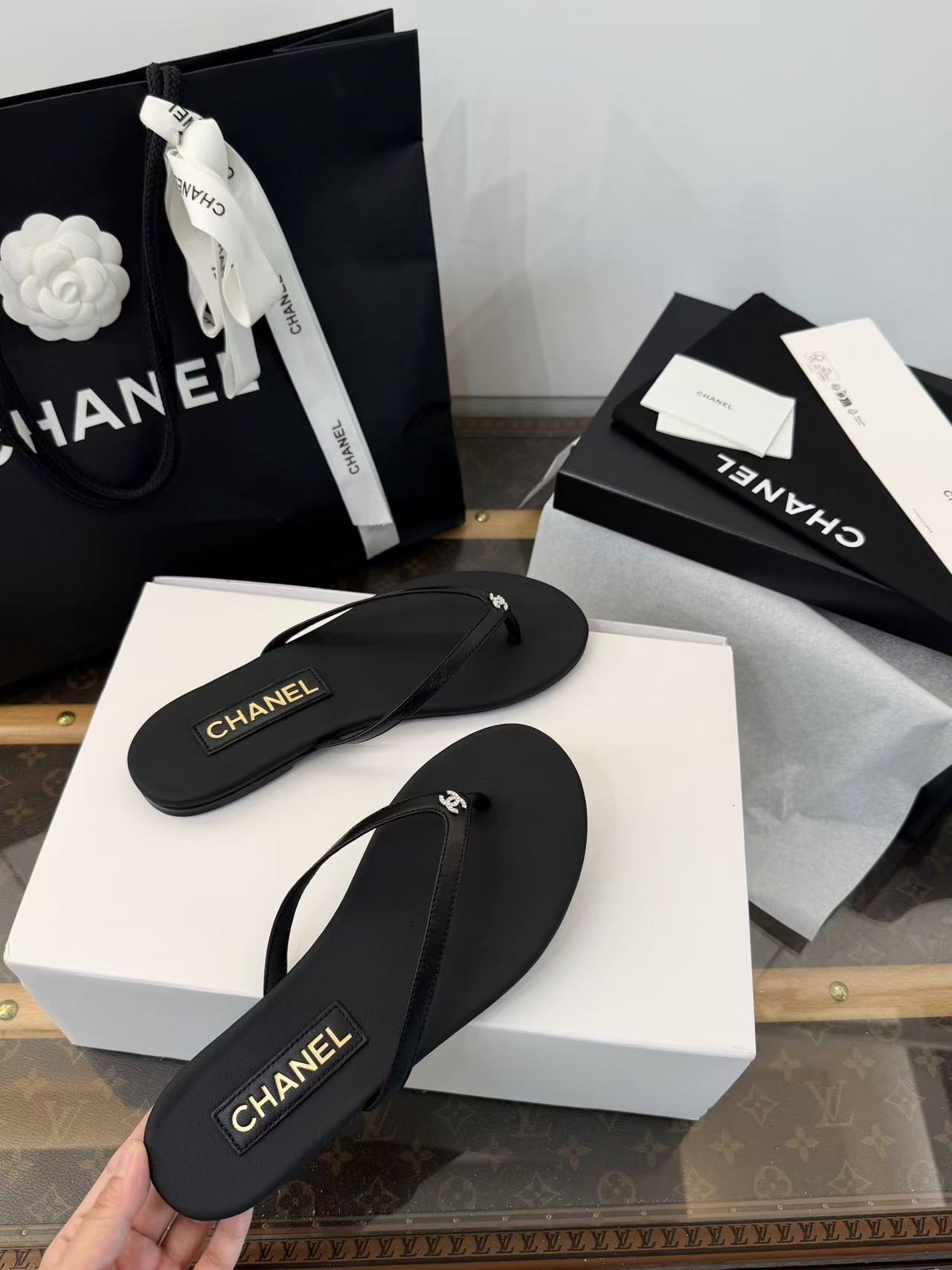 設計核心聚焦於「極簡廓形」與「奢華細節」的碰撞——在觸感極致細膩的小羊皮底座上,鑲綴了璀璨奪目的水鑽雙 C Logo,讓每一滴陽光都能在腳尖折射出精緻的光芒。