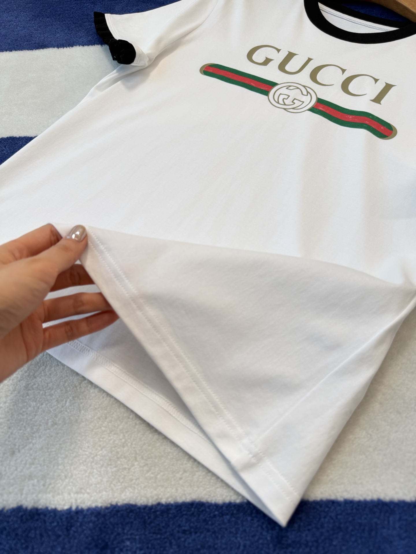這款經典撞色設計短袖,真的會讓人一穿就愛上。以復古紅綠織帶搭配經典雙G印花,整體氛圍帶點復古韻味,同時又保有現代時尚的俐落感,簡單卻不單調。