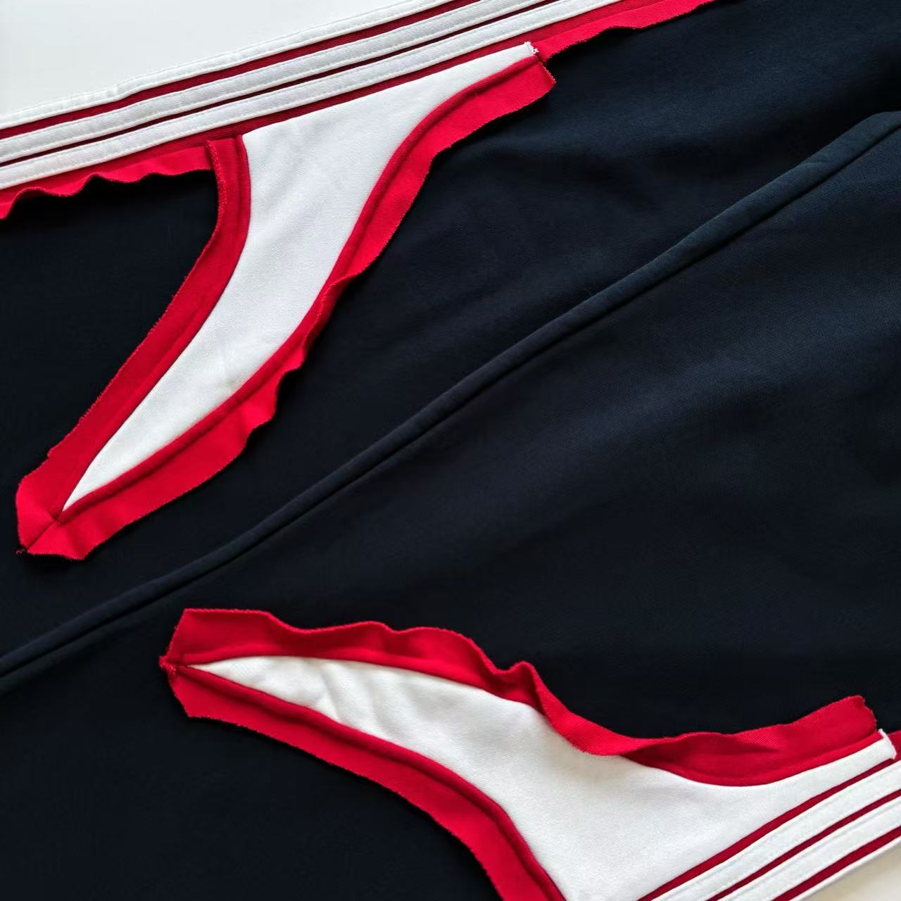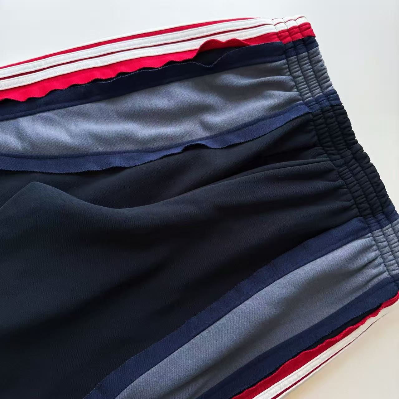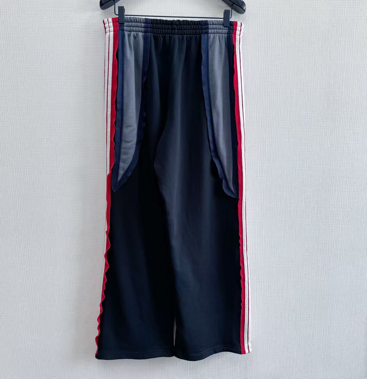 這件長褲的材質真的非常講究!它使用了 380g 的復古平紋針織布料,並拼接了 16S 和 10S 魚鱗底衛衣布料,透過同色系的平紋針織布料,製作出立體的間條拼接設計,讓整件長褲看起來更有層次感。最棒的是,面料還經過炒砂做舊洗水和石磨處理,完美營造出復古的質感,手感柔軟又親膚。