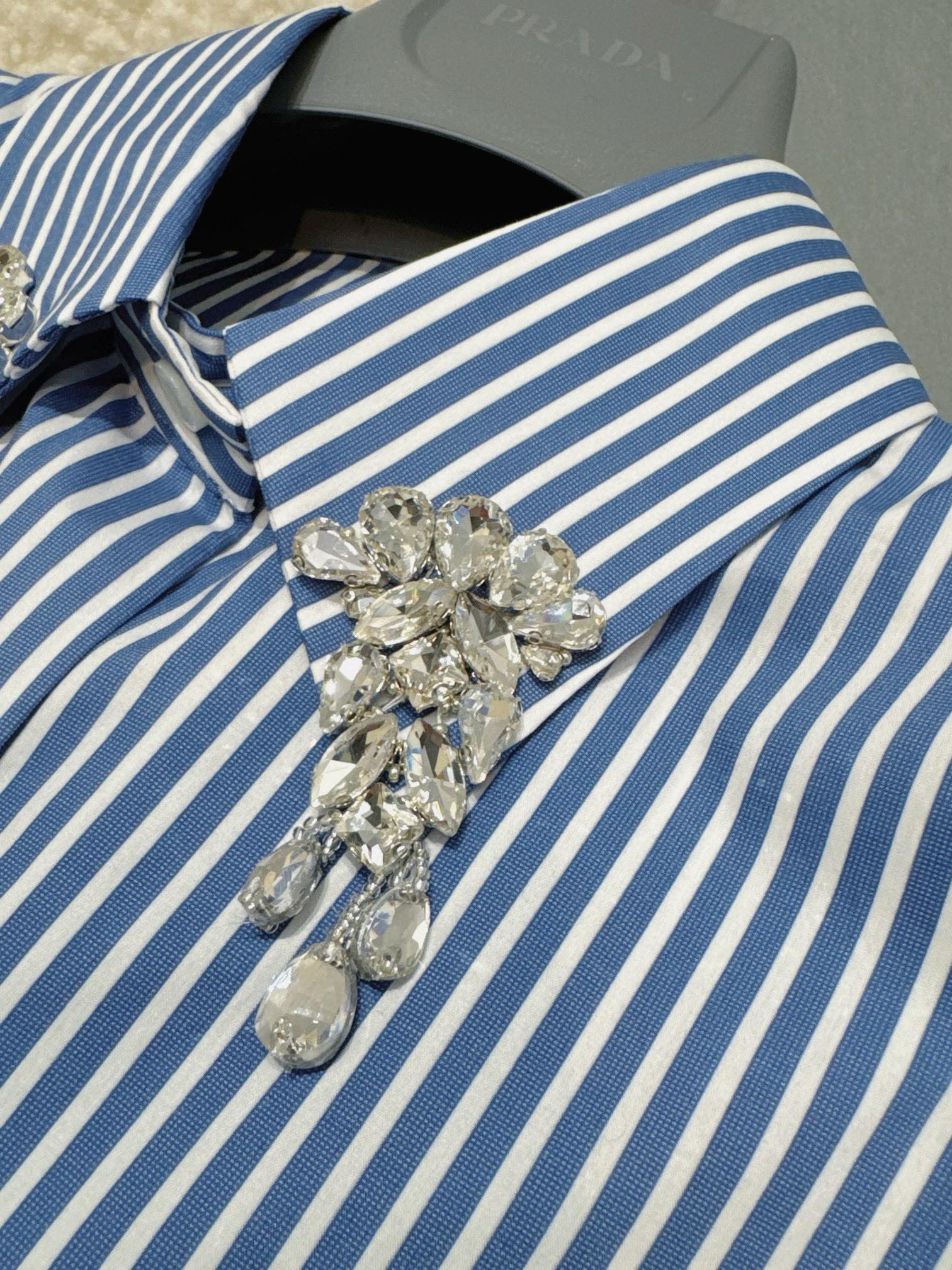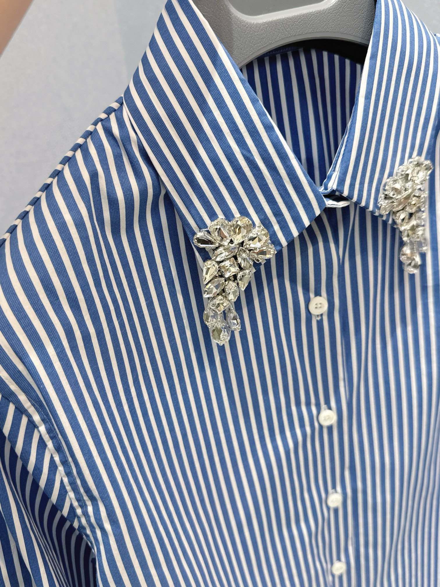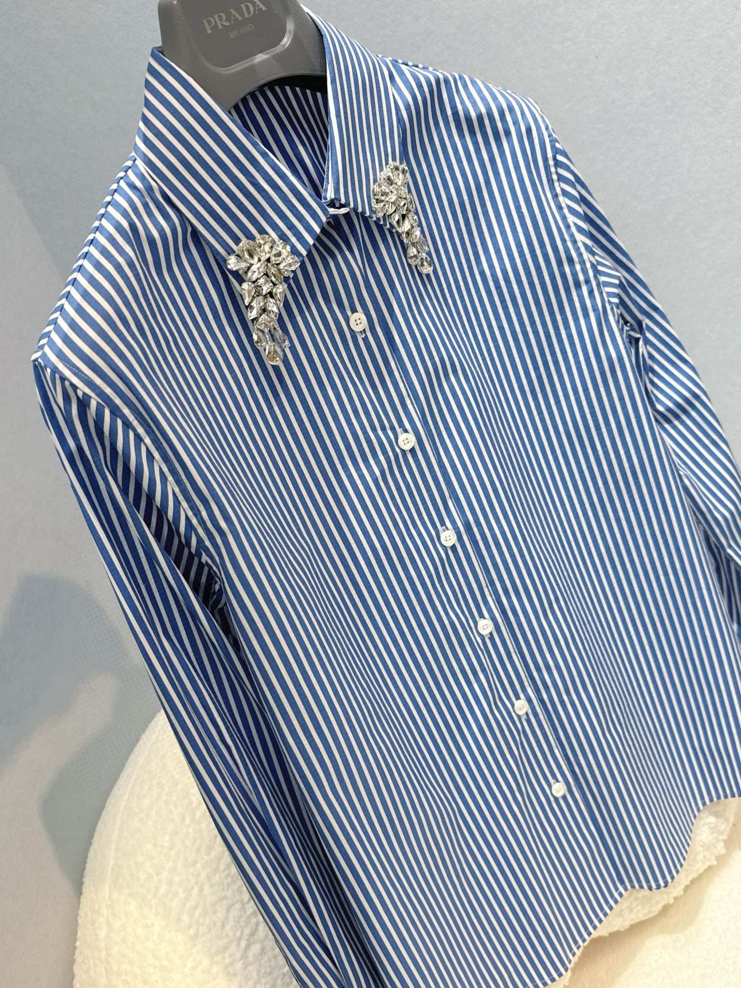 這件襯衫超美 領口精緻的鑽飾設計,讓整件襯衫都變得閃閃發光。寬鬆的版型,完全不挑身材,就算微肉的女孩也能輕鬆駕馭。後背的經典品牌倒三角標誌,更是點睛之筆,彰顯了品牌的獨特魅力。