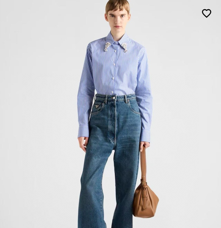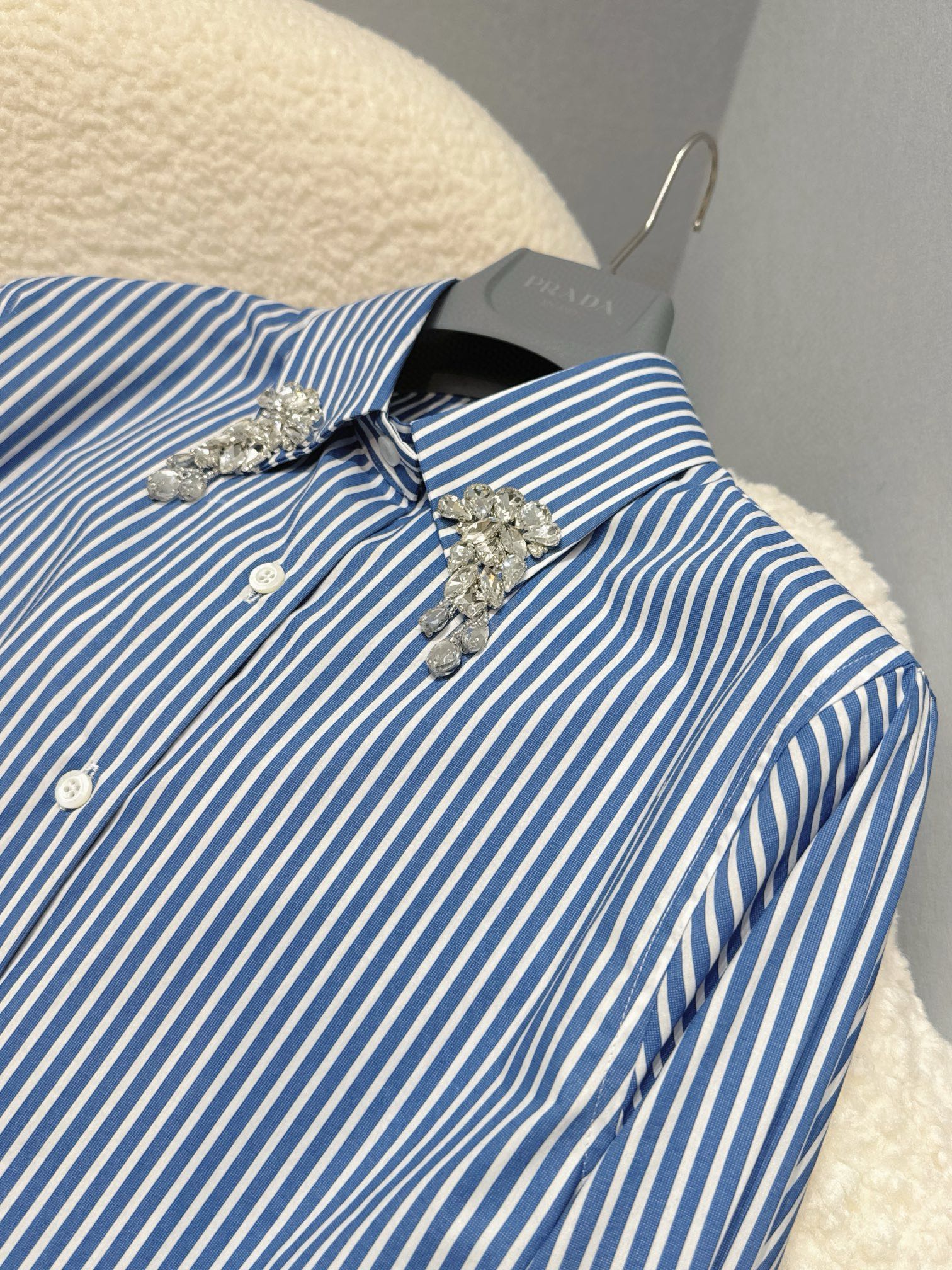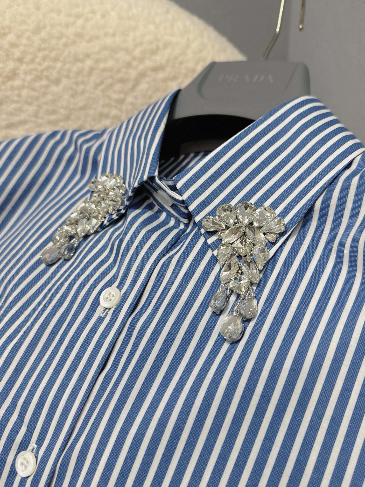 這件襯衫超美 領口精緻的鑽飾設計,讓整件襯衫都變得閃閃發光。寬鬆的版型,完全不挑身材,就算微肉的女孩也能輕鬆駕馭。後背的經典品牌倒三角標誌,更是點睛之筆,彰顯了品牌的獨特魅力。