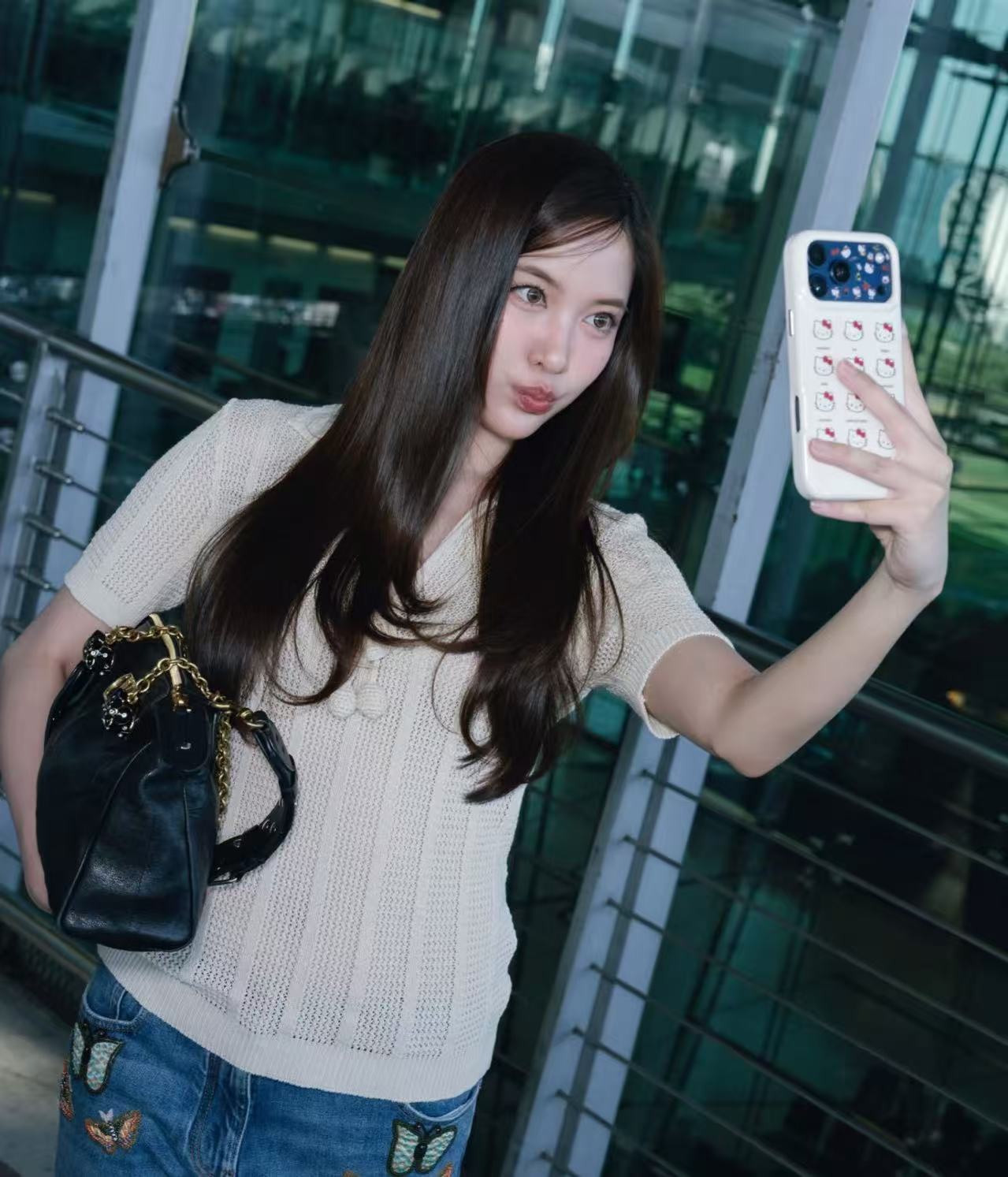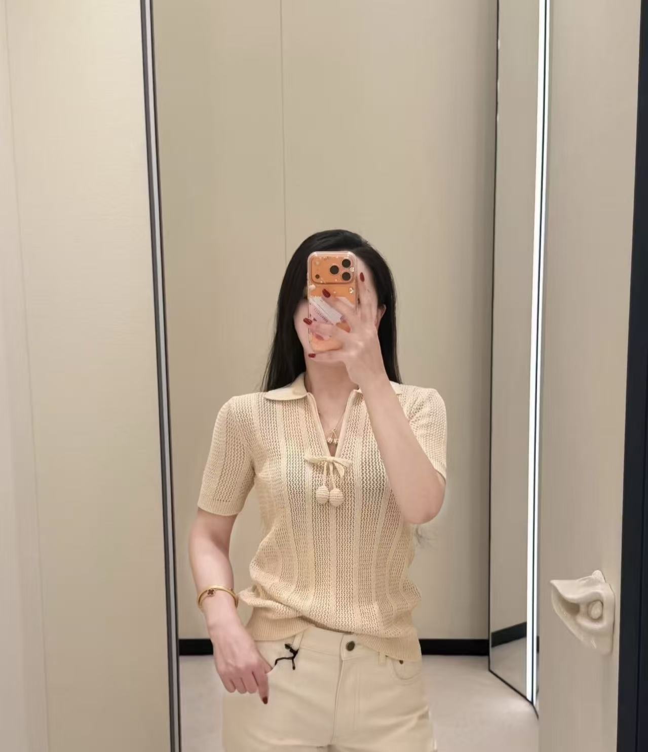 經典 V 領結合標誌性櫻桃刺繡,能極致延伸頸部線條並展現俐落的直角肩,展現出一種內斂且極致高級的輕奢質感,是那種單穿就能贏很大的「氛圍感神器」。