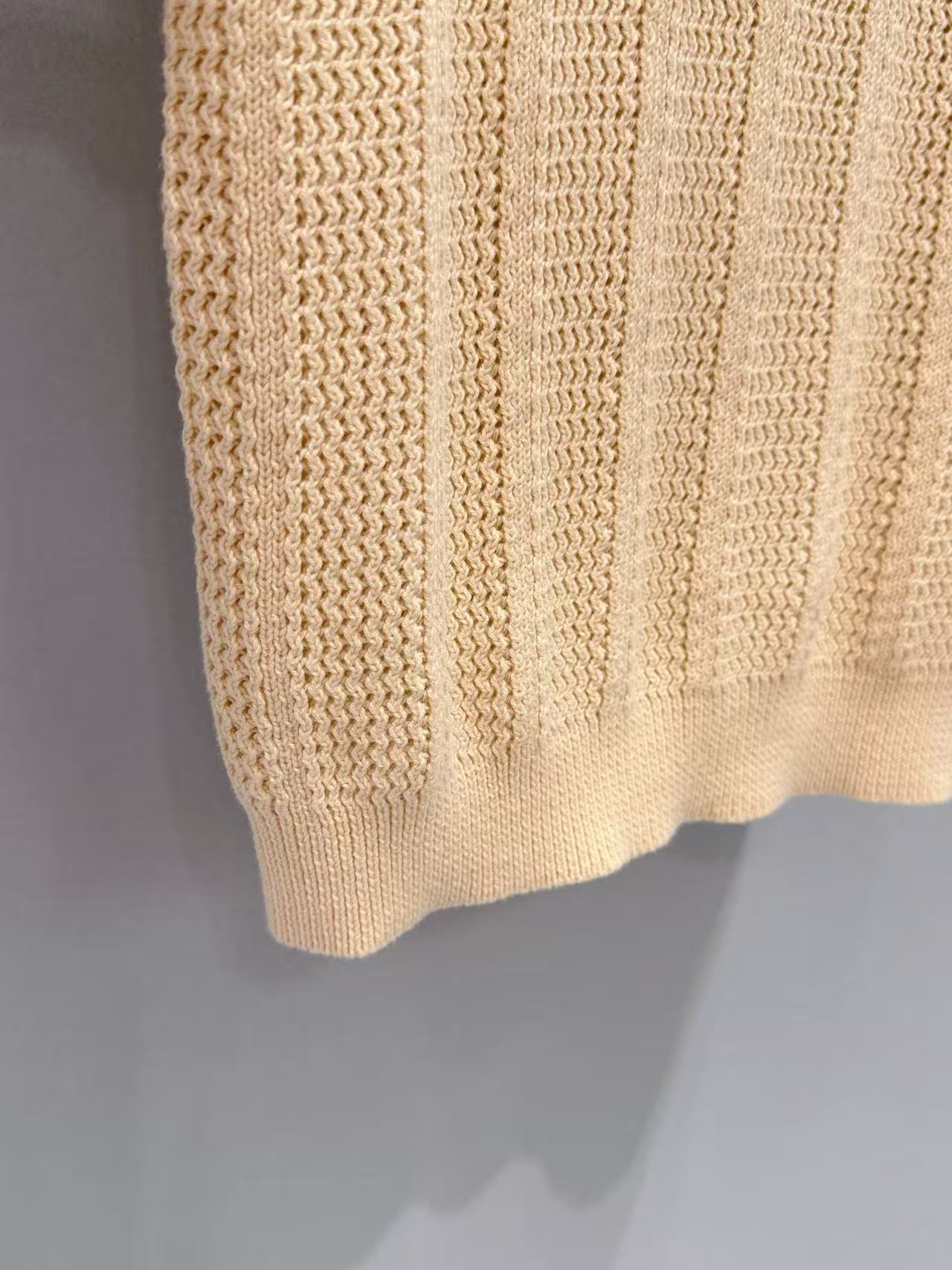 利用 V 領剪裁 產生的視覺縱向延伸,搭配短袖廓形,能有效修飾上半身比例。搭配 Miu 貼布繡字母百褶中長裙,利用「櫻桃針織 x 百褶裙」的層次疊加,秒變極具質感的校園女主風格。