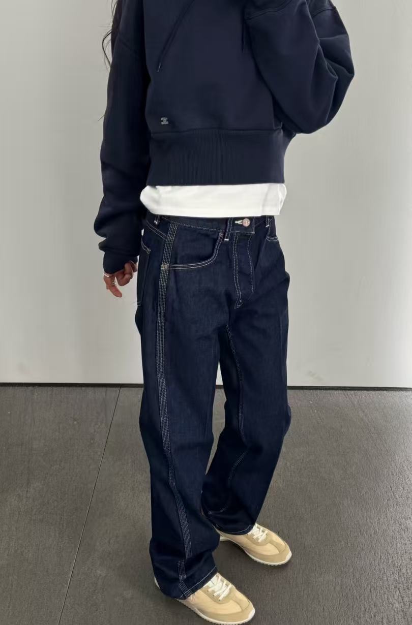 深邃星空藍調結合立體直筒剪裁,展現出一種內斂且極致高級的輕奢質感,無論是搭配西裝外套還是極簡 T 恤,都能輕鬆拿捏那份獨有的法式隨性美學。