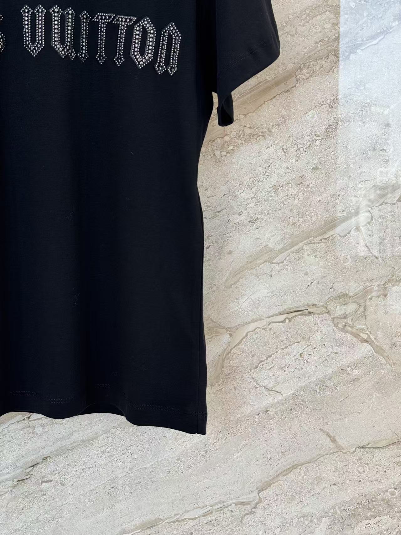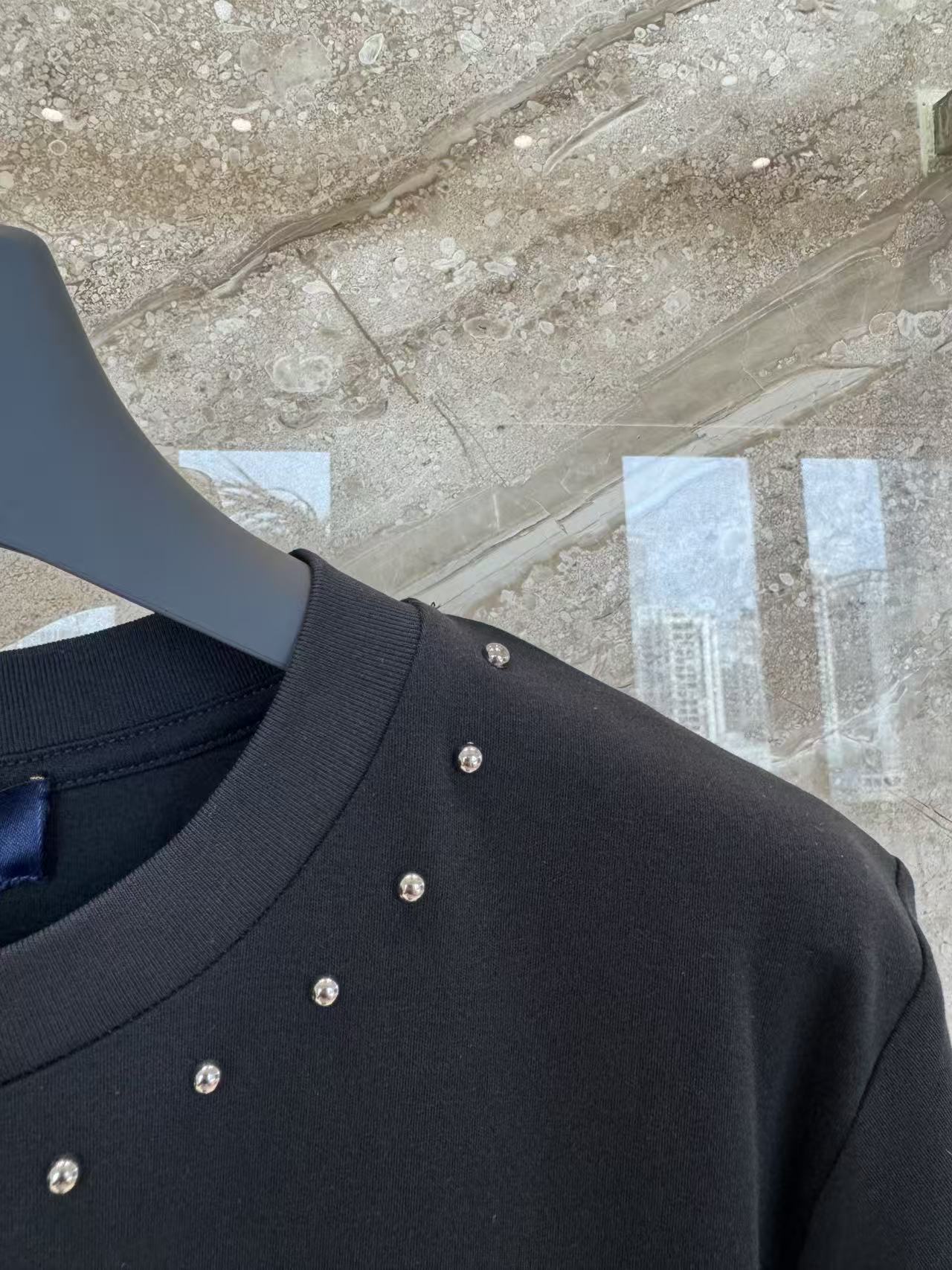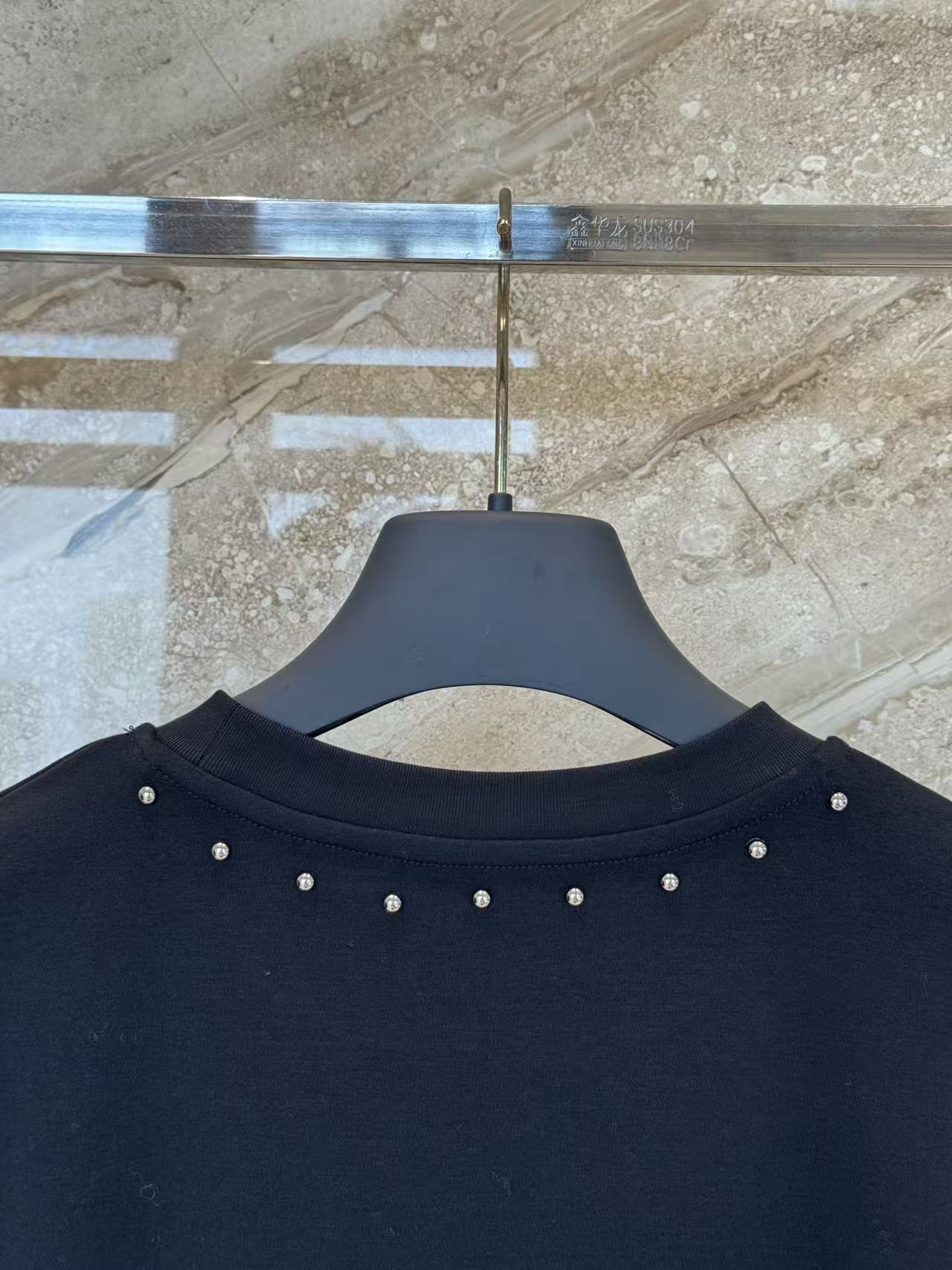 設計的核心聚焦於胸前那枚耀眼的水晶刺繡 Logo,不同於一般印花,手工鑲綴的水晶在光影下能隨著動作閃爍迷人光澤;搭配領口環繞的金屬鉚釘點綴,為經典的黑底 T 恤注入了獨特的層次感與細節美學。