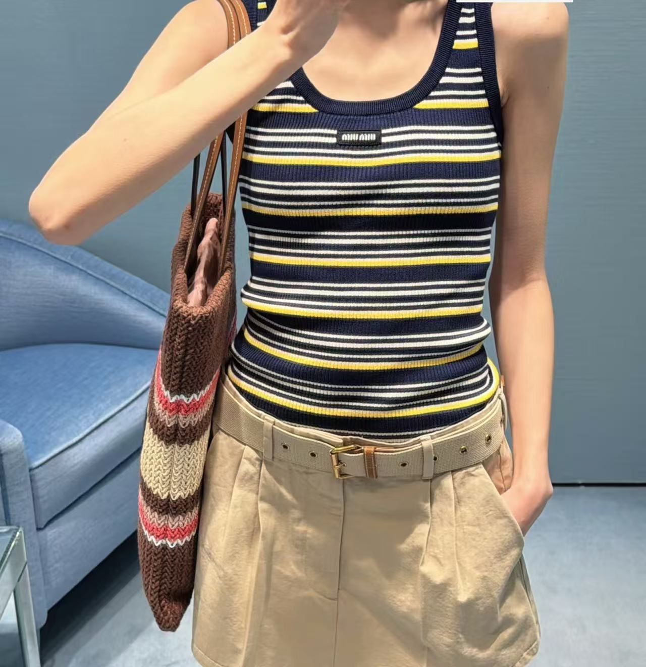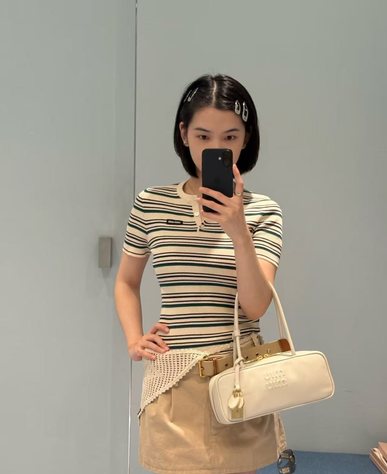 側邊點綴的編織腰帶融合了撞色皮革細節,展現出 Miu Miu 標誌性的異材質拼接美學,細節處體現出極強的辨識度。