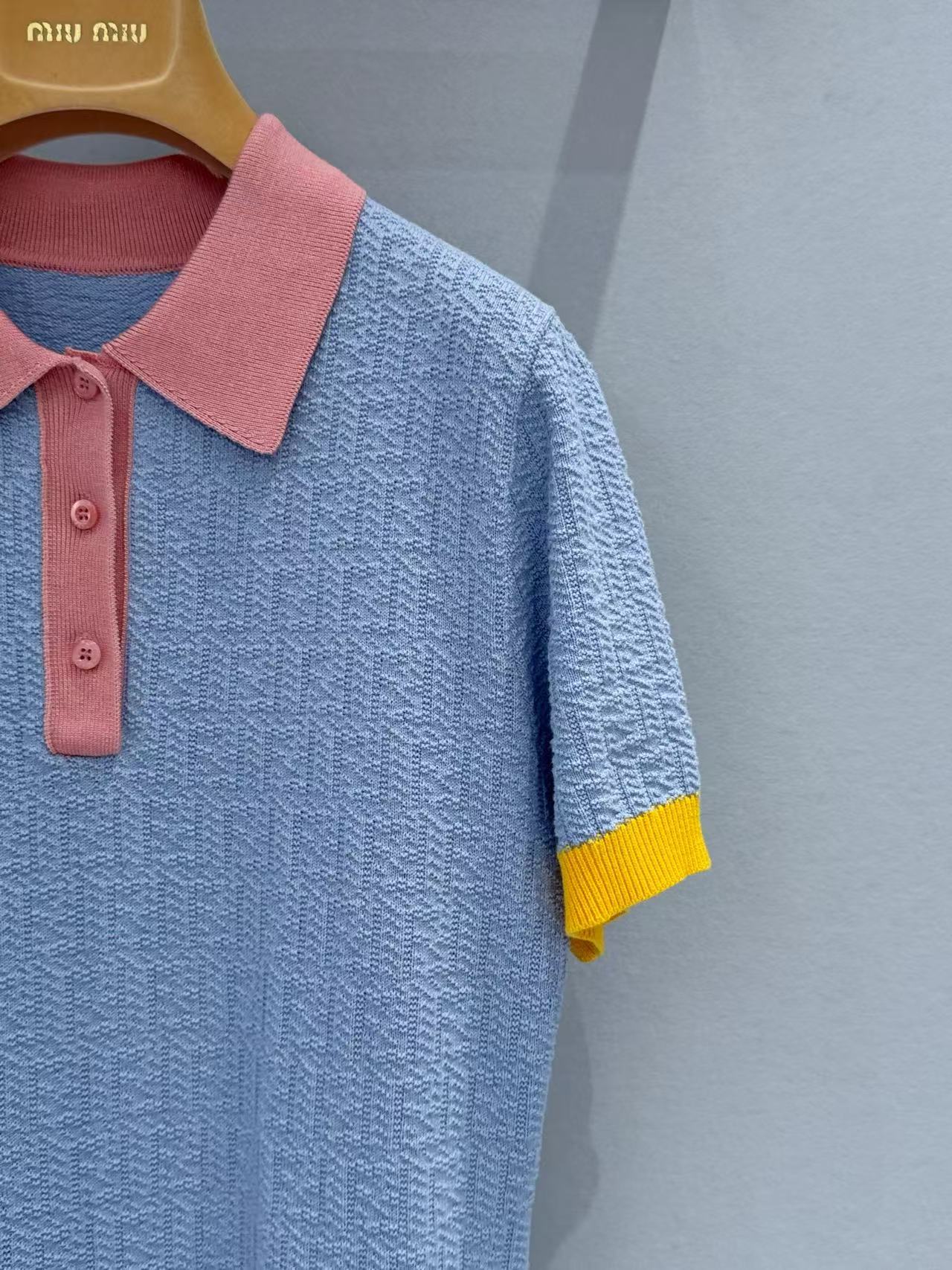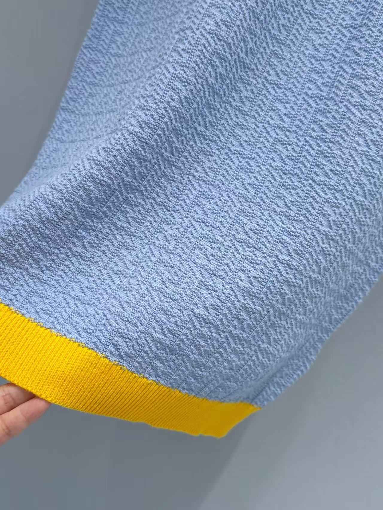 極致美學的撞色包邊處理: 領口的櫻花粉與袖口、下擺的亮黃色均採用了高密度定染羅紋,色牢度極高。