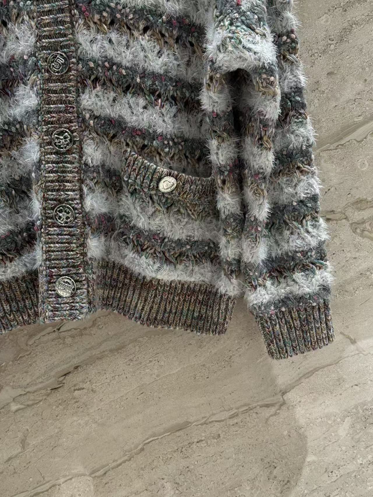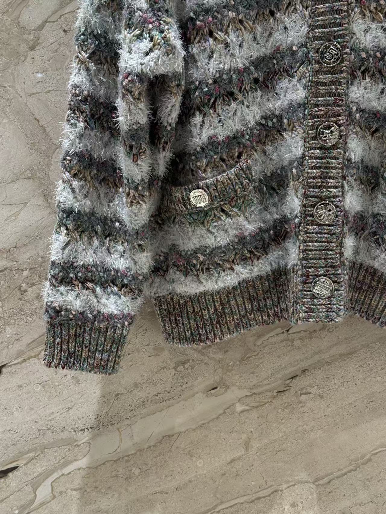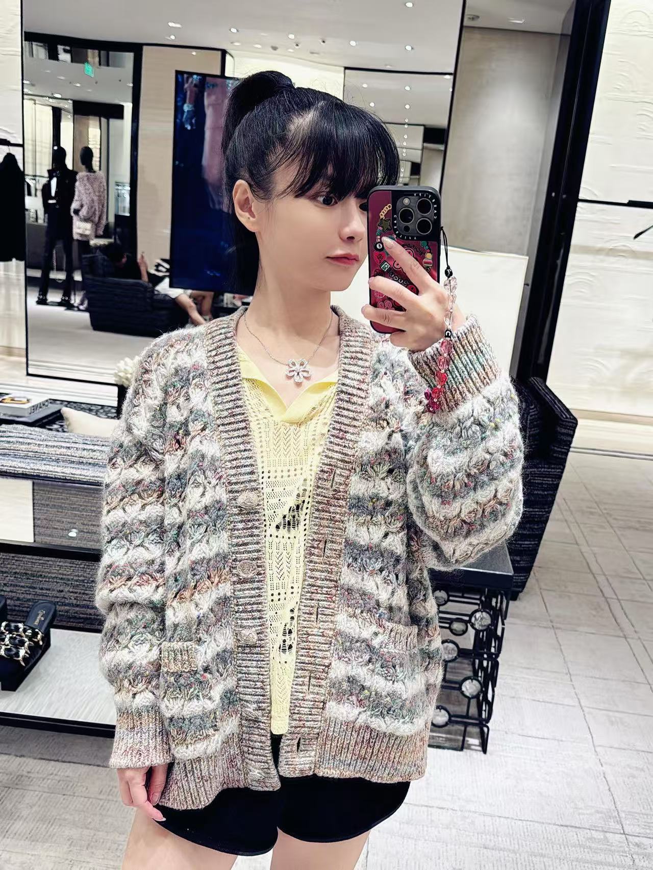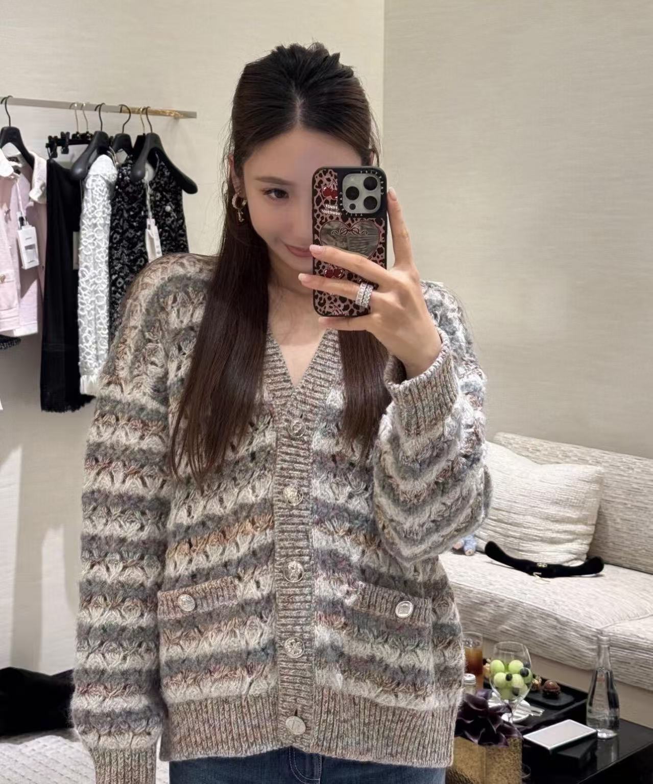 材質是羊絨混紡,摸起來超級軟糯細緻,輕盈又保暖,完全是秋冬出門不會冷、室內也不會熱的那種完美平衡!整體版型是微落肩的慵懶感,扣子是經典雙C金屬扣,細節滿分。