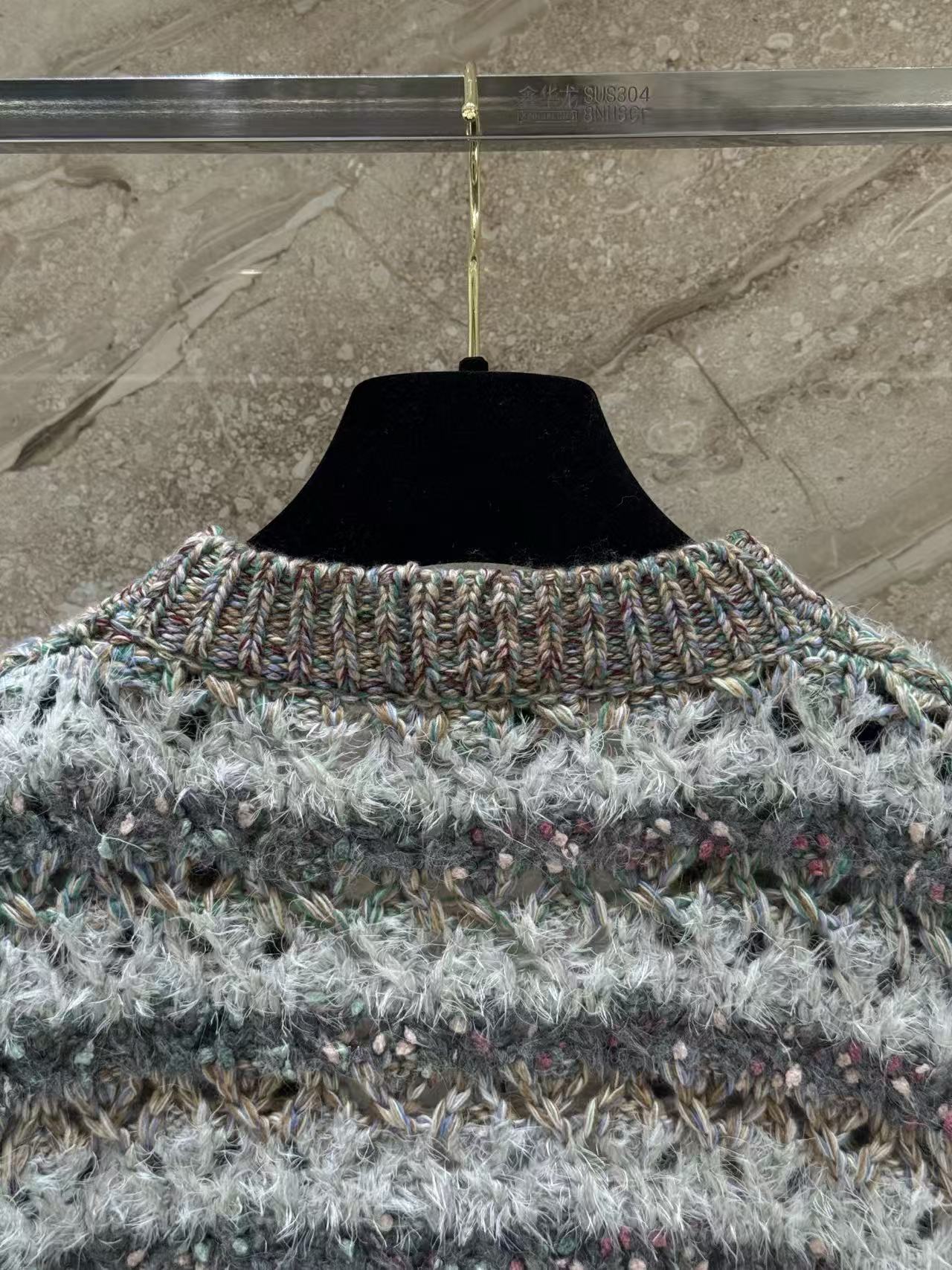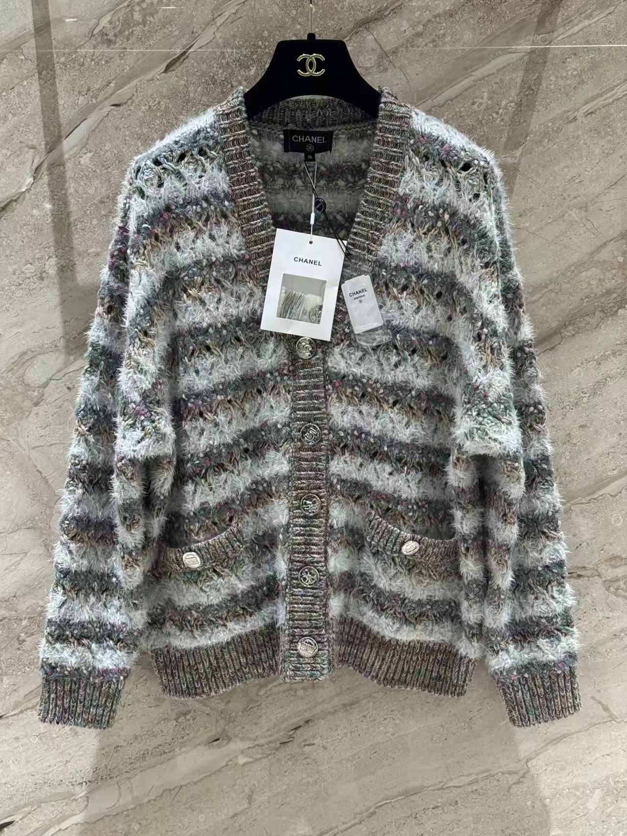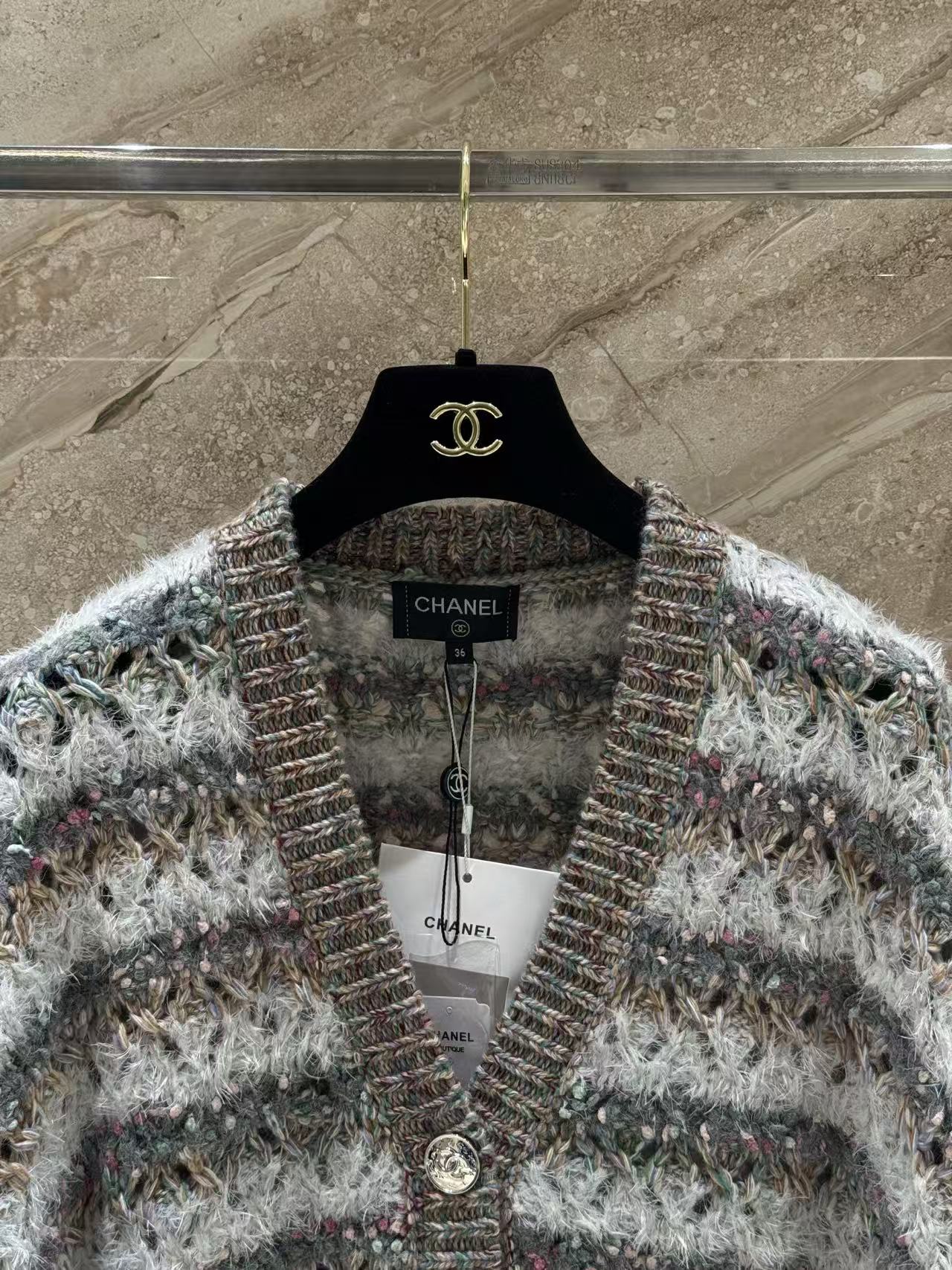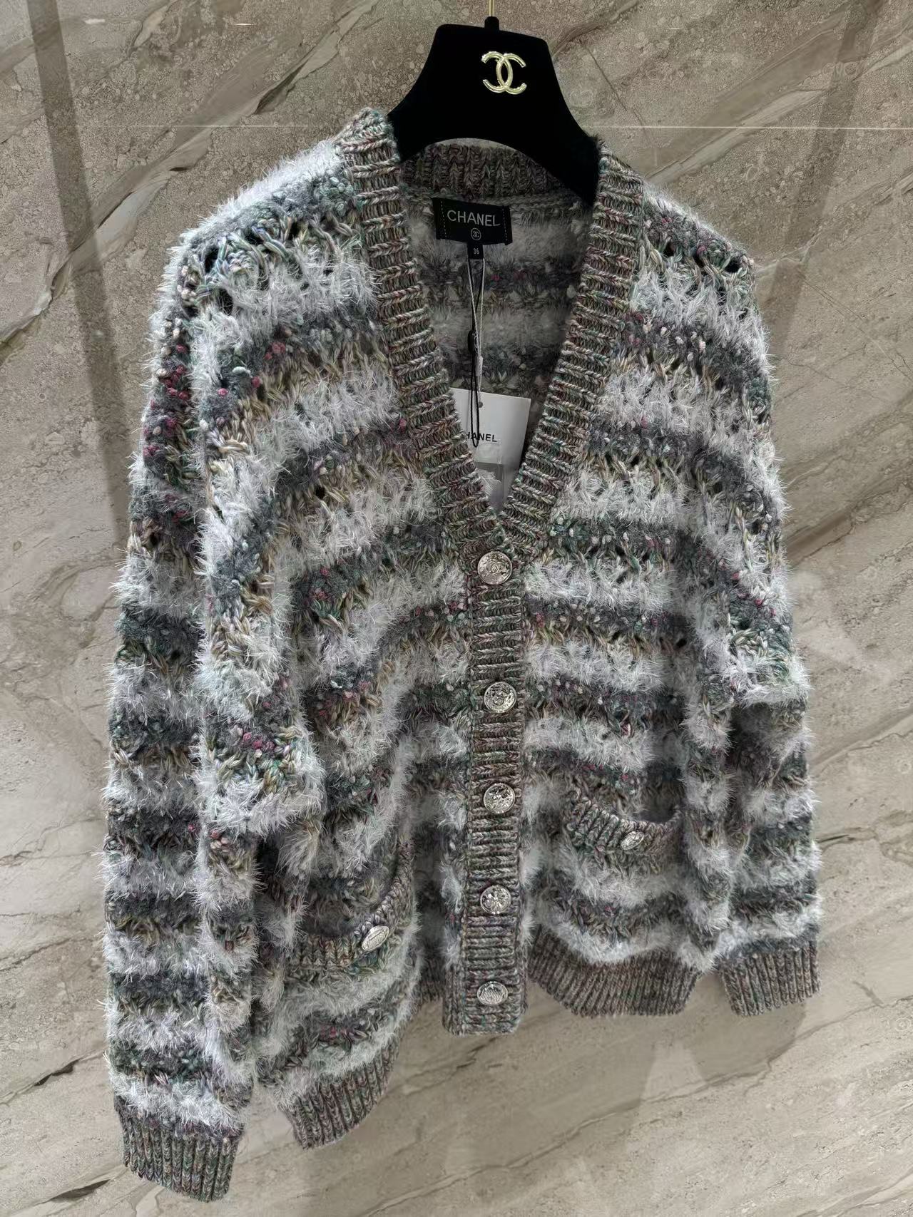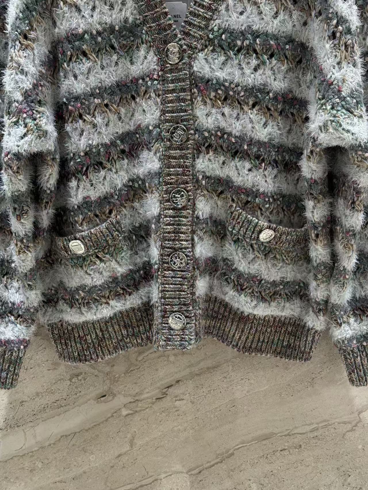 材質是羊絨混紡,摸起來超級軟糯細緻,輕盈又保暖,完全是秋冬出門不會冷、室內也不會熱的那種完美平衡!整體版型是微落肩的慵懶感,扣子是經典雙C金屬扣,細節滿分。