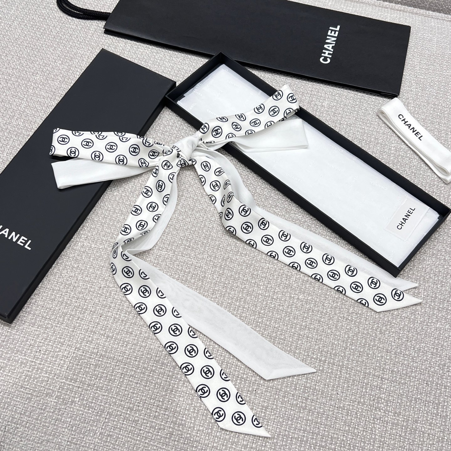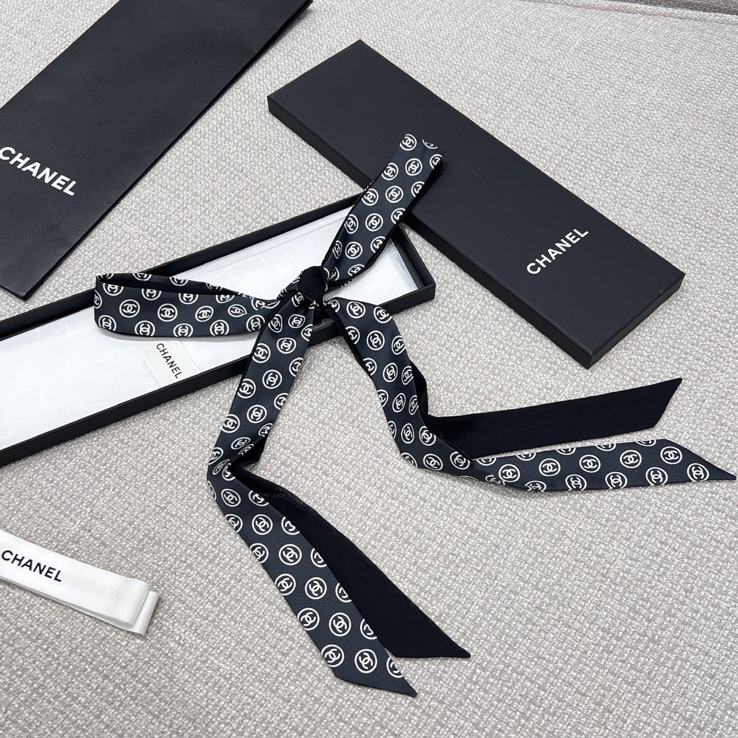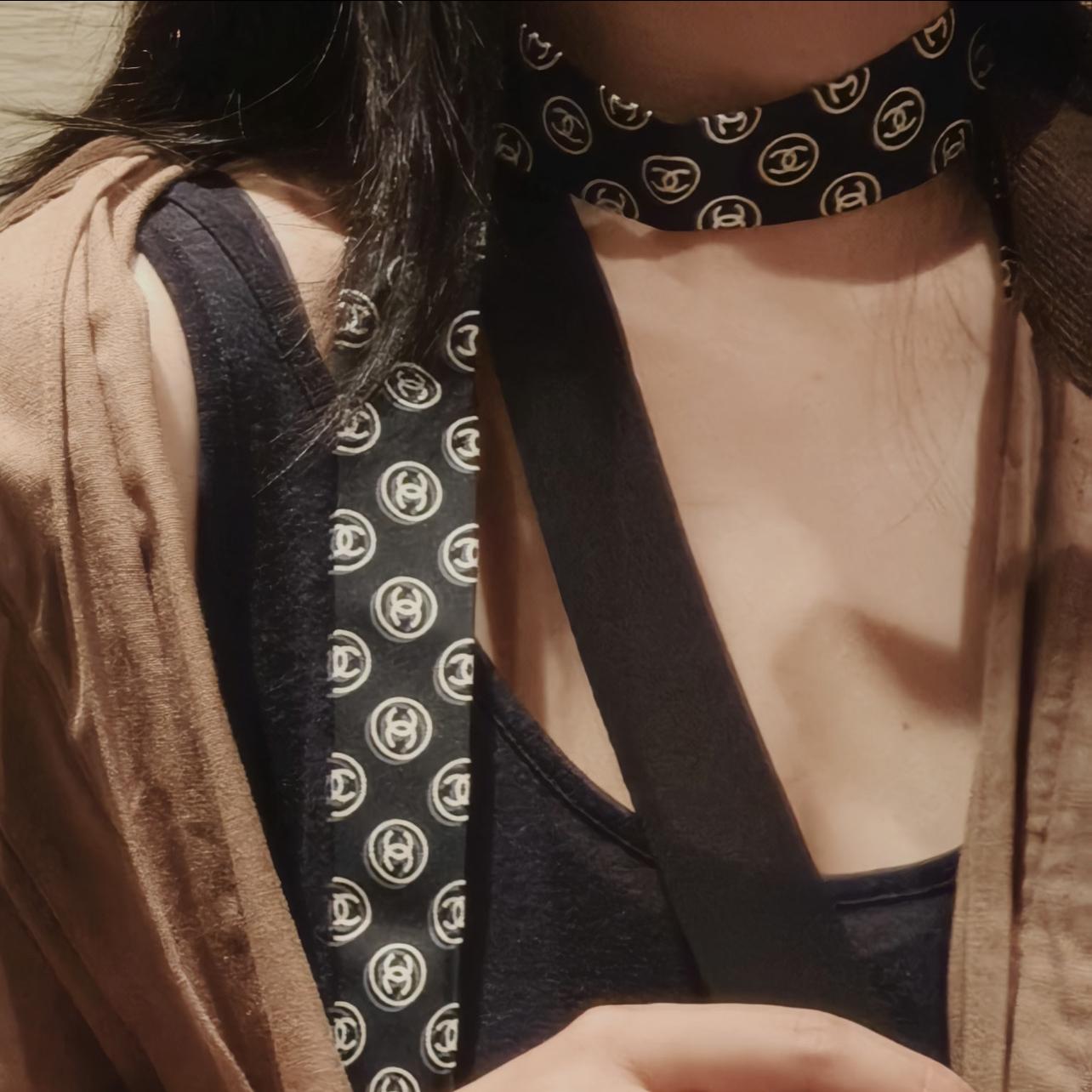 這款蝴蝶結長絲帶一看就很有記憶點,經典雙C Logo搭配細長版型,隨著走動自然擺動,讓整體造型多了點靈動感。