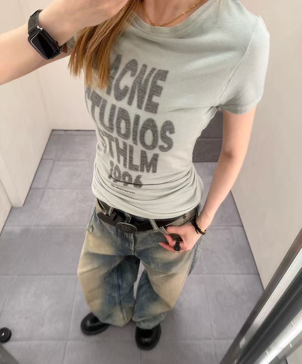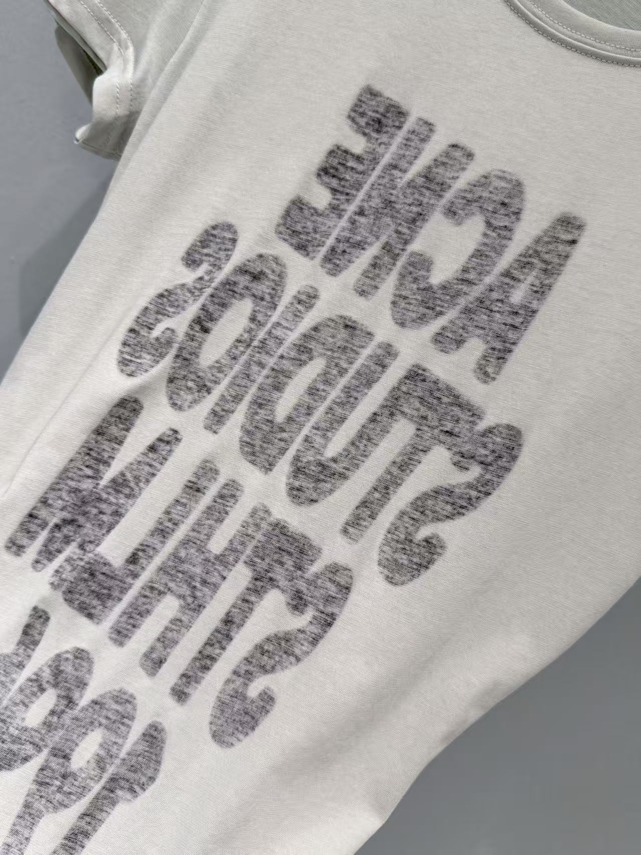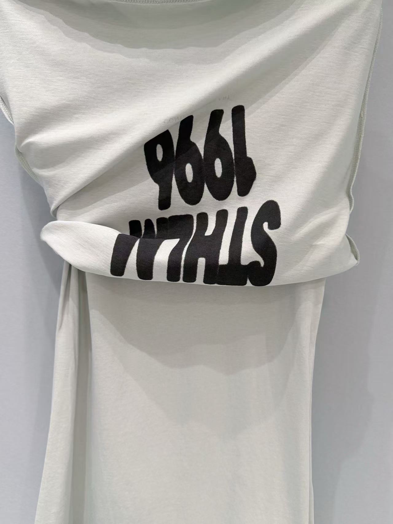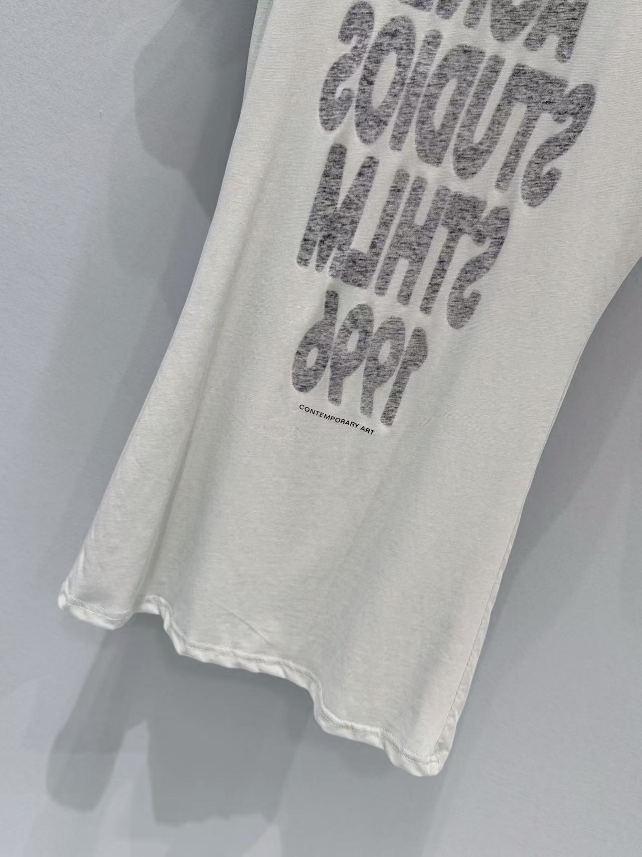 重工級做舊印花技術: 胸前的垂直印花採用了特殊做舊工藝,字跡帶著 90 年代的藝術斑駁感。