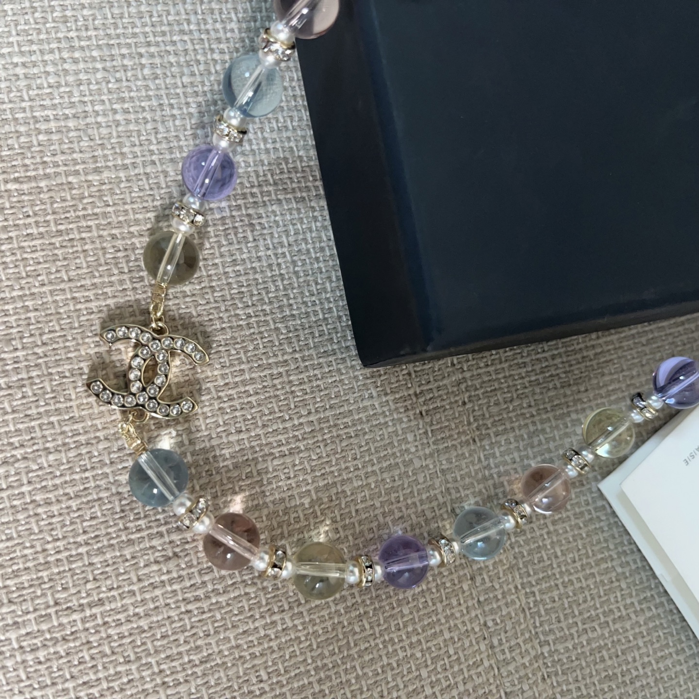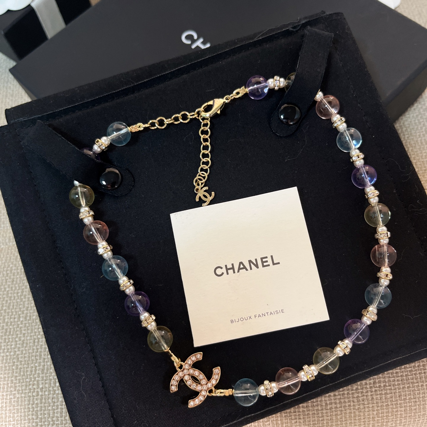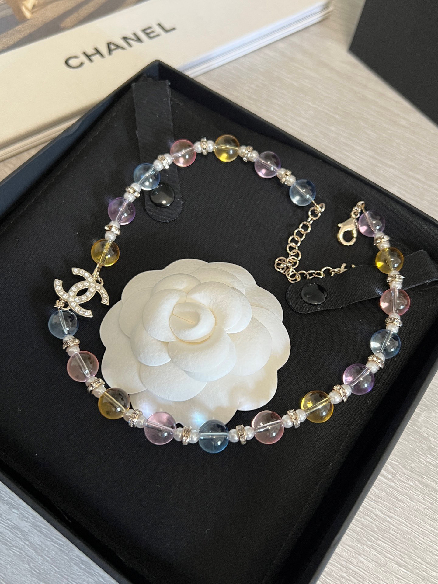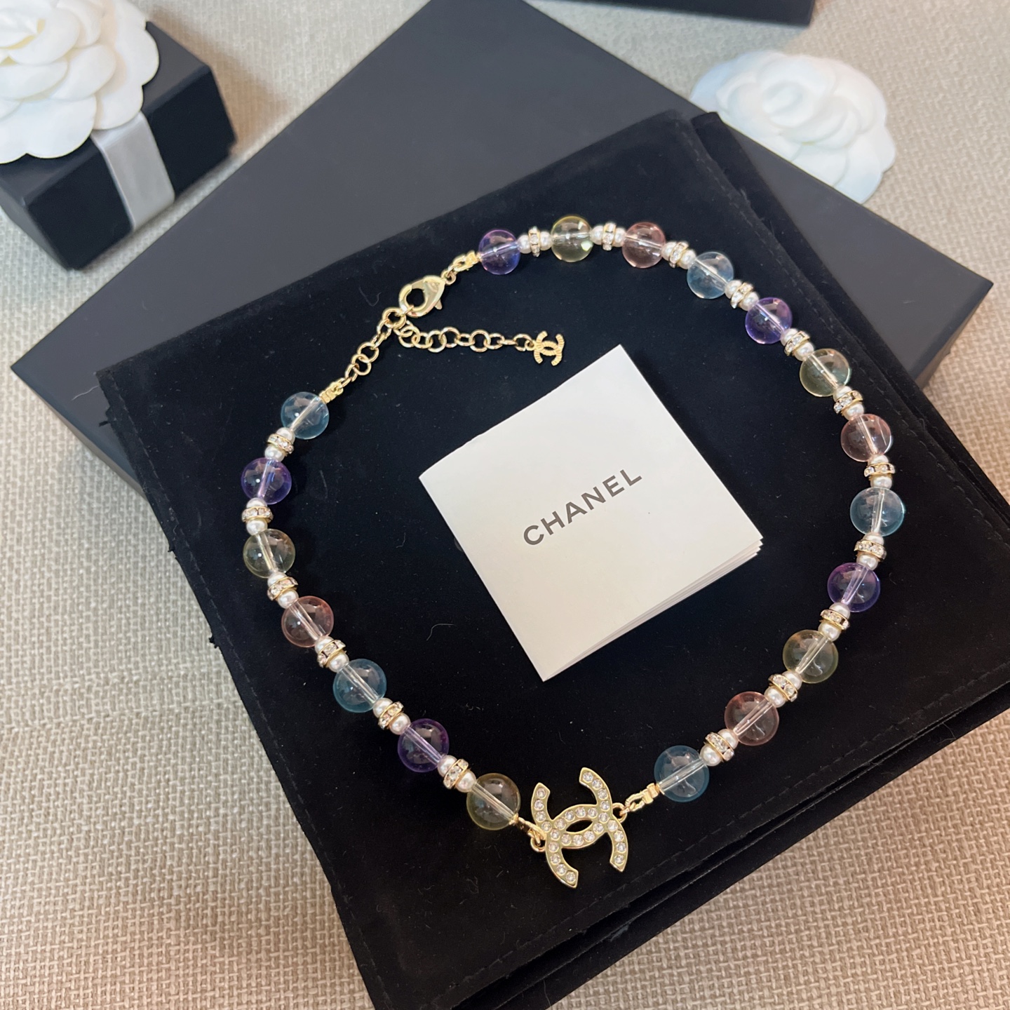 整體設計以彩色水晶珠為主軸,搭配滿鑽雙C標誌,呈現出細膩又靈動的視覺效果,戴上瞬間讓整體造型多了一份精緻與層次感。