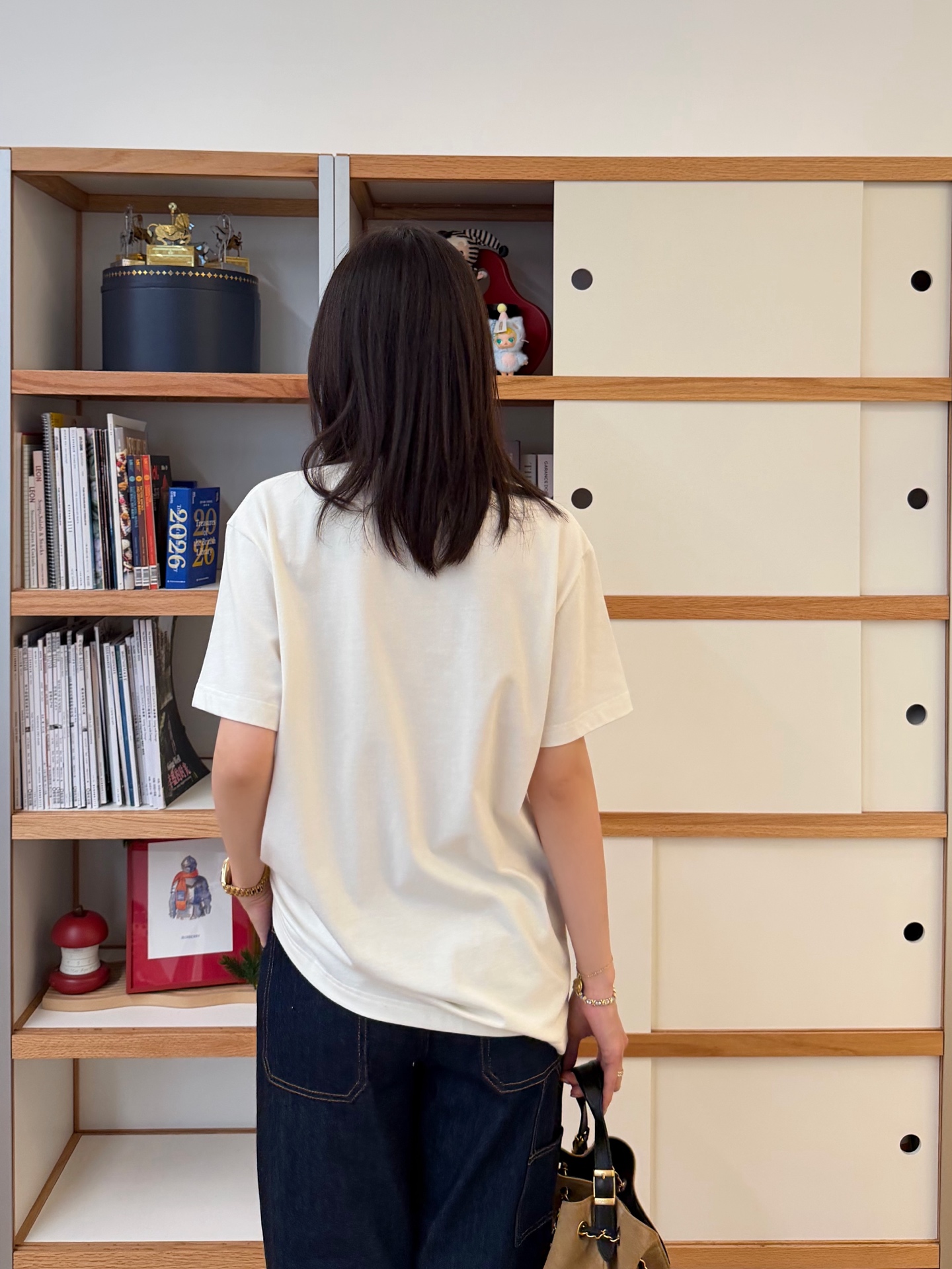 這件T恤真的很可以,是那種看似簡單、實際細節滿滿的寶藏款。第一眼會被它乾淨的米白色吸引,但真正讓人愛上的,是胸前那一塊精緻到不行的刺繡設計。