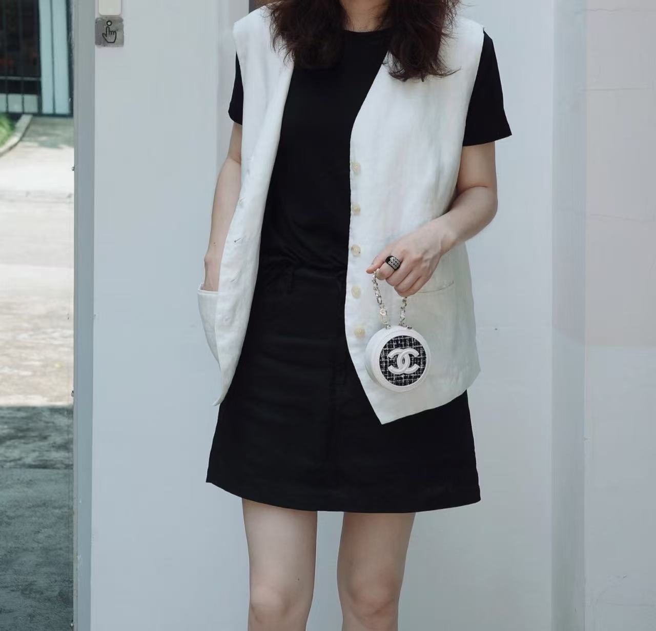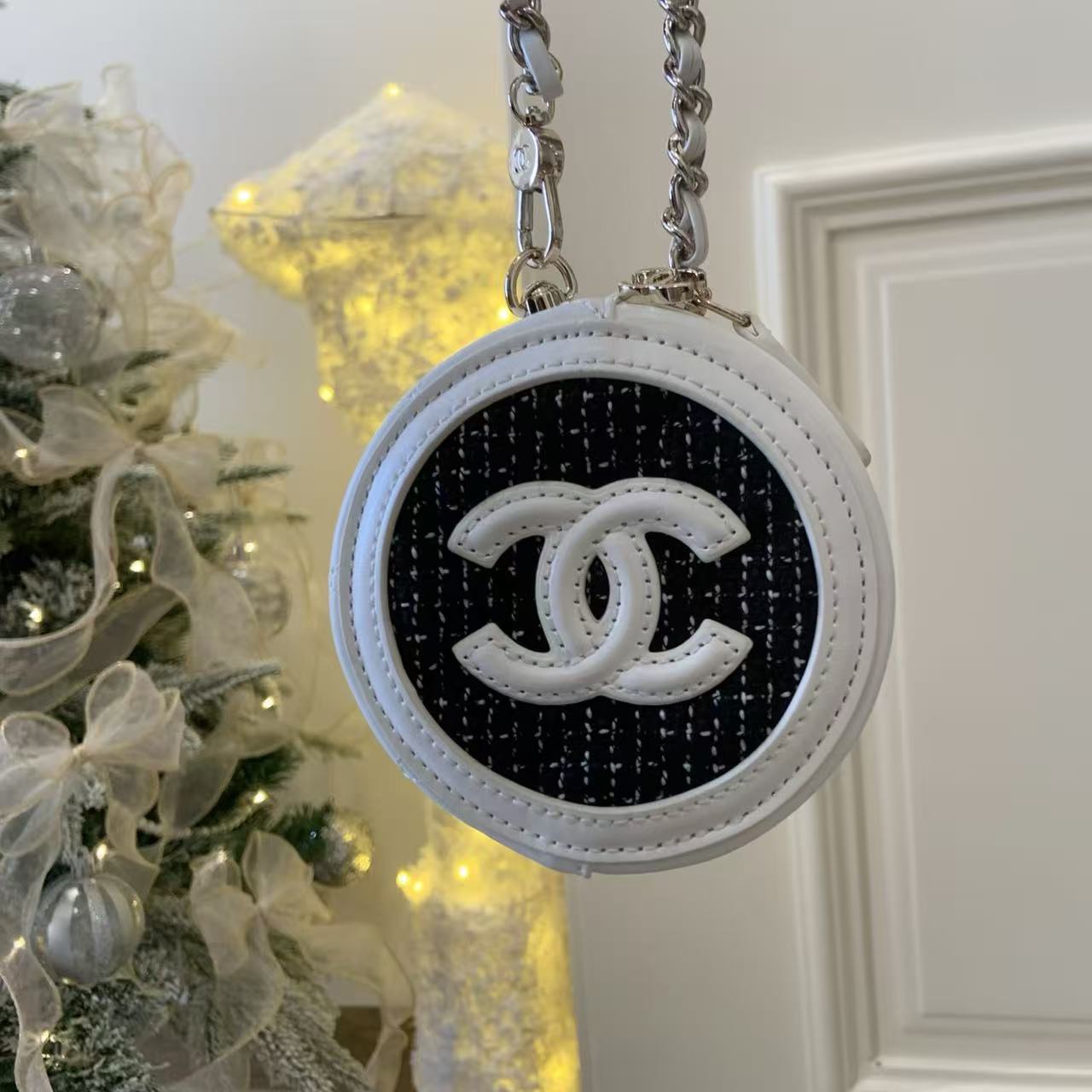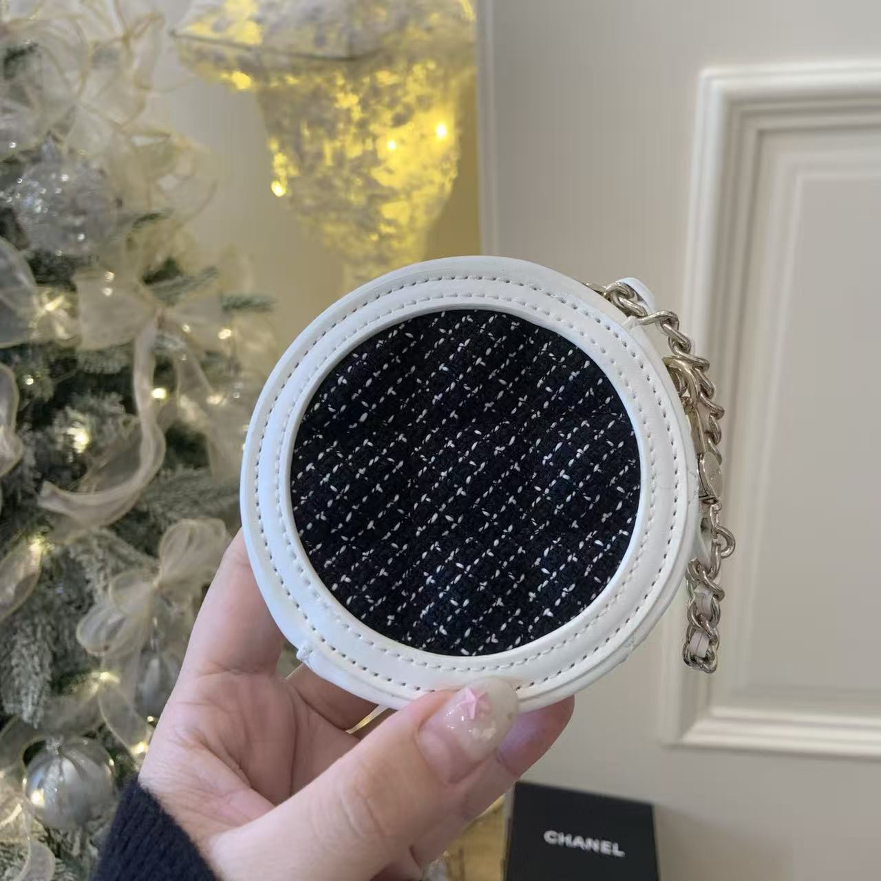 材質拼接: 採用白色皮革搭配黑色粗花呢進行拼接,這種異材質組合讓小圓餅充滿了精緻感和層次感。