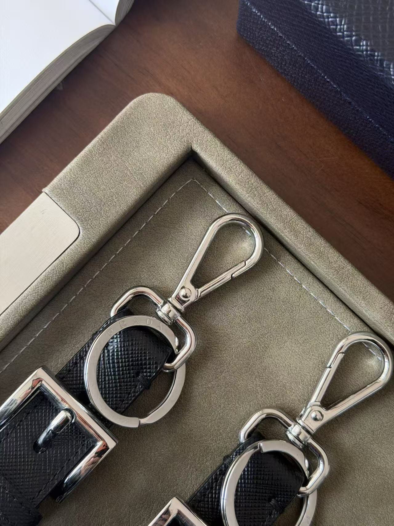建築感冷冽五金配件: 選用高純度金屬打造環扣,色澤飽和且線條俐落,展現 Prada 一貫的現代都會美學。
