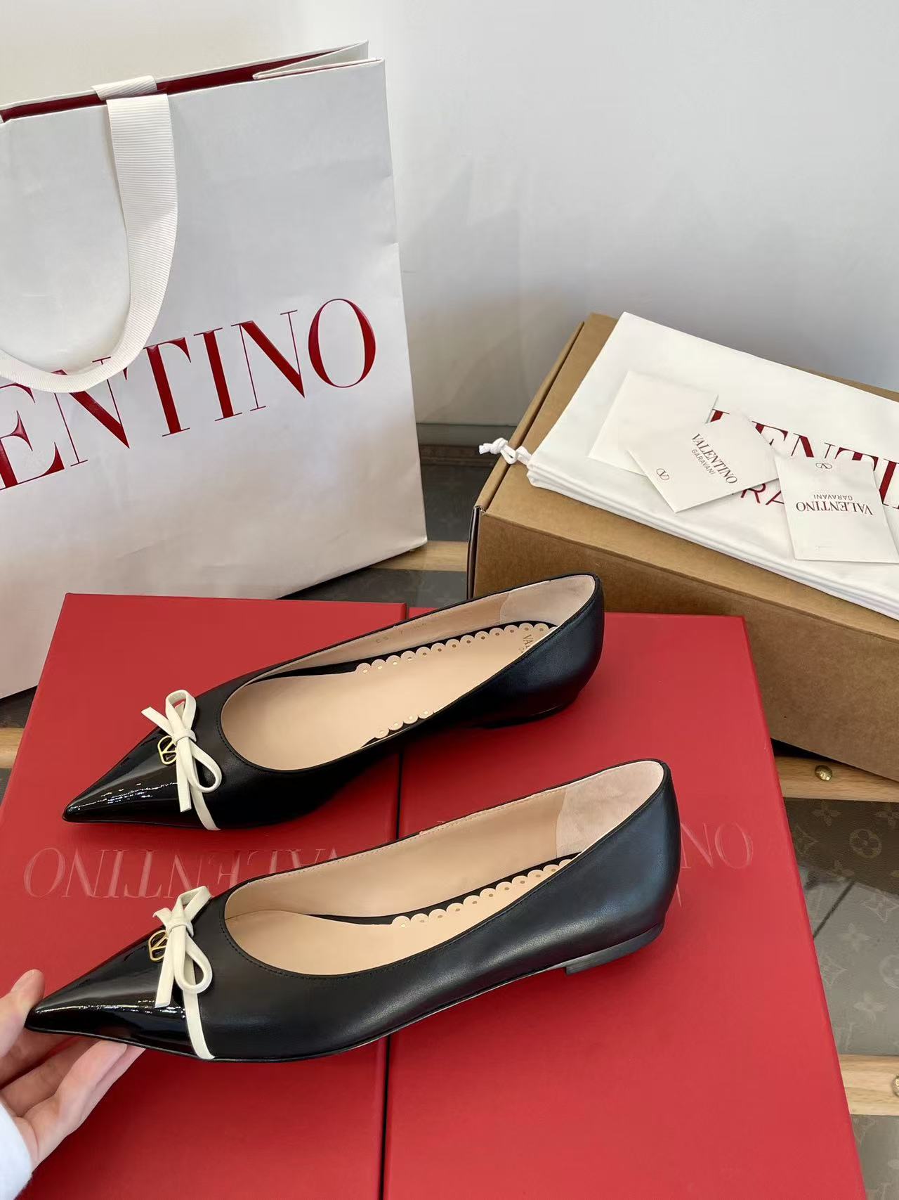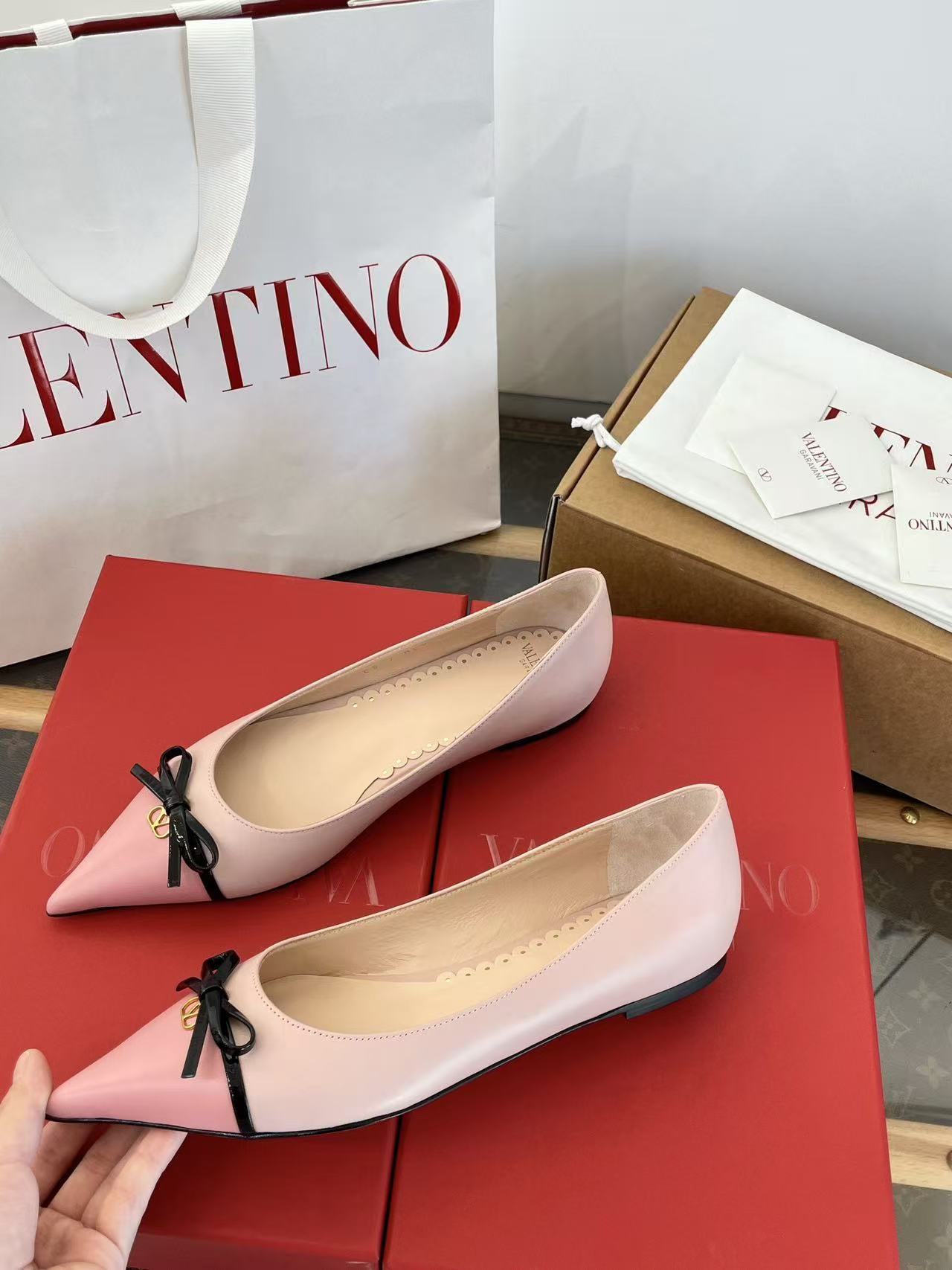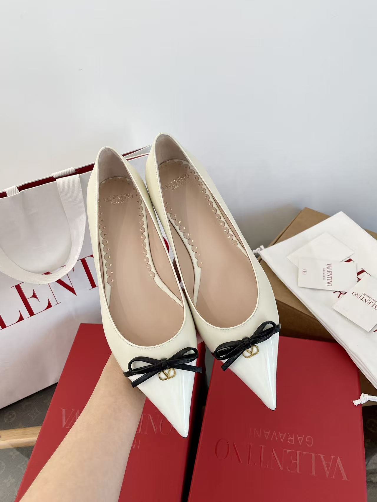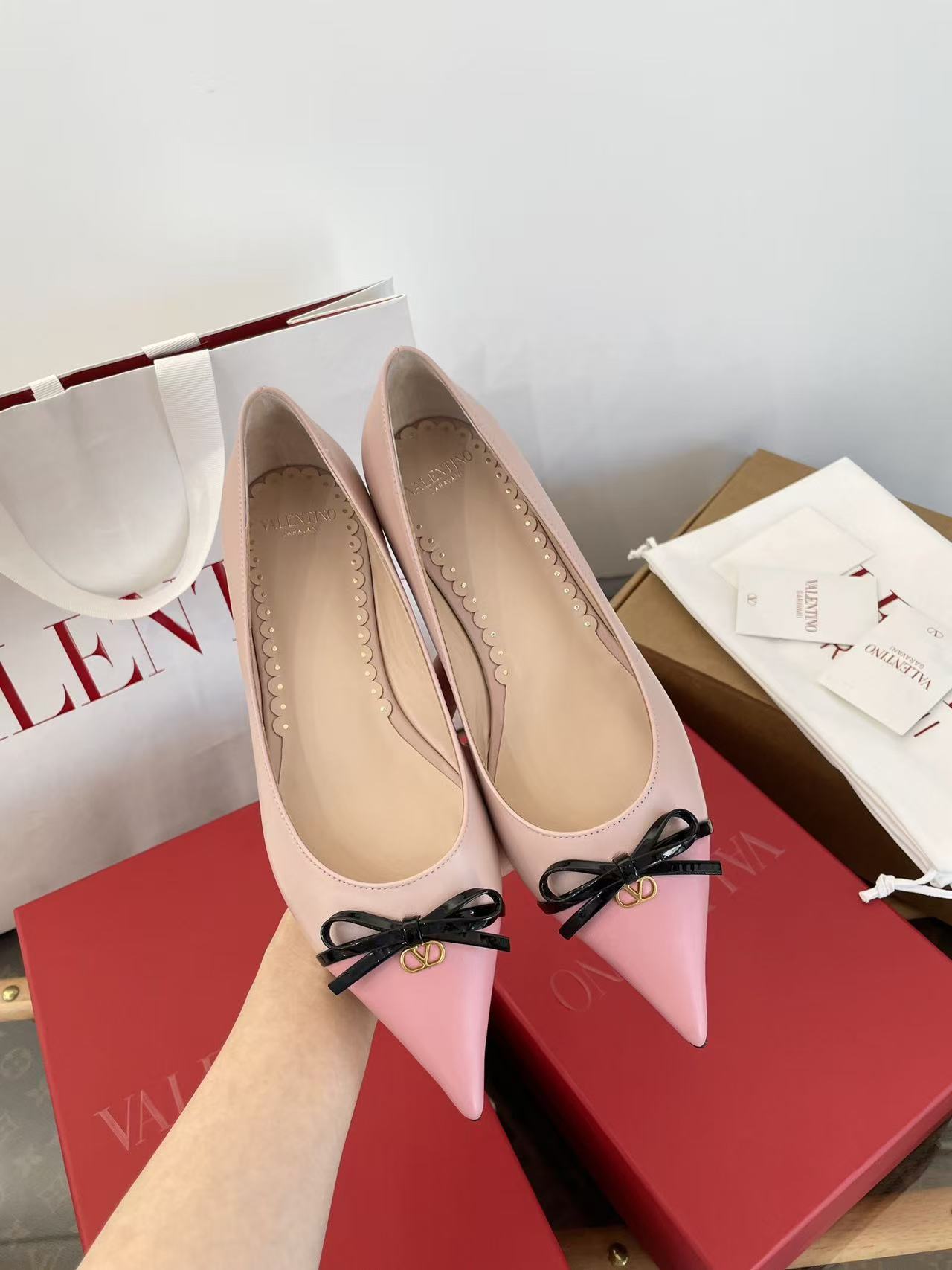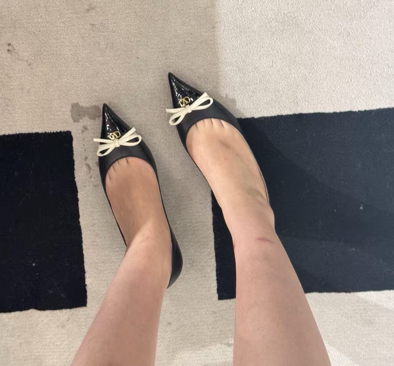 2025秋冬新品 V家 拼色蝴蝶結尖頭平底鞋