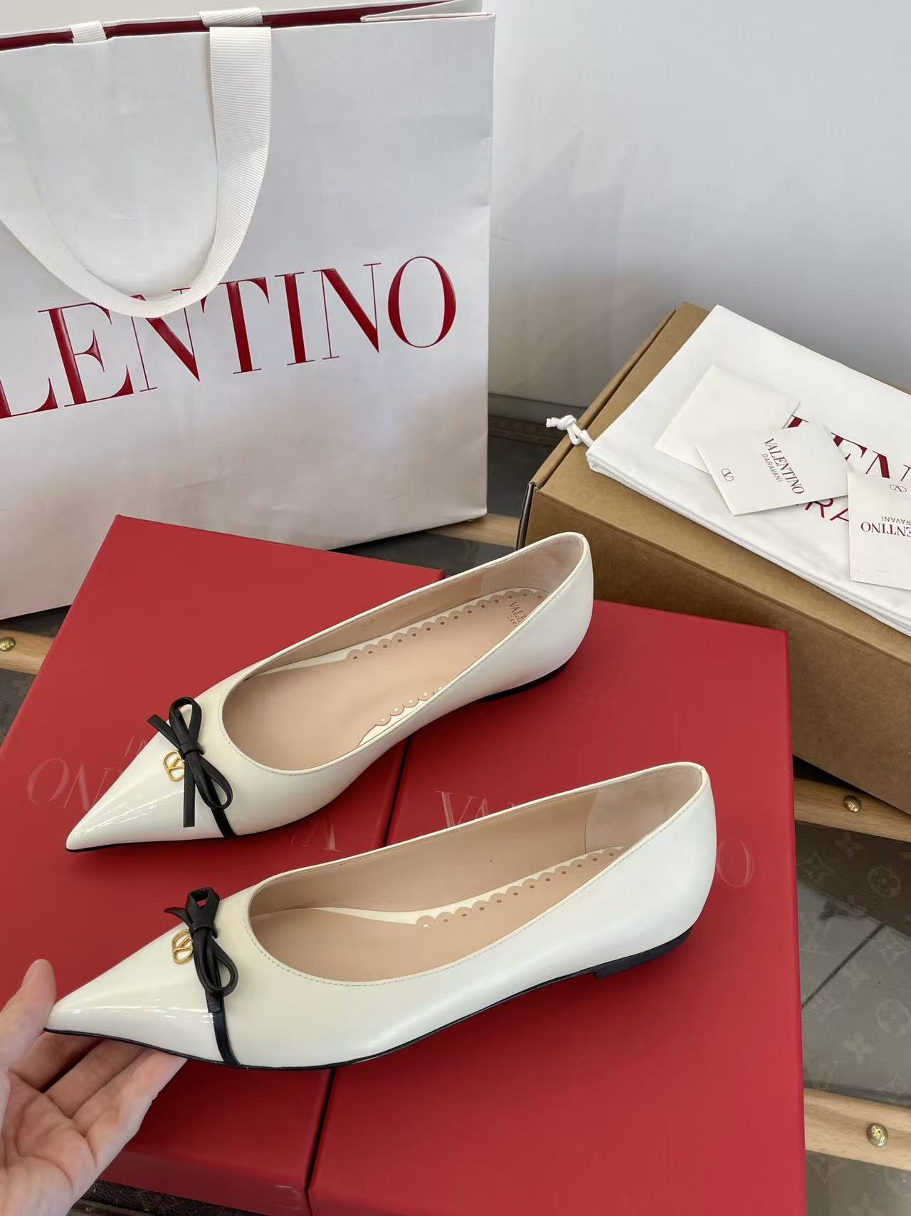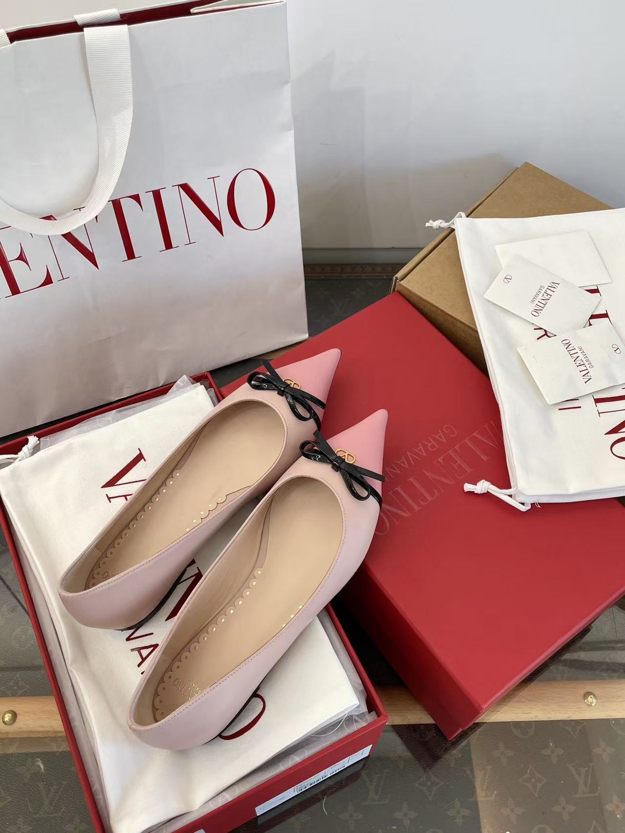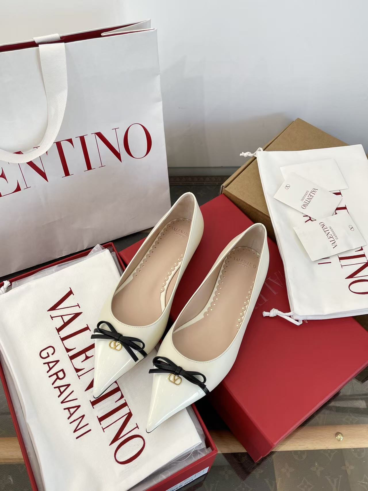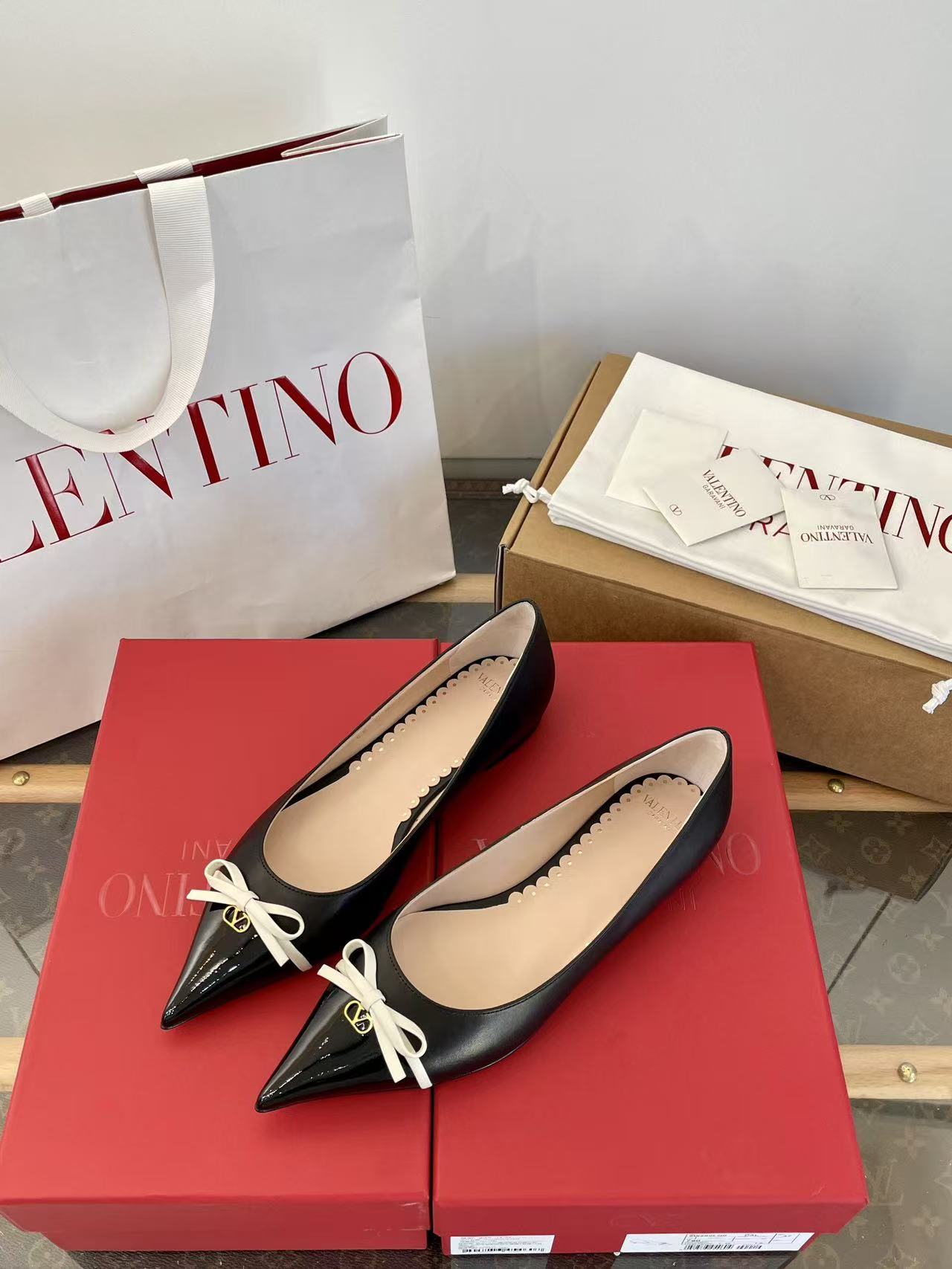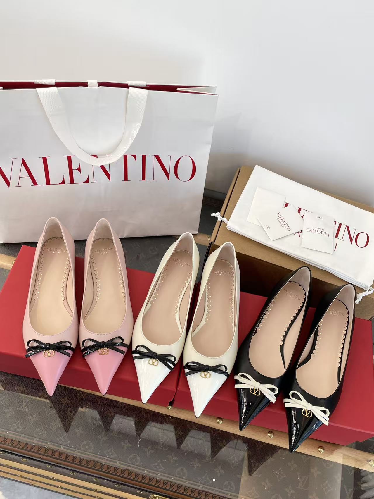 2025秋冬新品 V家 拼色蝴蝶結尖頭平底鞋