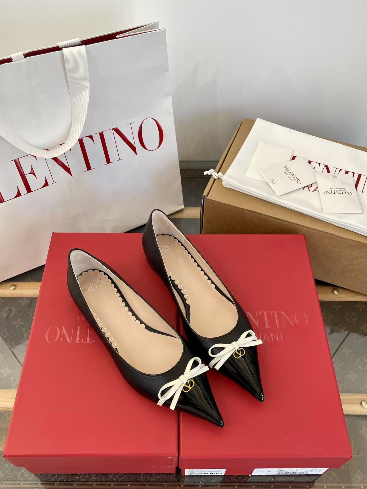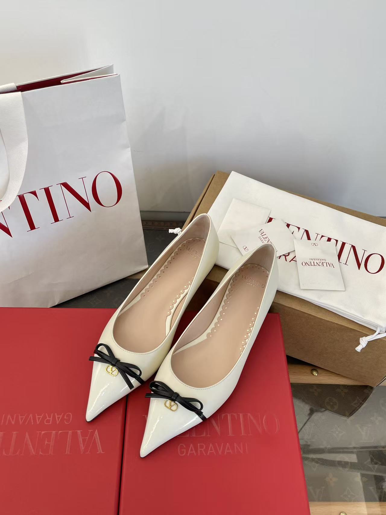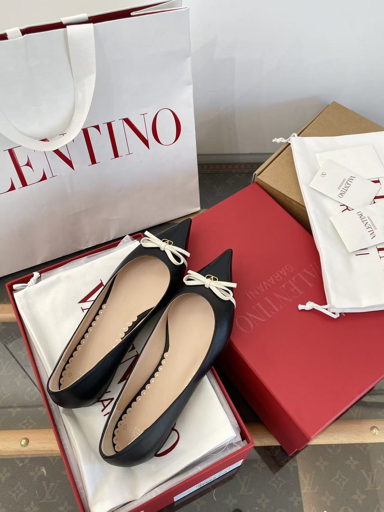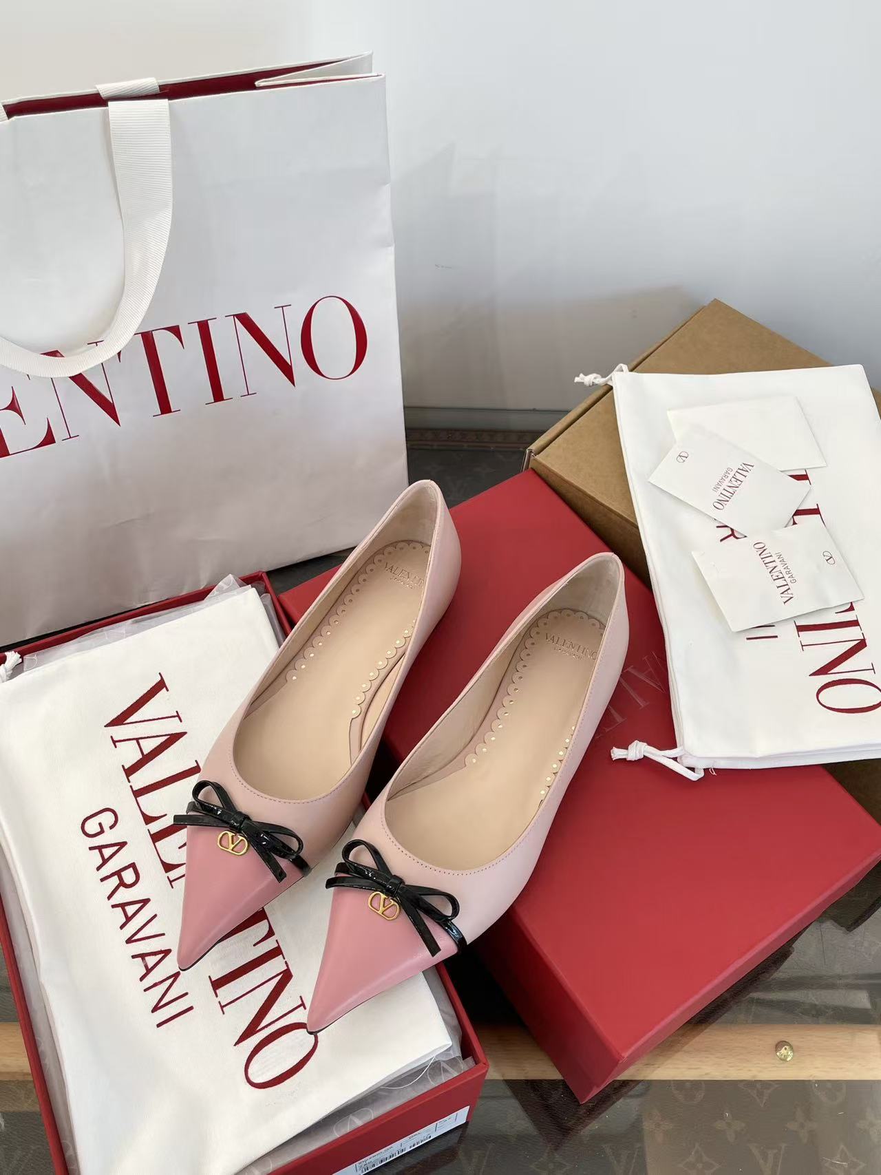 2025秋冬新品 V家 拼色蝴蝶結尖頭平底鞋