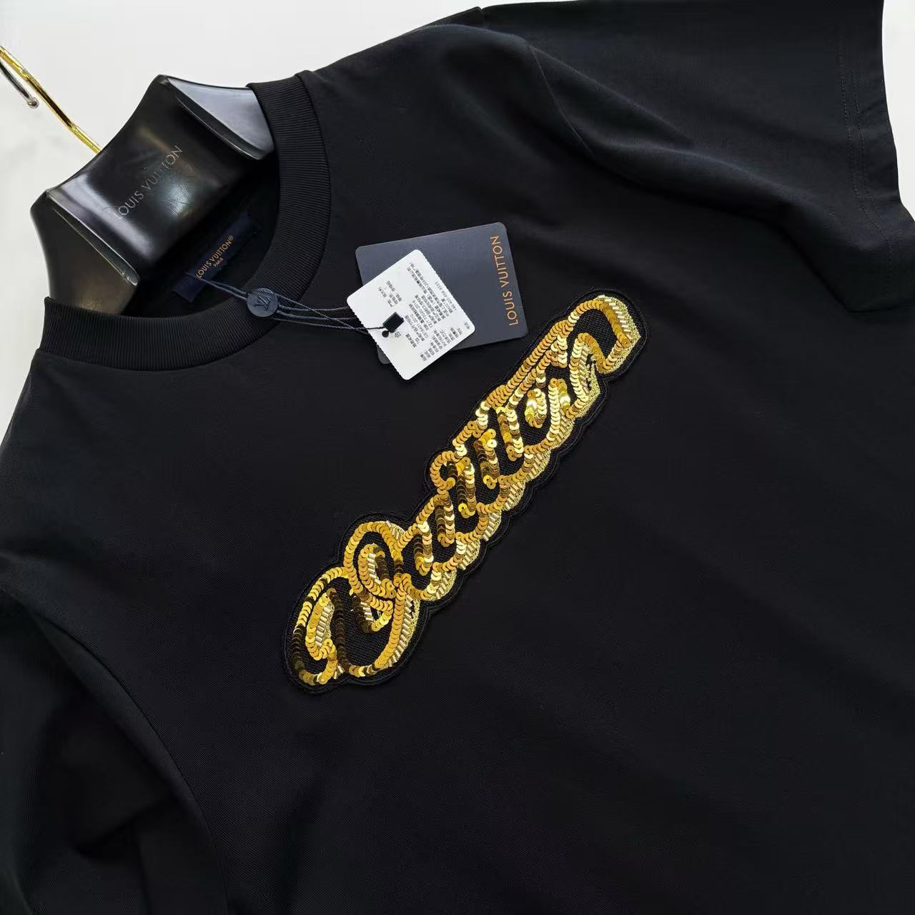 這款短袖最迷人之處在於其雙面視覺的層次感。正面以極致精密的亮片刺繡勾勒品牌標識,在不同光線下閃爍著細緻的光澤;背部則更進一步,採用了工序繁瑣的珠飾珠片繡章技術,將細小的珠粒與片材立體堆疊,營造出如同裝置藝術般的浮雕質感。