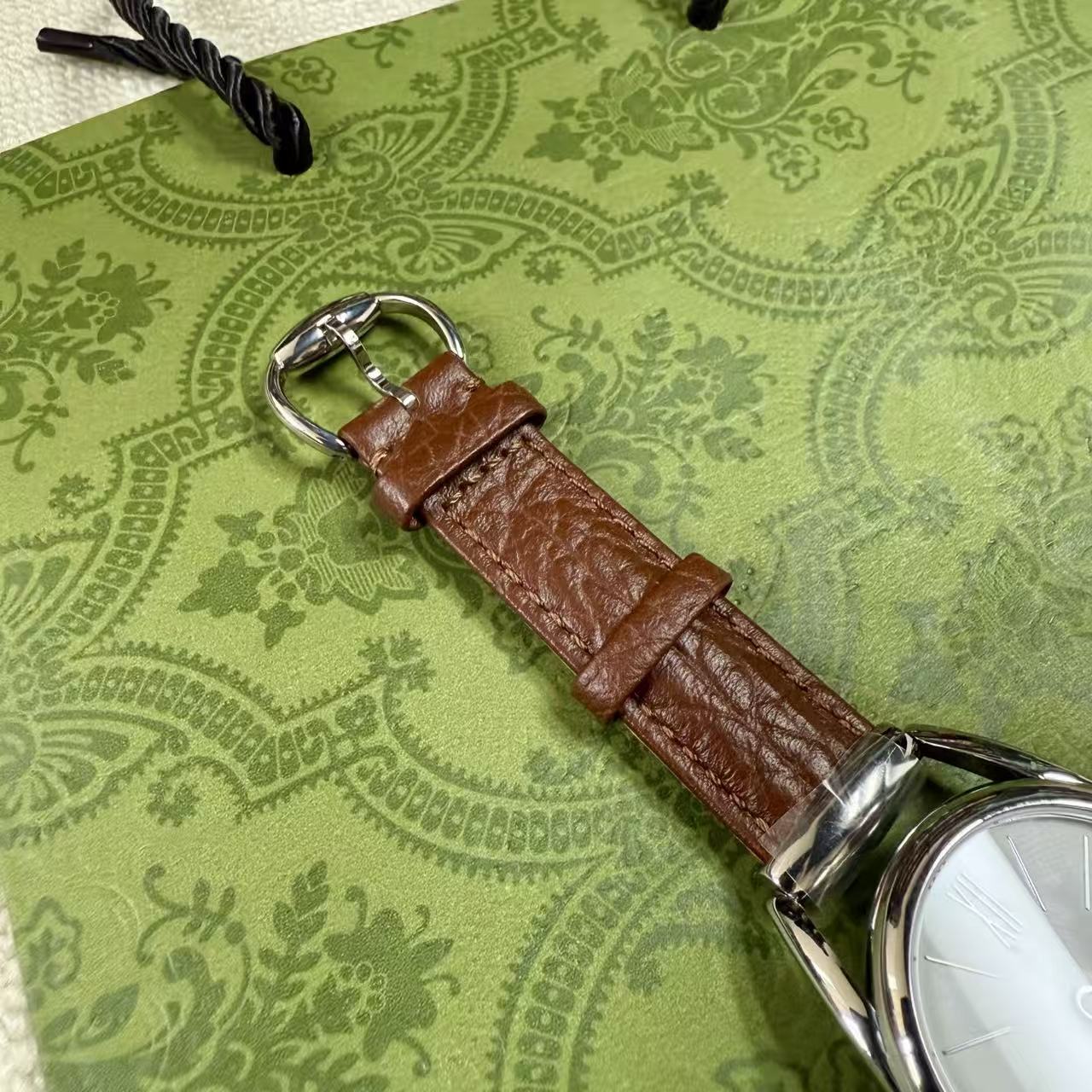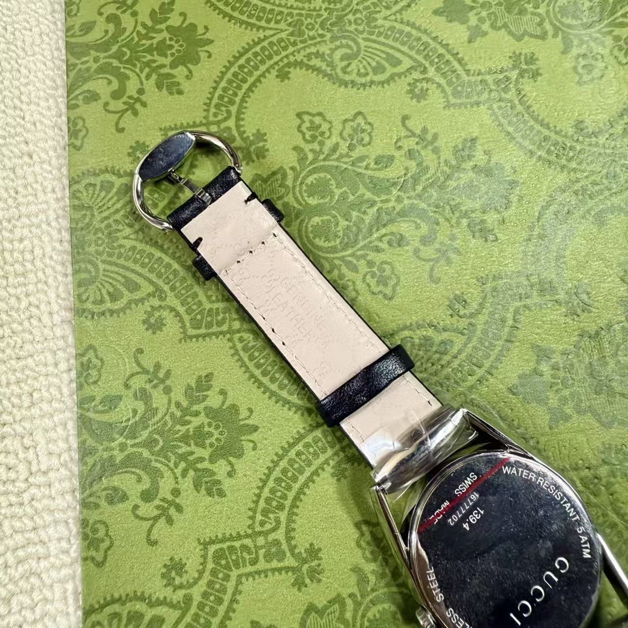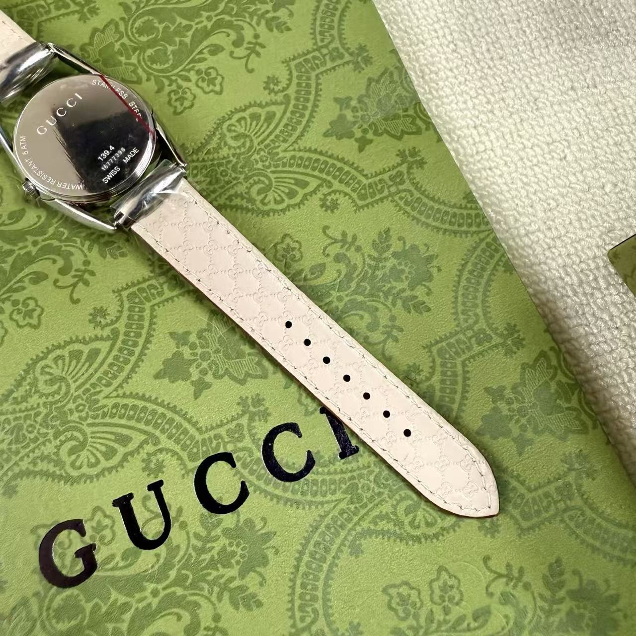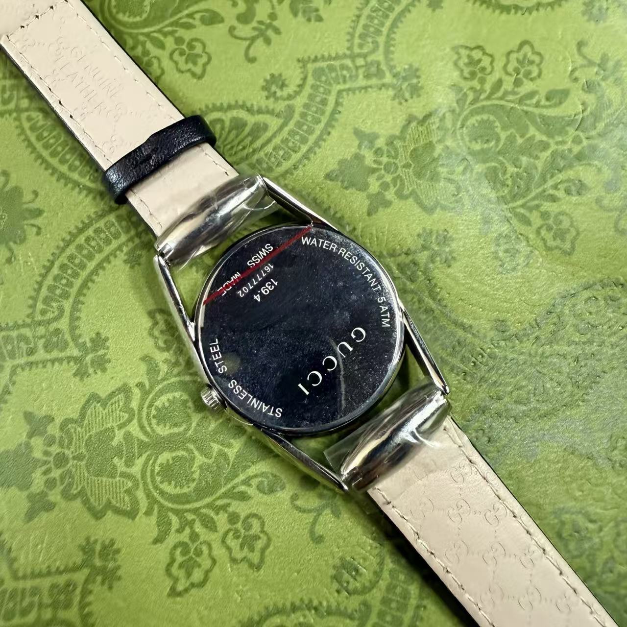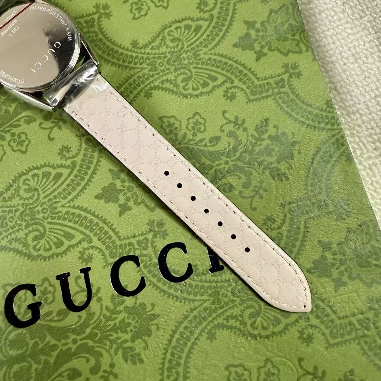 錶帶壓紋: 小牛皮錶帶底部藏有品牌標誌性的壓紋圖案,從內到外,無一不透露著精品應有的精緻感。