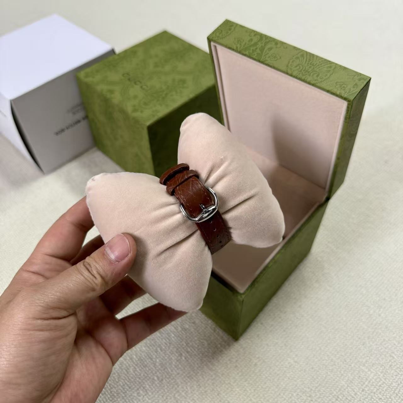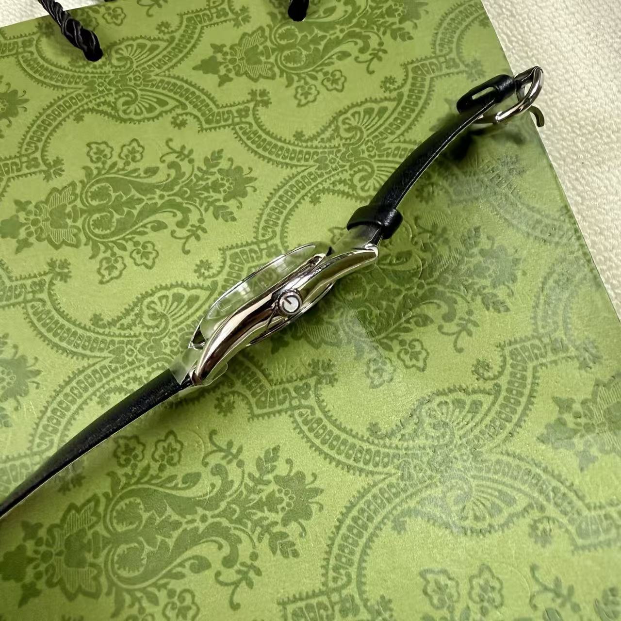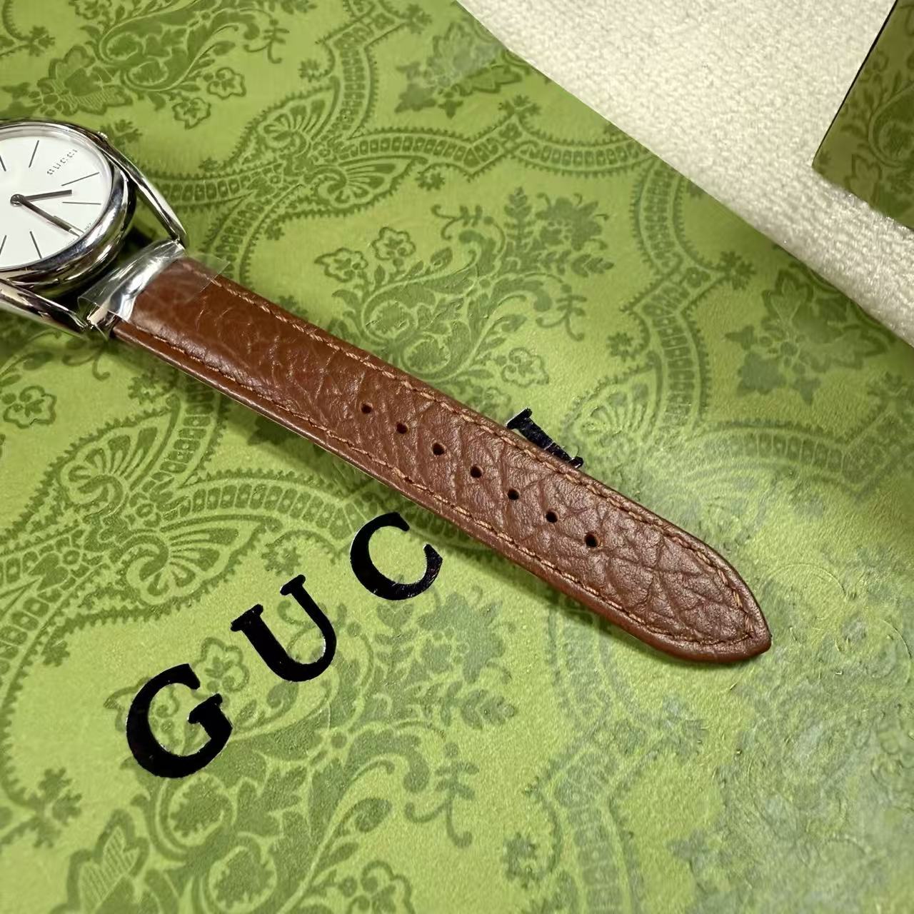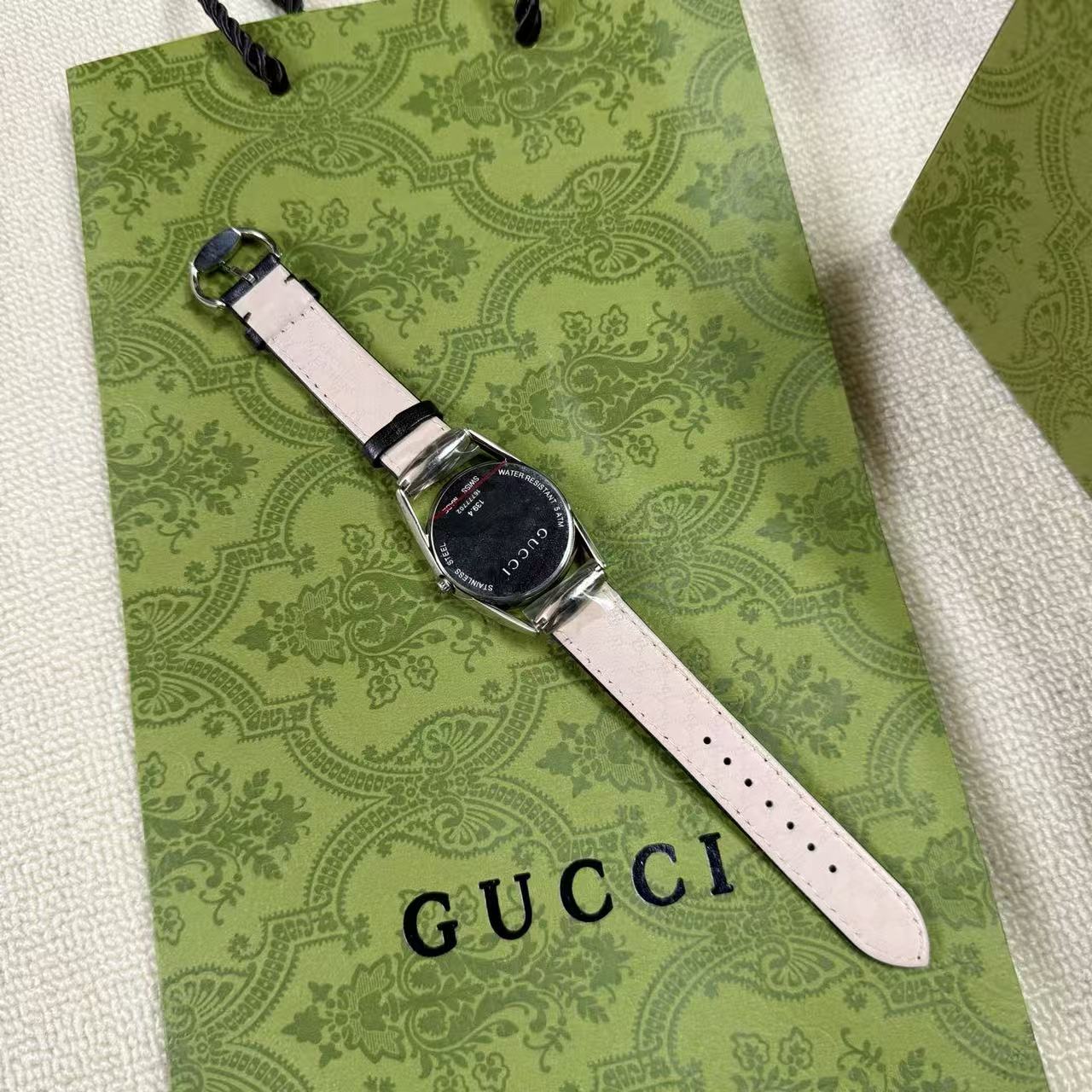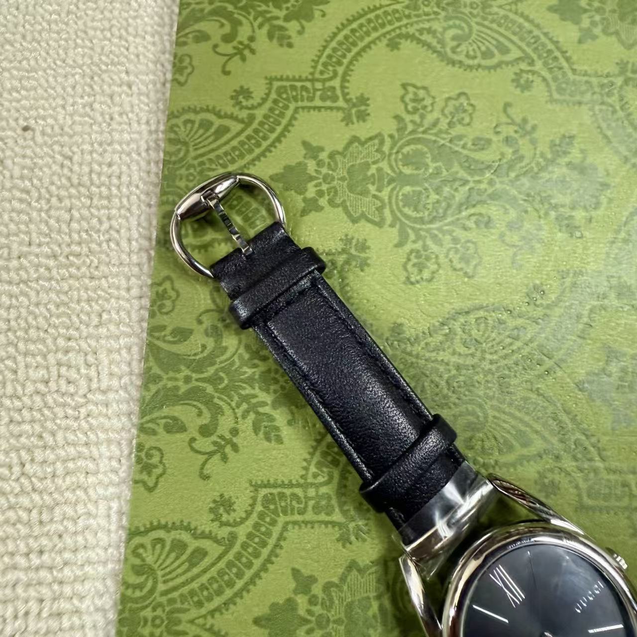 錶帶壓紋: 小牛皮錶帶底部藏有品牌標誌性的壓紋圖案,從內到外,無一不透露著精品應有的精緻感。