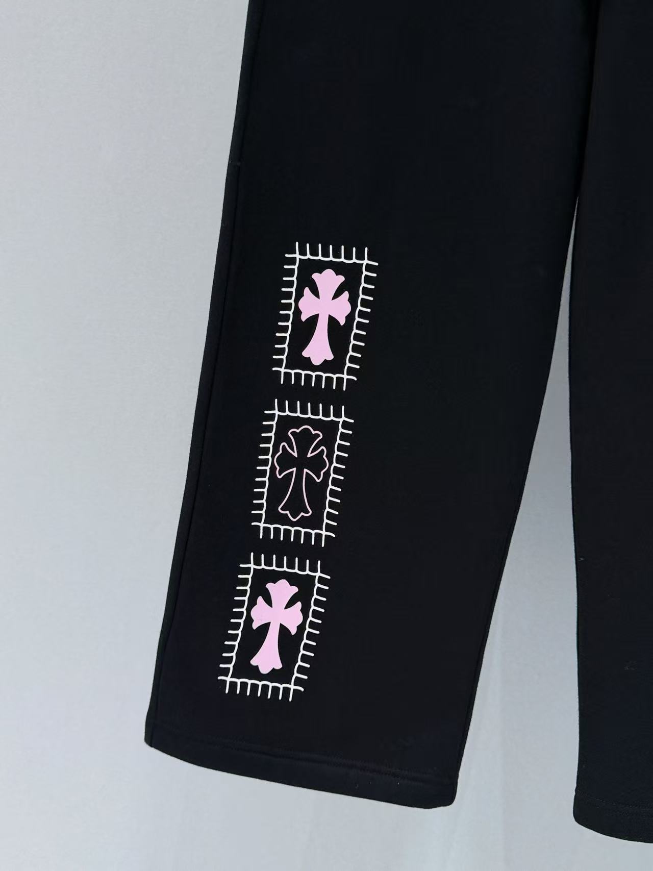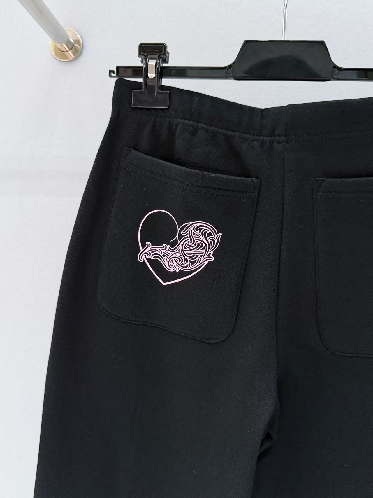 黑色運動版型隨性又俐落,整件褲子的靈魂就在於側邊與後方的十字架結合美少女圖案,黑色布料襯托出最吸睛的櫻花粉熱固油印花,這組對色真的非常精準,視覺衝擊力十足。