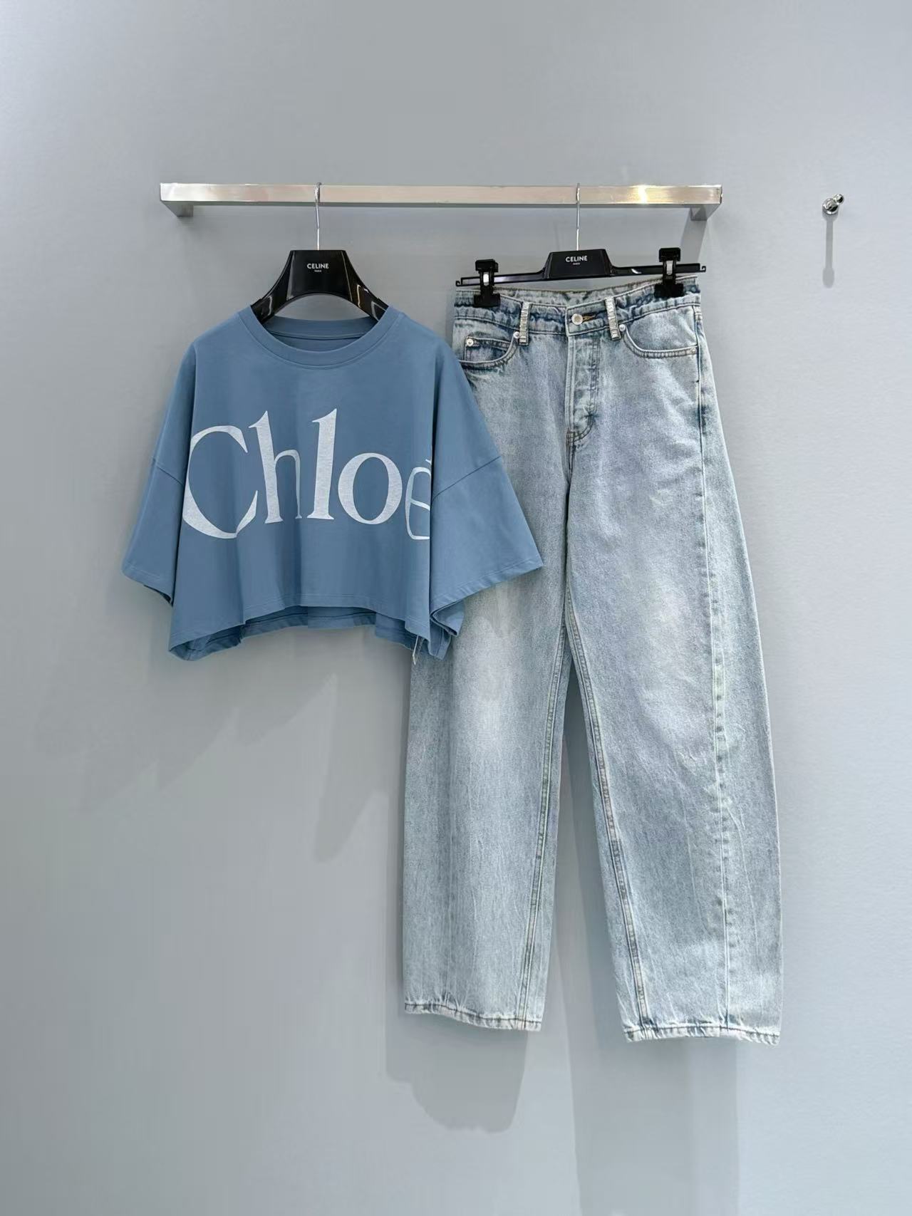 淺藍色的水洗做舊質感,賦予了它一種高級的復古底色,而腰間那圈 BlingBling 的水鑽鏈條,則讓整體穿搭瞬間充滿高光。