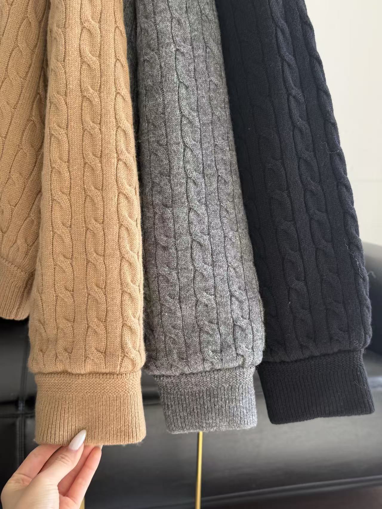 編織工藝:採用經典的菱紋絞花編織(Cable Knit),立體的織紋賦予面料獨特的層次肌理,不僅視覺飽滿,且質地厚實不易變形。