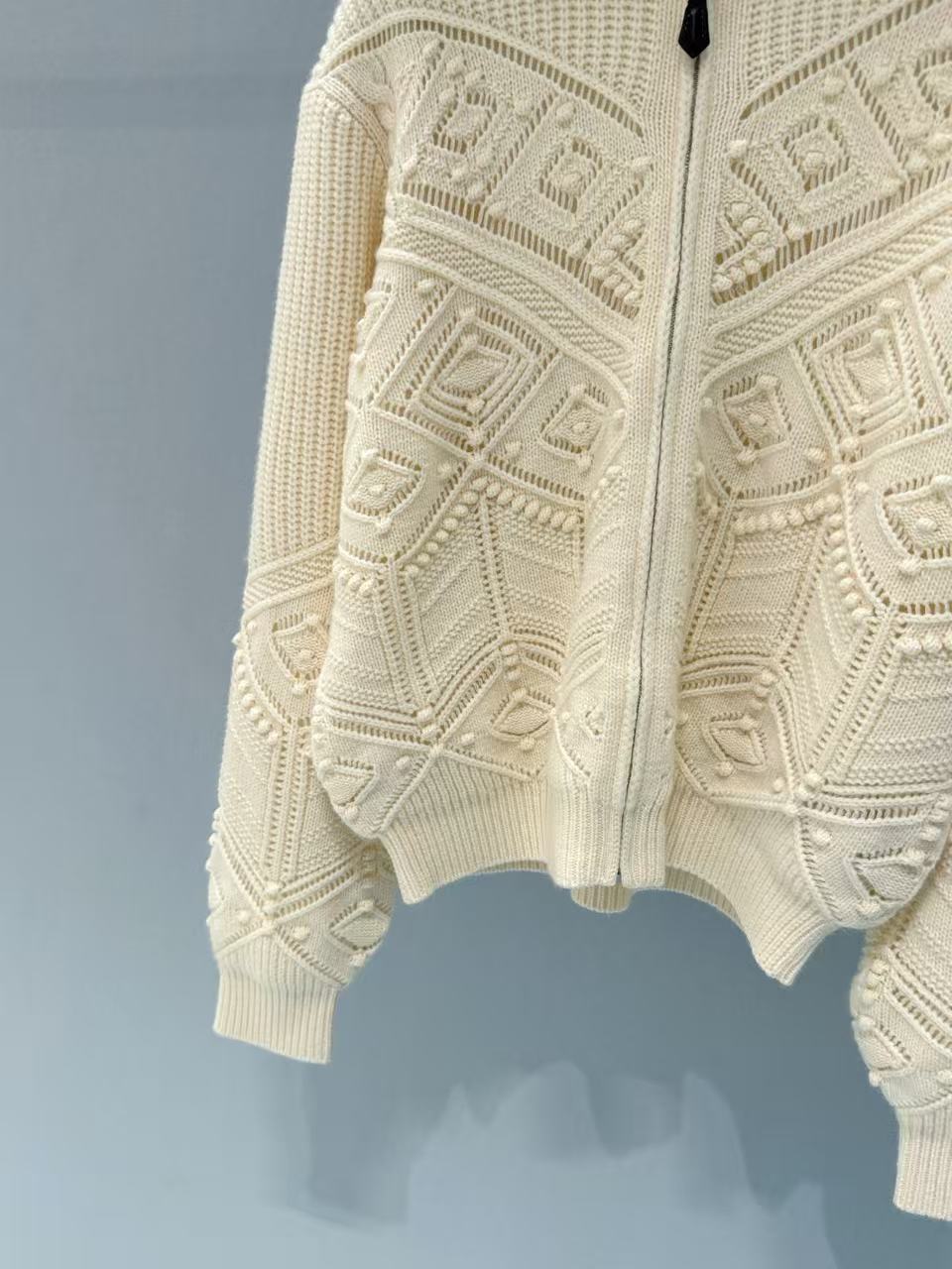 衣身滿版的菱形格紋搭配立體毛球肌理,遠看低調近看超有質感,每一顆毛球都是手工定位,摸得到那種精緻的立體感,比一般針織衫更有辨識度。