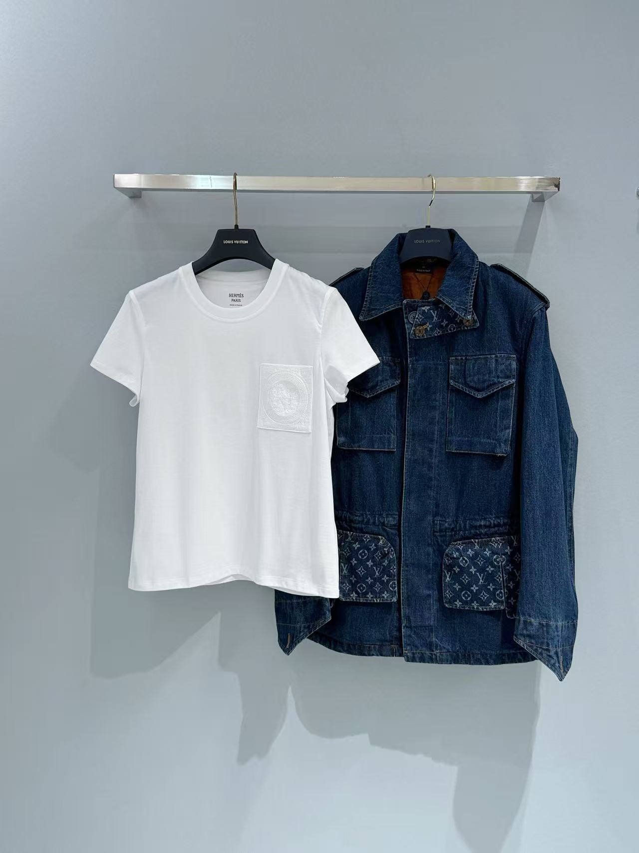 這款直筒版型設計低調卻充滿細節,前胸口袋上繡著品牌標誌性的「H Mosaique」馬賽克圖案刺繡,精緻又不張揚,