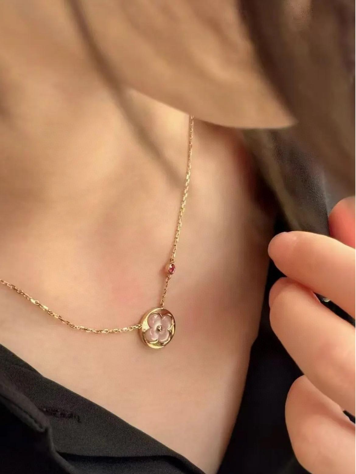 將象徵幸運的四葉草設計融入日常配飾,以天然粉貝與粉色藍寶石組合而成的圓形吊墜,不僅有氣質,更添一份柔和與甜美。