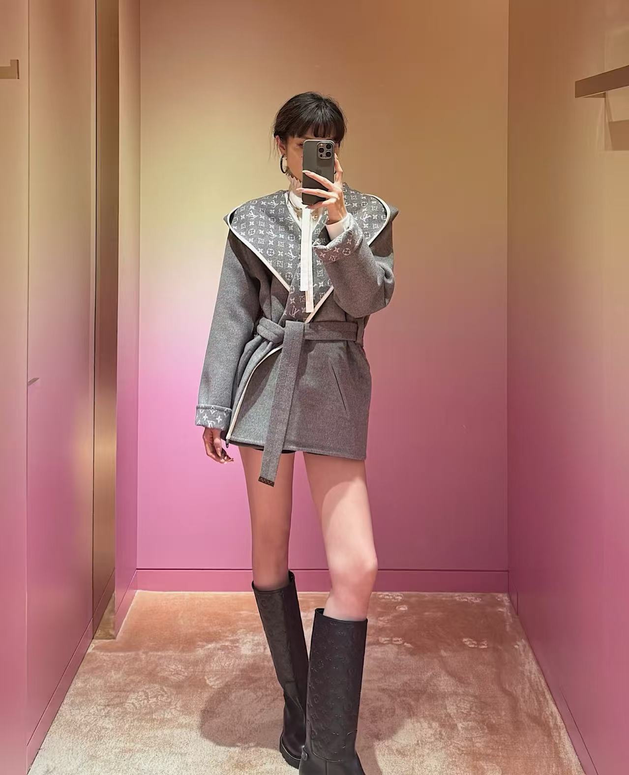 一條腰帶輕輕繫上,腰線自己浮現,顯瘦到犯規!袖子隨意翻折就能露出內裡滿版 Monogram 老花提花,棕色老花細節若隱若現,瞬間辨識度爆棚,隨便抬手都像在拍雜誌。