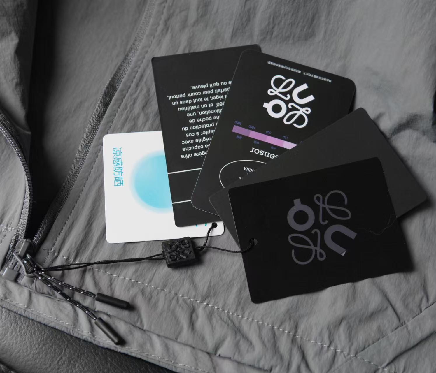 這件防曬功能真的讓我超驚豔!它擁有 UPF50+ 的高防曬係數,而且隨衣附贈的防曬測試卡,只要在陽光下,品牌 Logo 就會隨著紫外線的強度變成深淺不同的紫色,讓你一眼就能看到它的防曬效果有多好,真的超聰明!