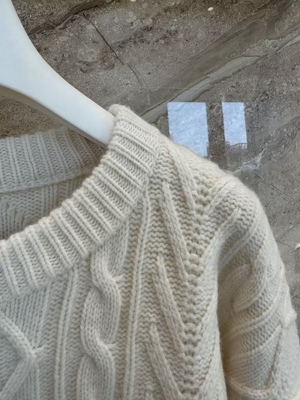 這款毛衣最迷人之處,在於其立體感十足的編織工藝。粗細交錯的麻花紋理,在光影下呈現出紮實且富有質感的層次,營造出一種不費力的慵懶感(Effortless Chic)。