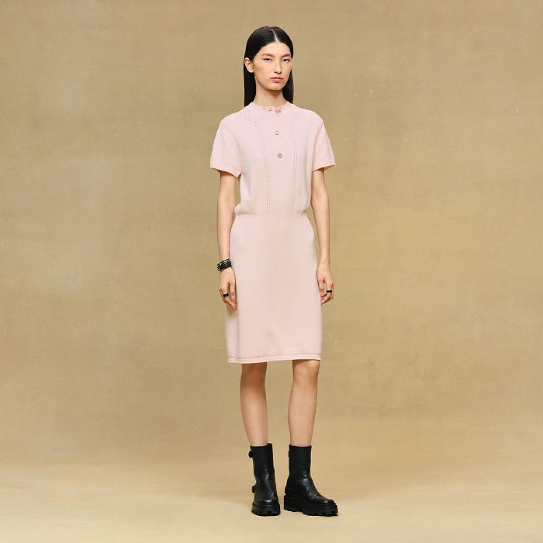 立體挺度: 雖然是針織材質,但因為支數高,裙擺具有很好的「支撐力」,不會軟塌貼在腿上,能長久維持俐落的廓形。