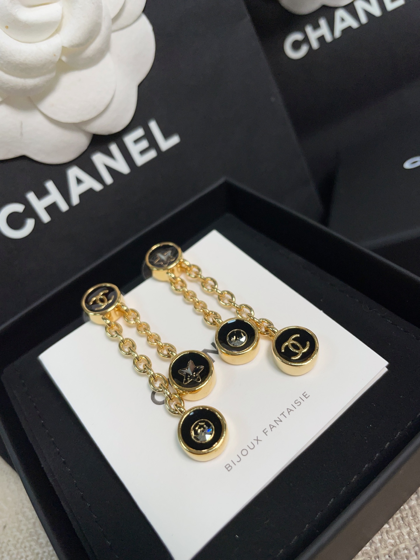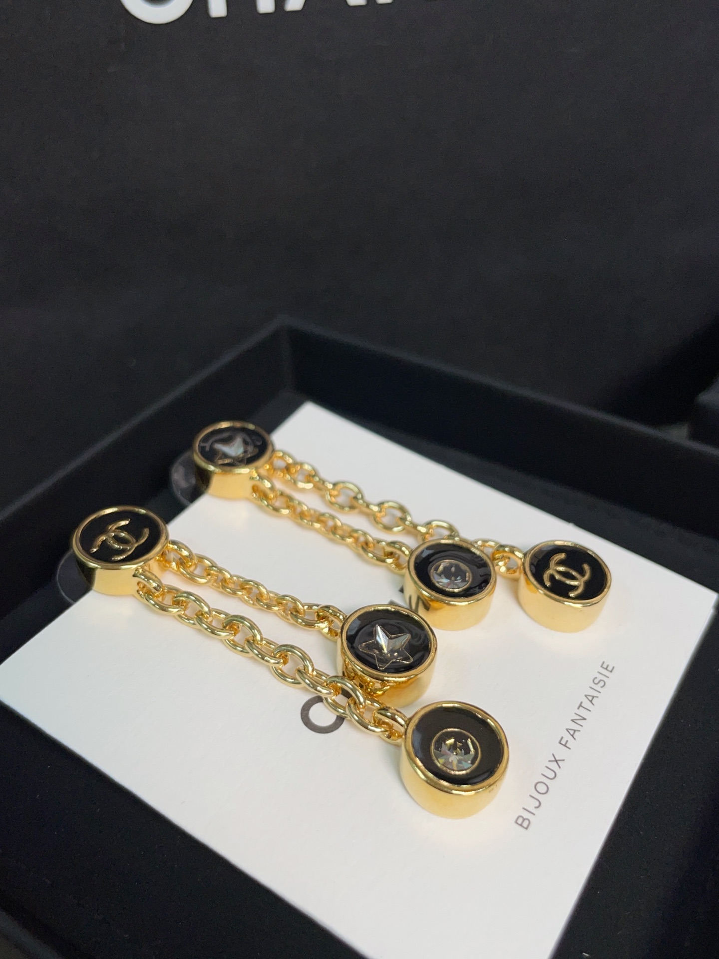 這款耳環最迷人的地方在於它的細節層次——金邊圓形與黑色樹脂的搭配非常和諧,閃爍著微光的流蘇在移動間輕盈搖曳,