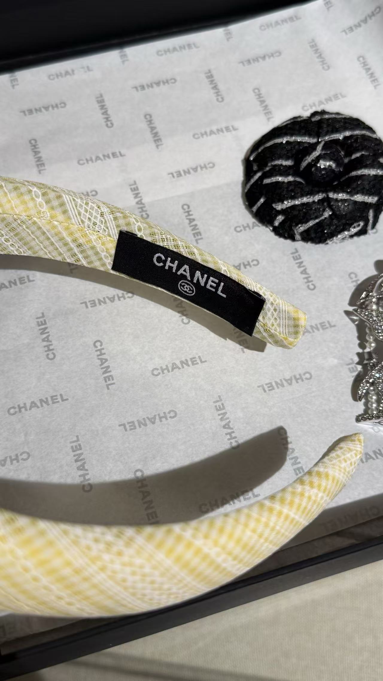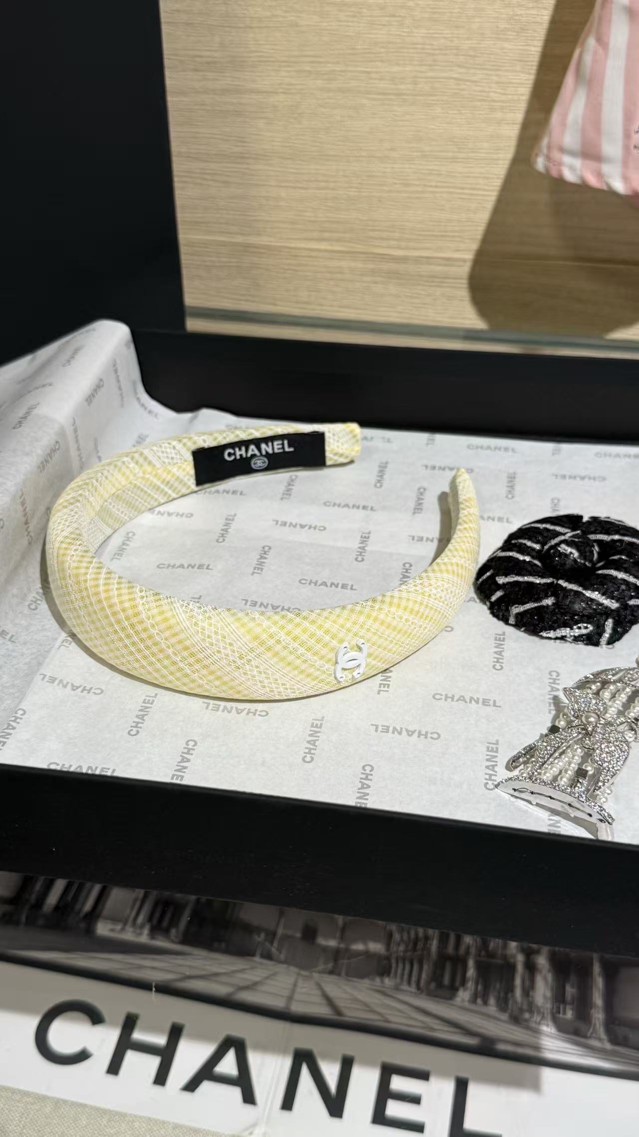 奶黃色小格紋布料超級溫柔,邊緣一圈細緻法式蕾絲,中央是經典白色琺瑯雙C Logo,