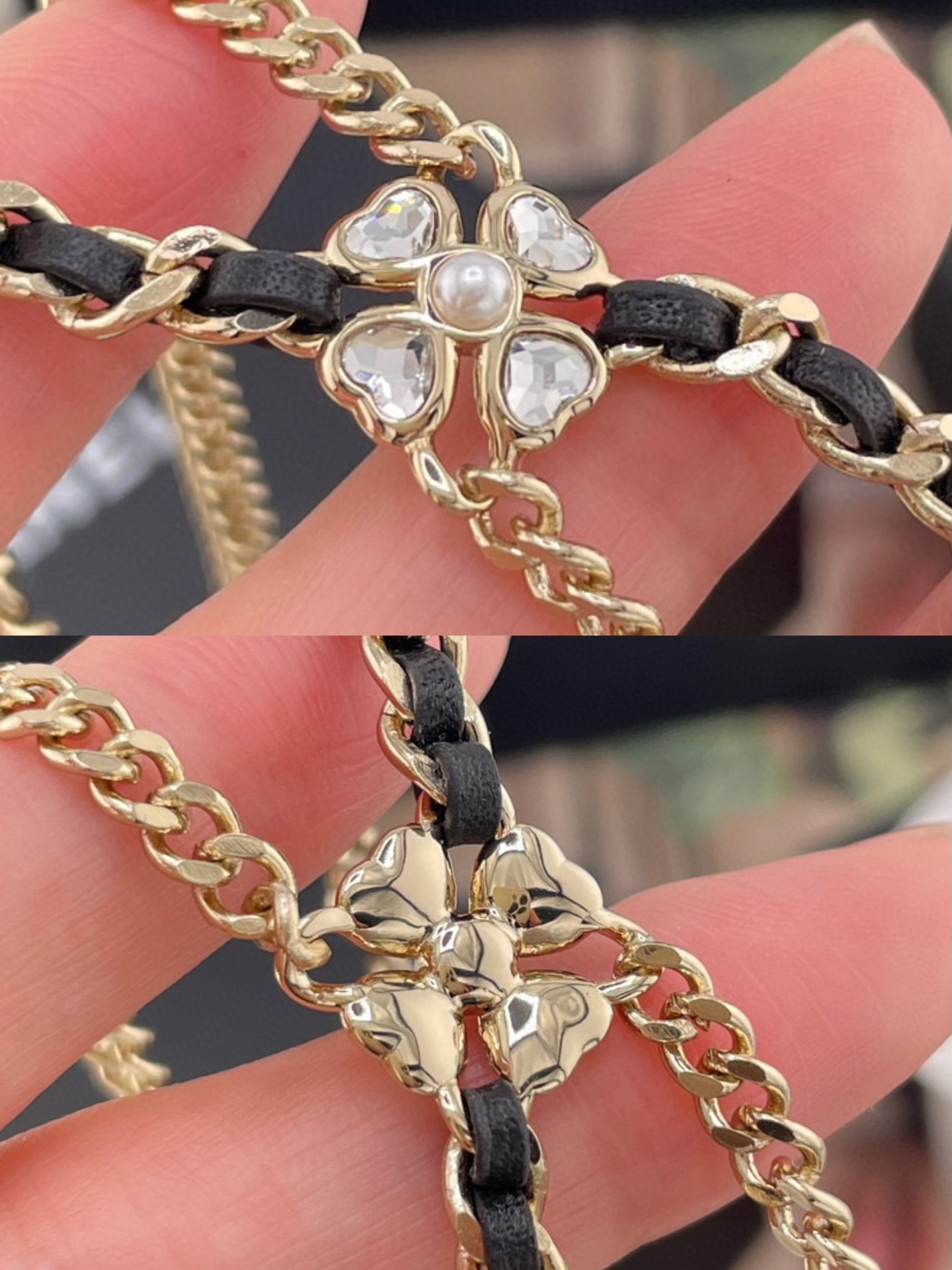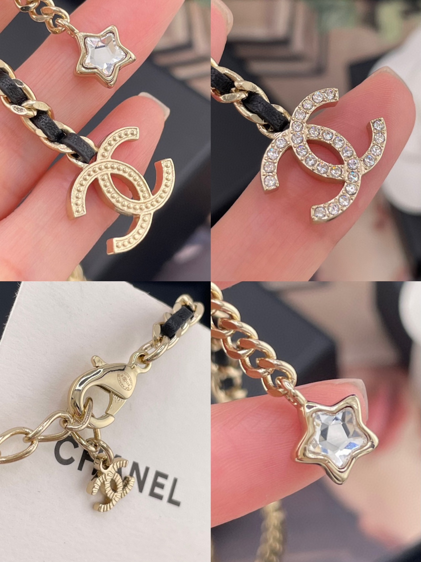 長度可自由調節,戴上後會隨著光線閃耀出不同層次的光芒。設計上結合了星星、四葉草、雙 C 以及皮穿鏈等經典元素,再搭配特別定制的愛心與星星形狀水晶,整體靈動俏麗又帶點甜颯感。