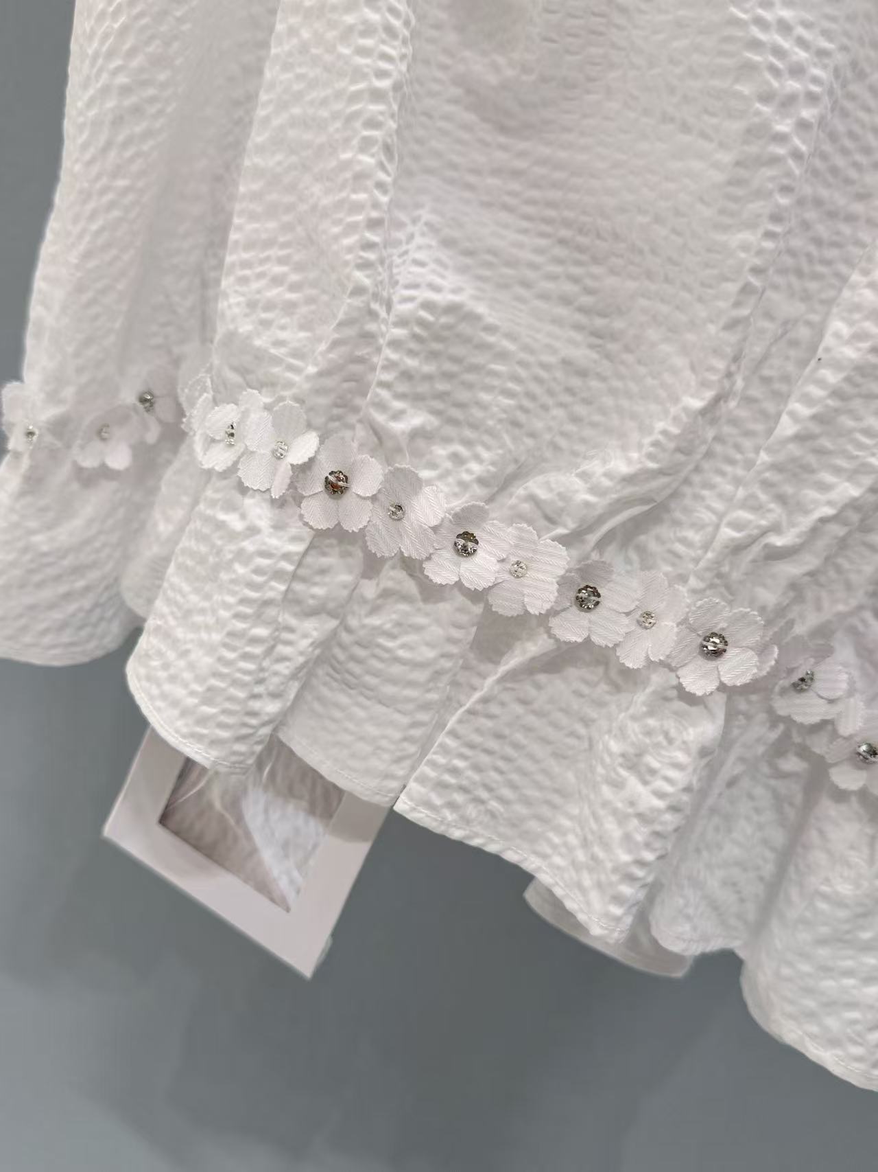 手工立體花朵: 領口拼接網紗並手工訂製立體花朵,花心點綴水鑽。