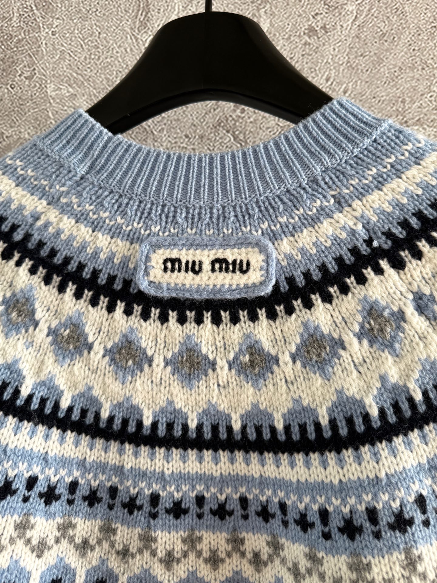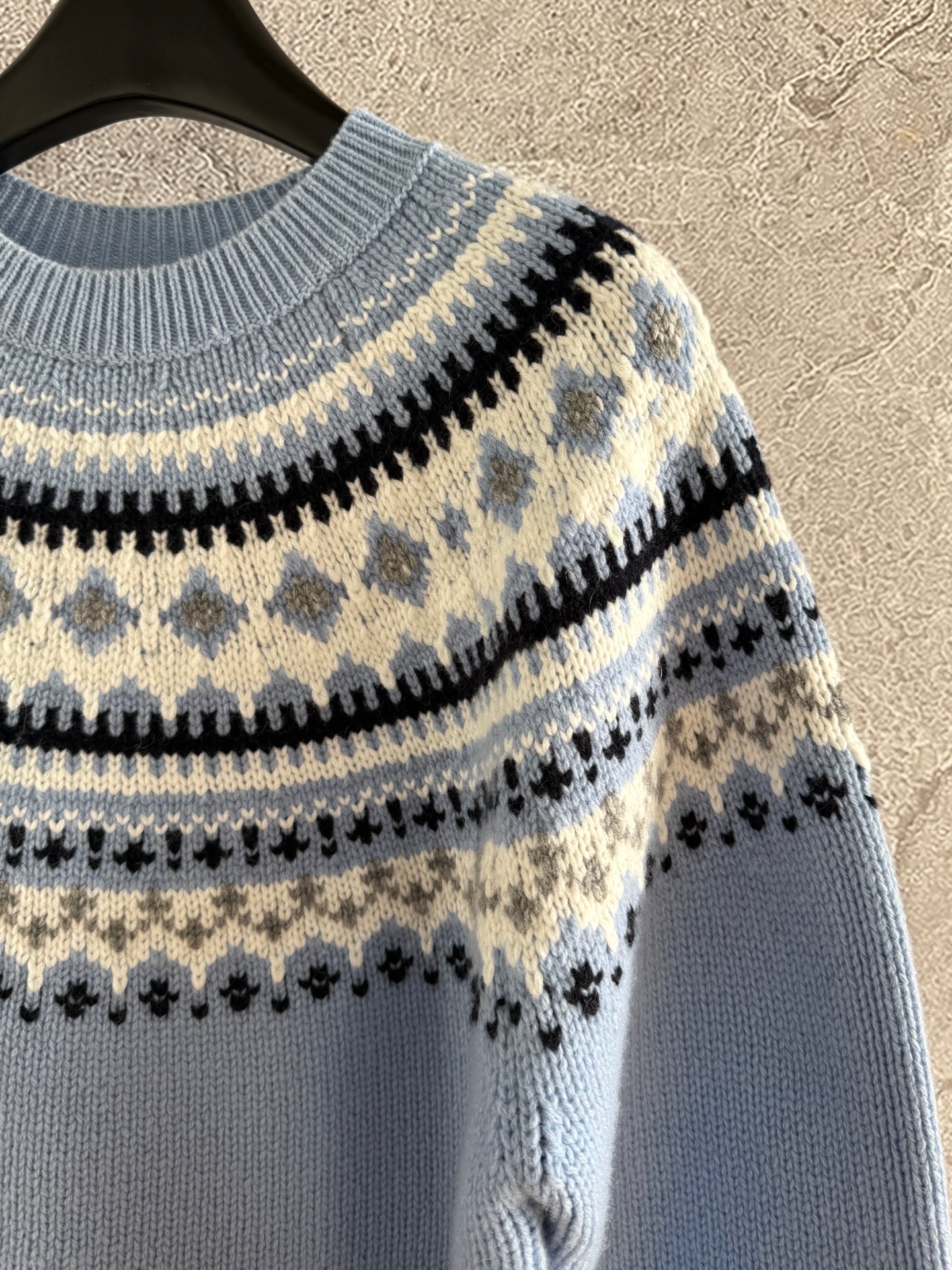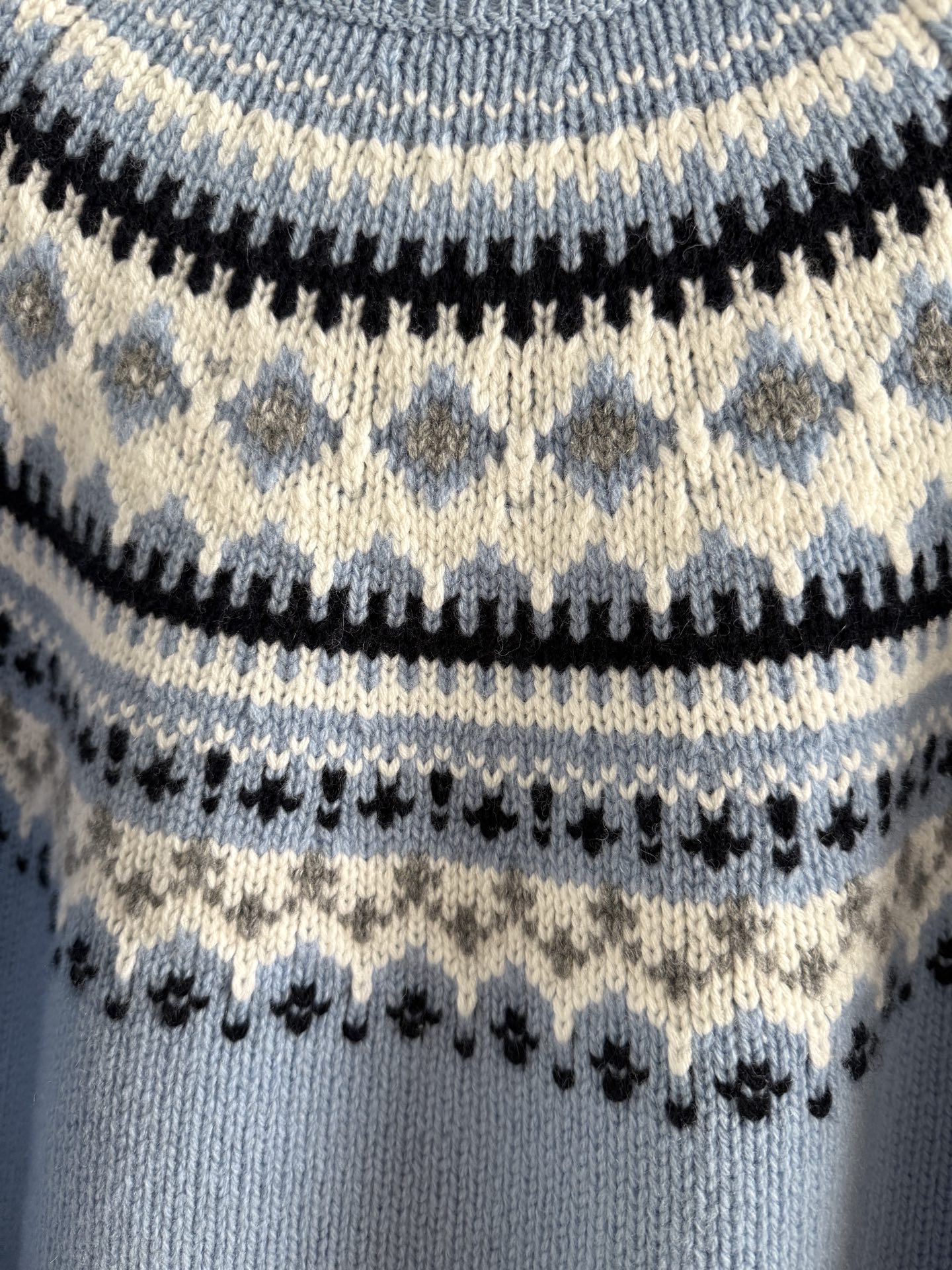 這件的靈魂絕對是那經典的「費爾島提花」——在淺藍色底上點綴雪花紋理,就像冬夜裡靜靜飄落的初雪,柔和又浪漫。