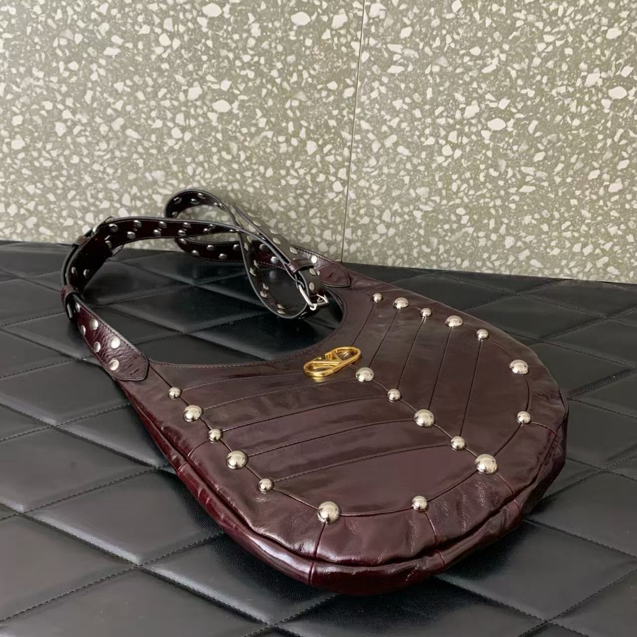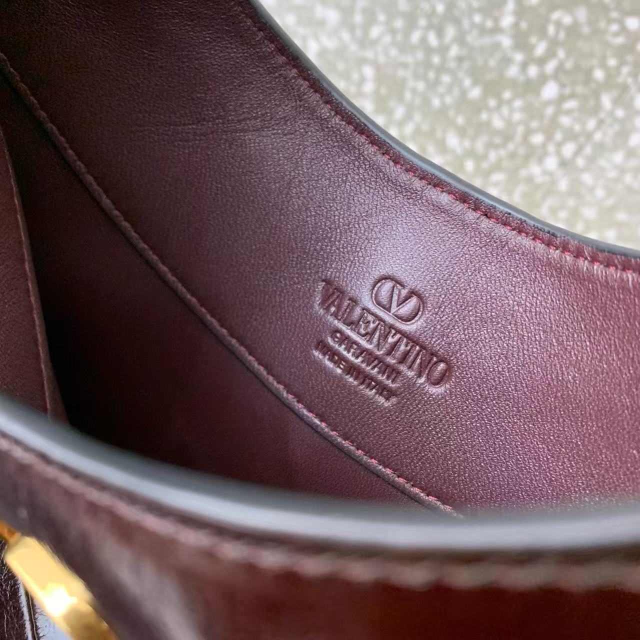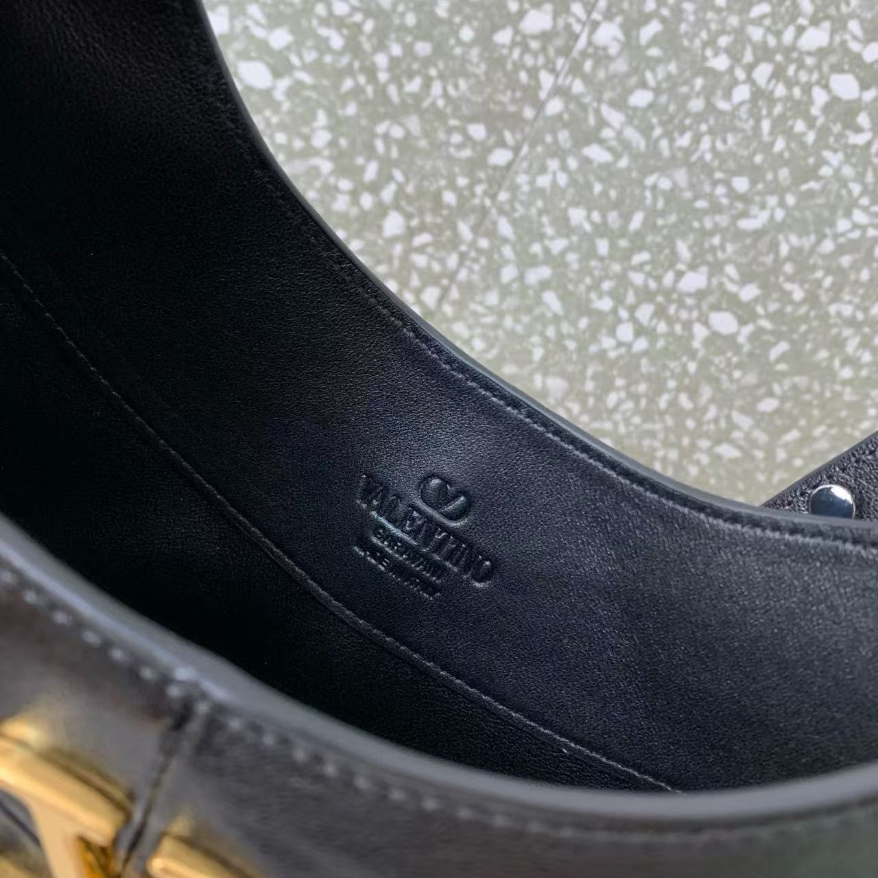 V 字拼接設計玩轉亮面與霧面皮革的對比張力,鋪陳出層次分明的視覺饗宴;復古黃銅做舊 VLOGO Signature 加上銀色鉚釘點綴,像極了義大利街頭的搖滾詩篇,隨性卻充滿故事感。
