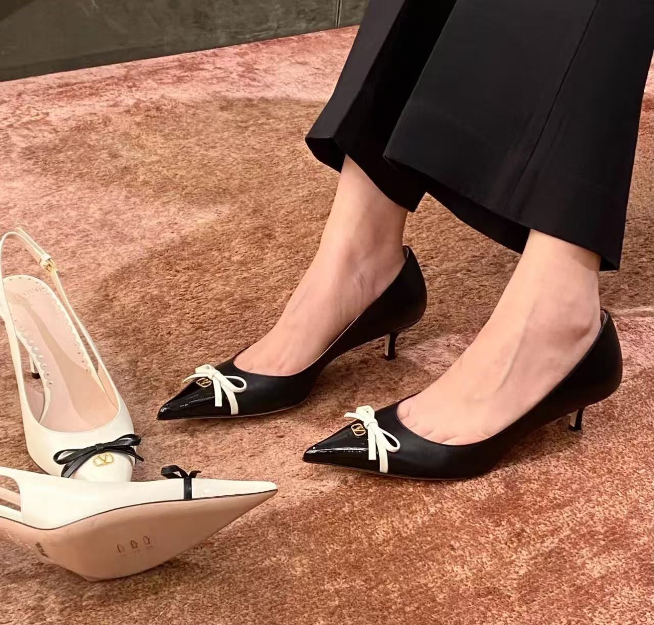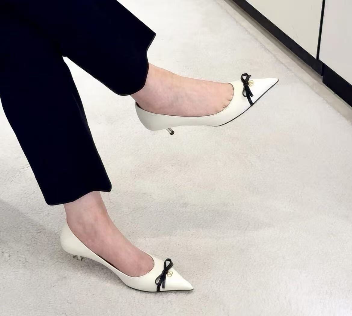 這款 2025 年新款拼色單鞋,大膽地將俐落的尖頭設計與復古蝴蝶結元素揉合,打破了高跟鞋過於嚴肅的刻板印象。