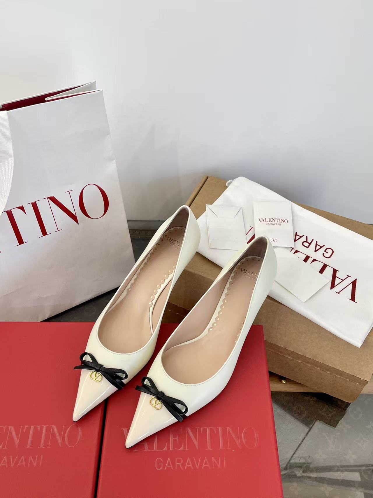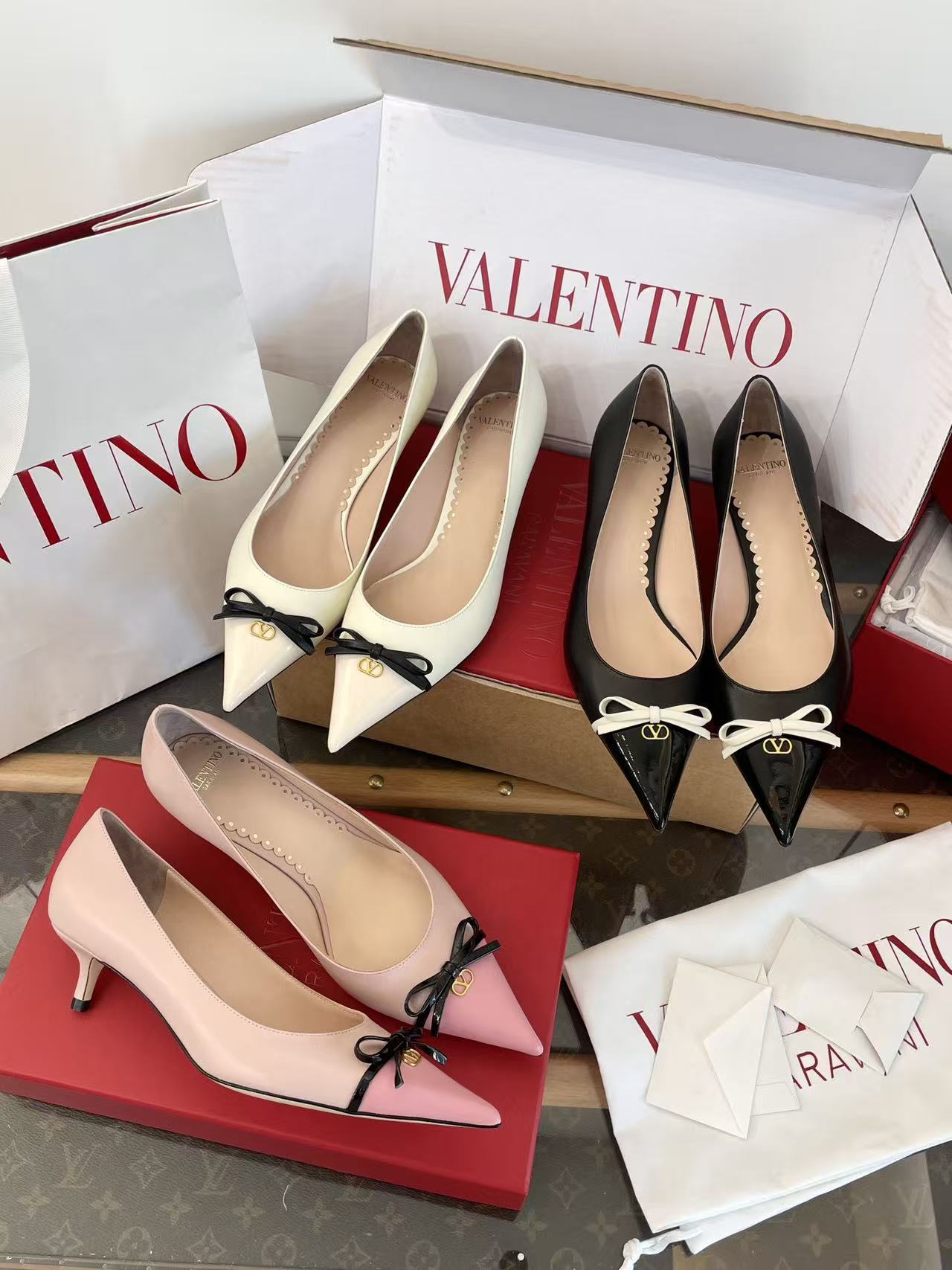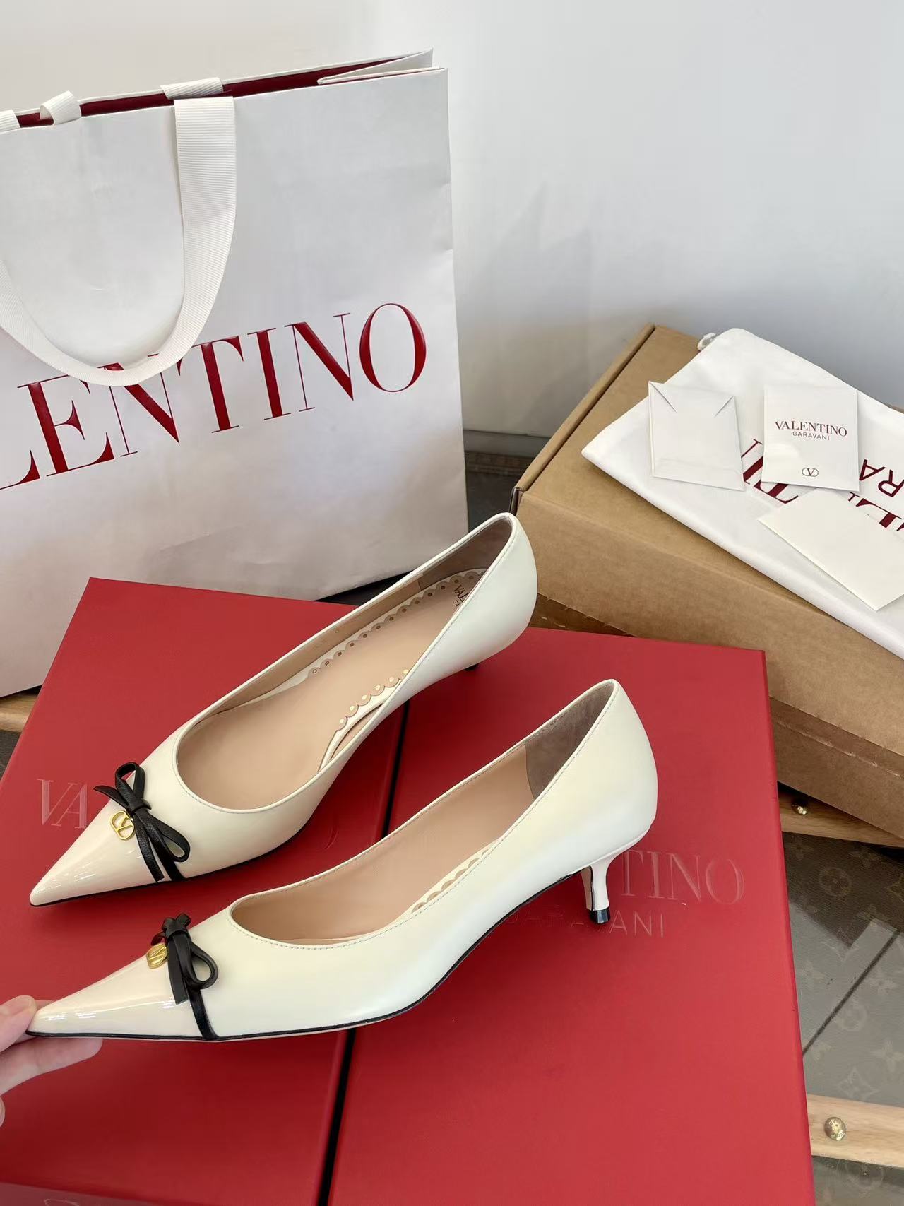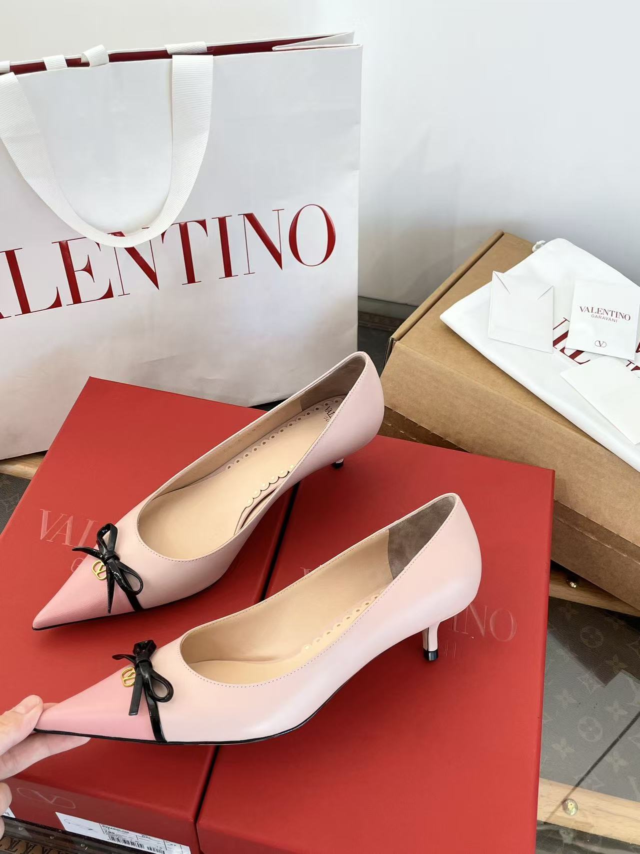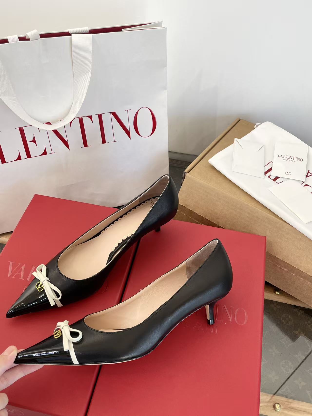 2025秋冬新品 V家 拼色蝴蝶結尖頭貓跟鞋