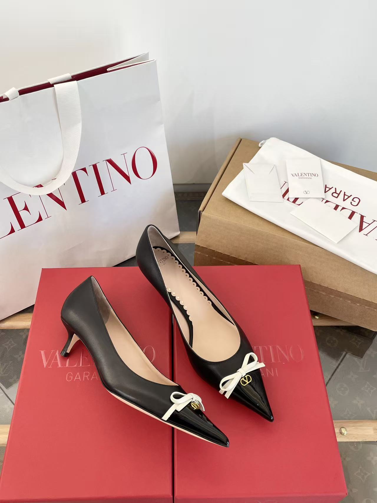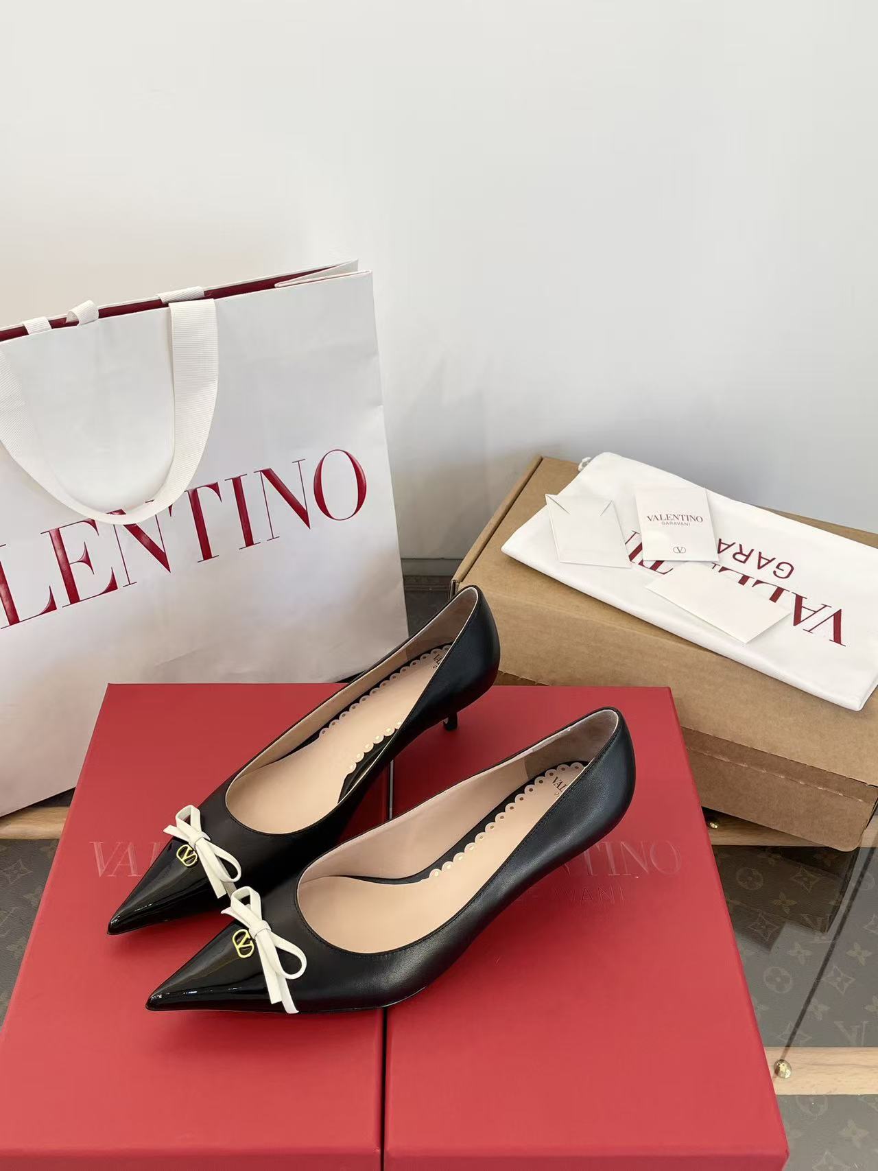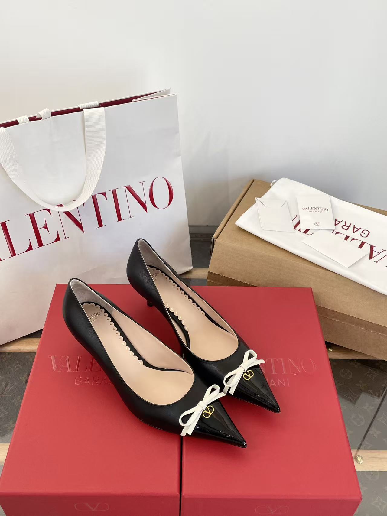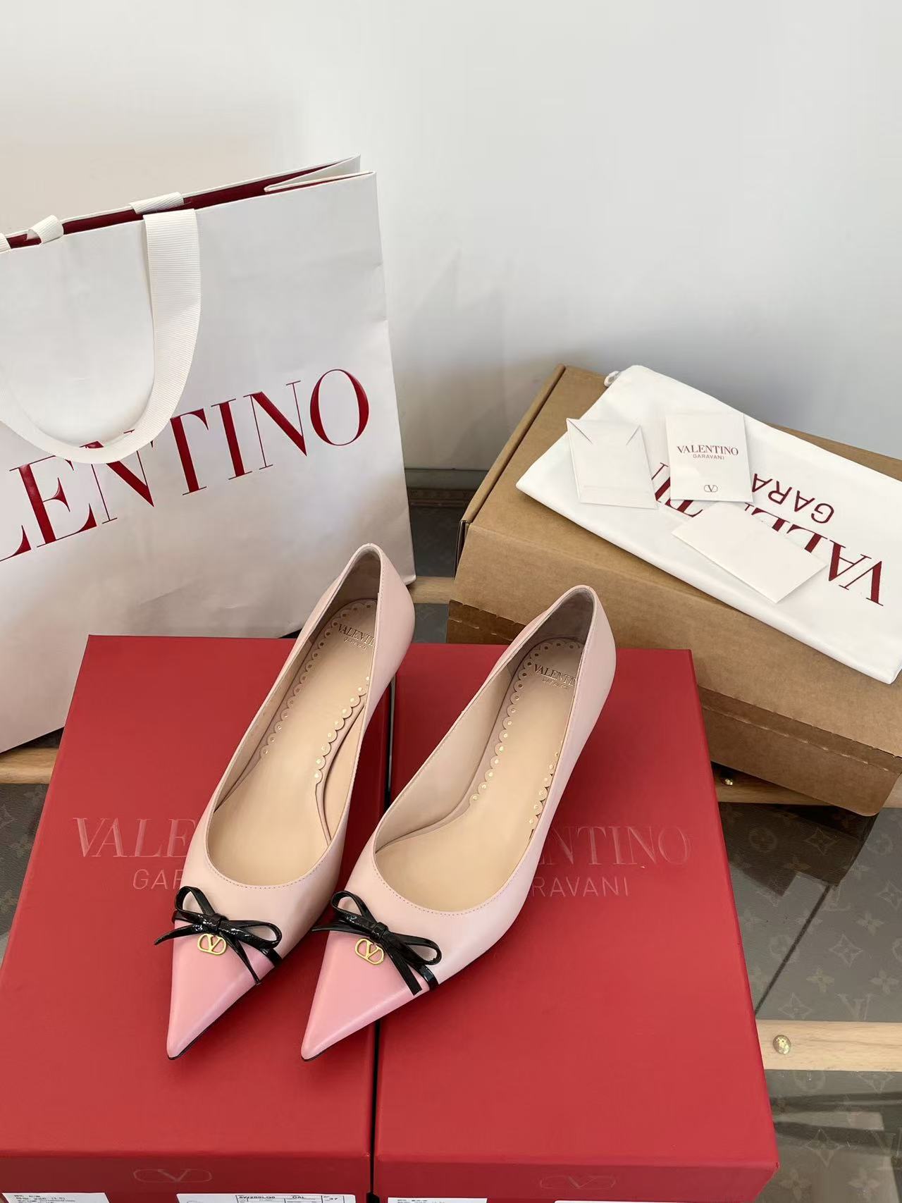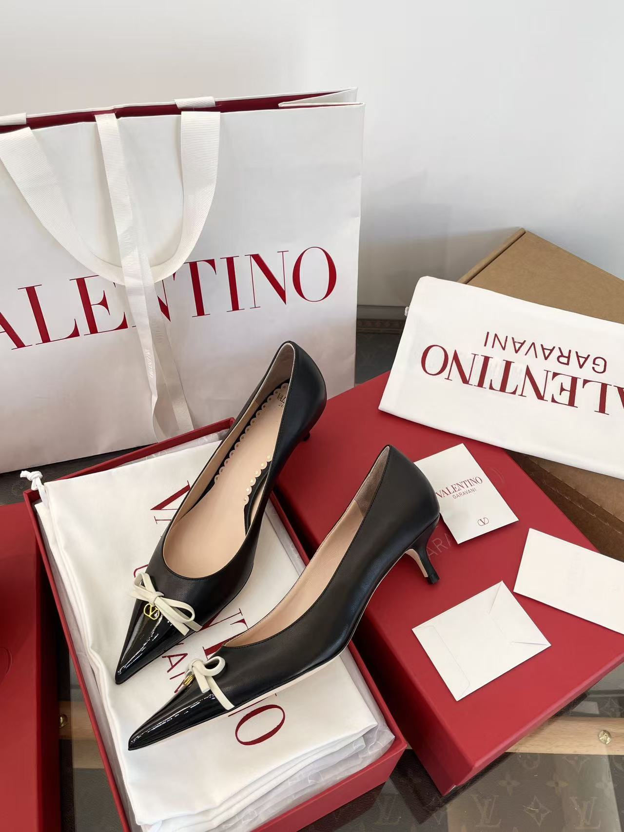 2025秋冬新品 V家 拼色蝴蝶結尖頭貓跟鞋