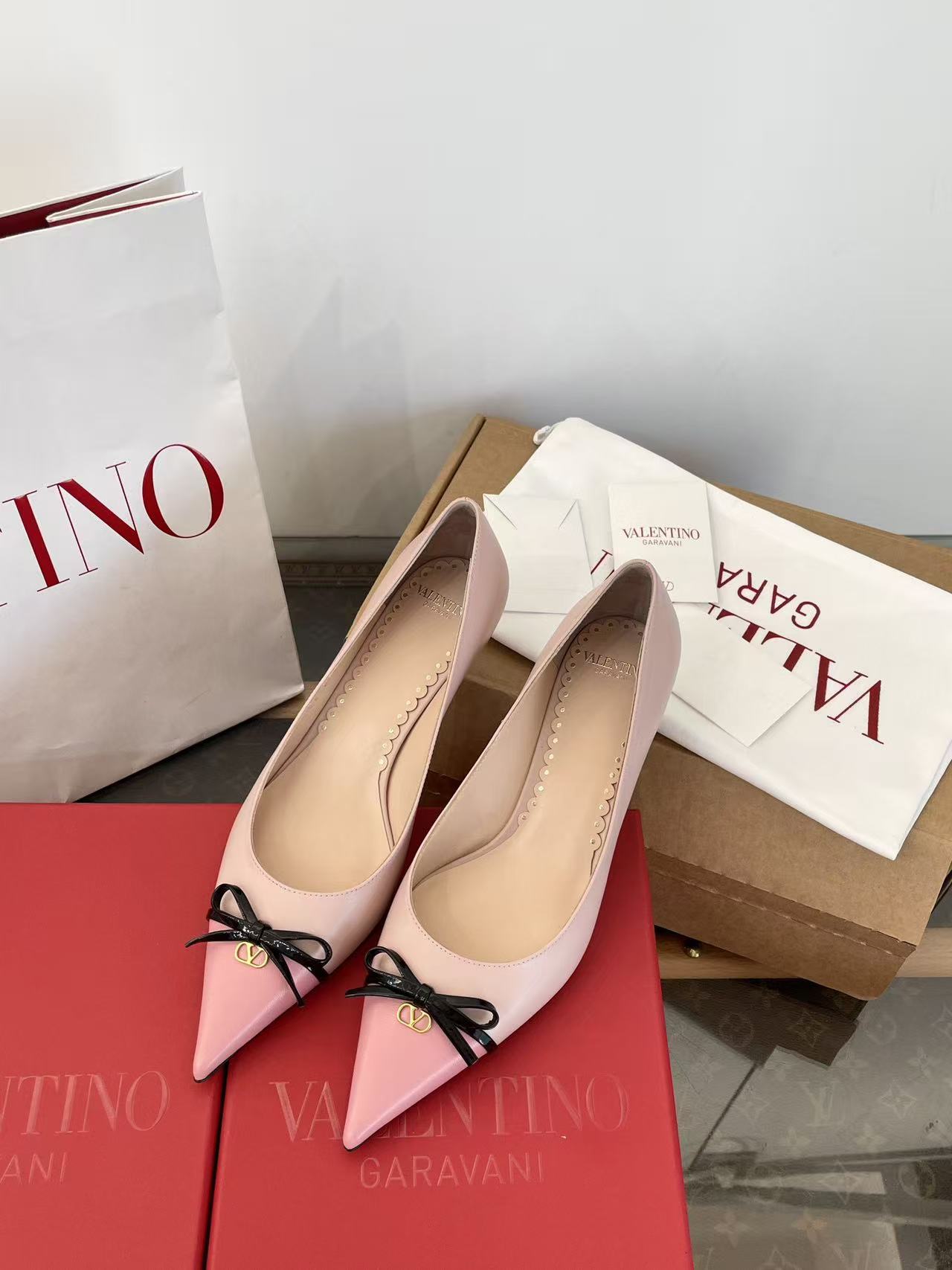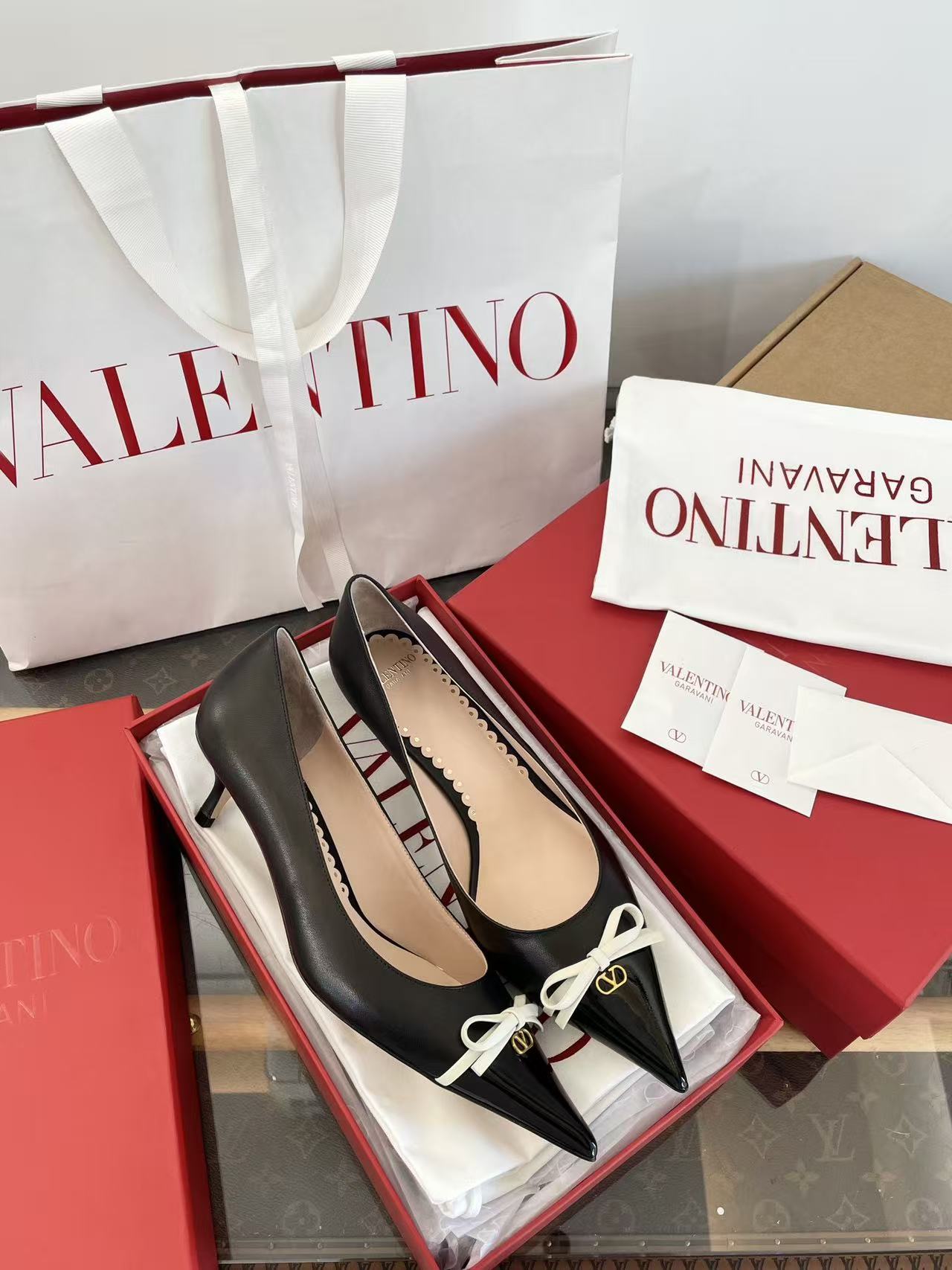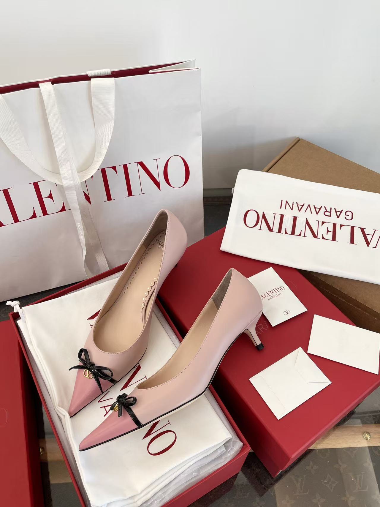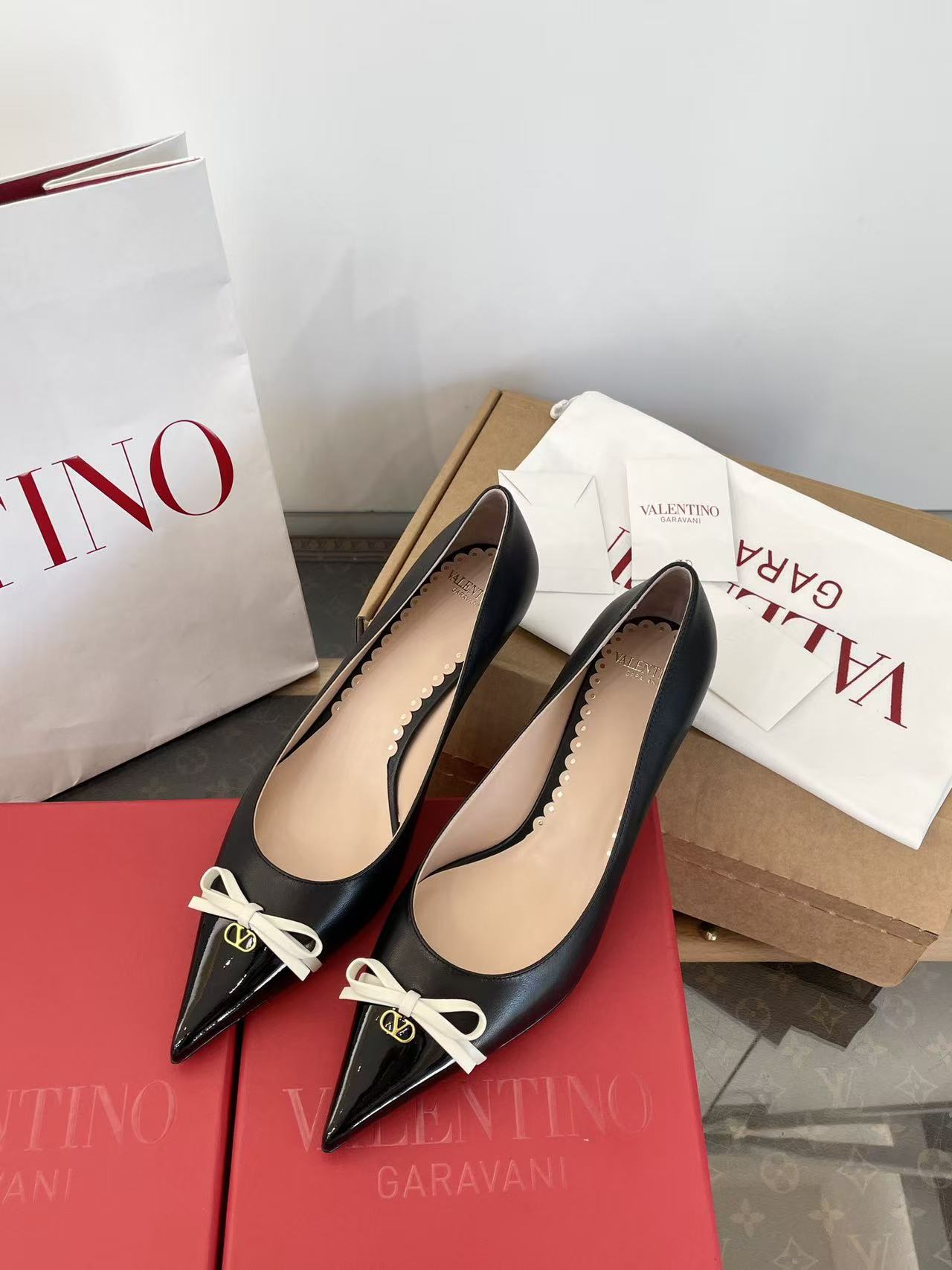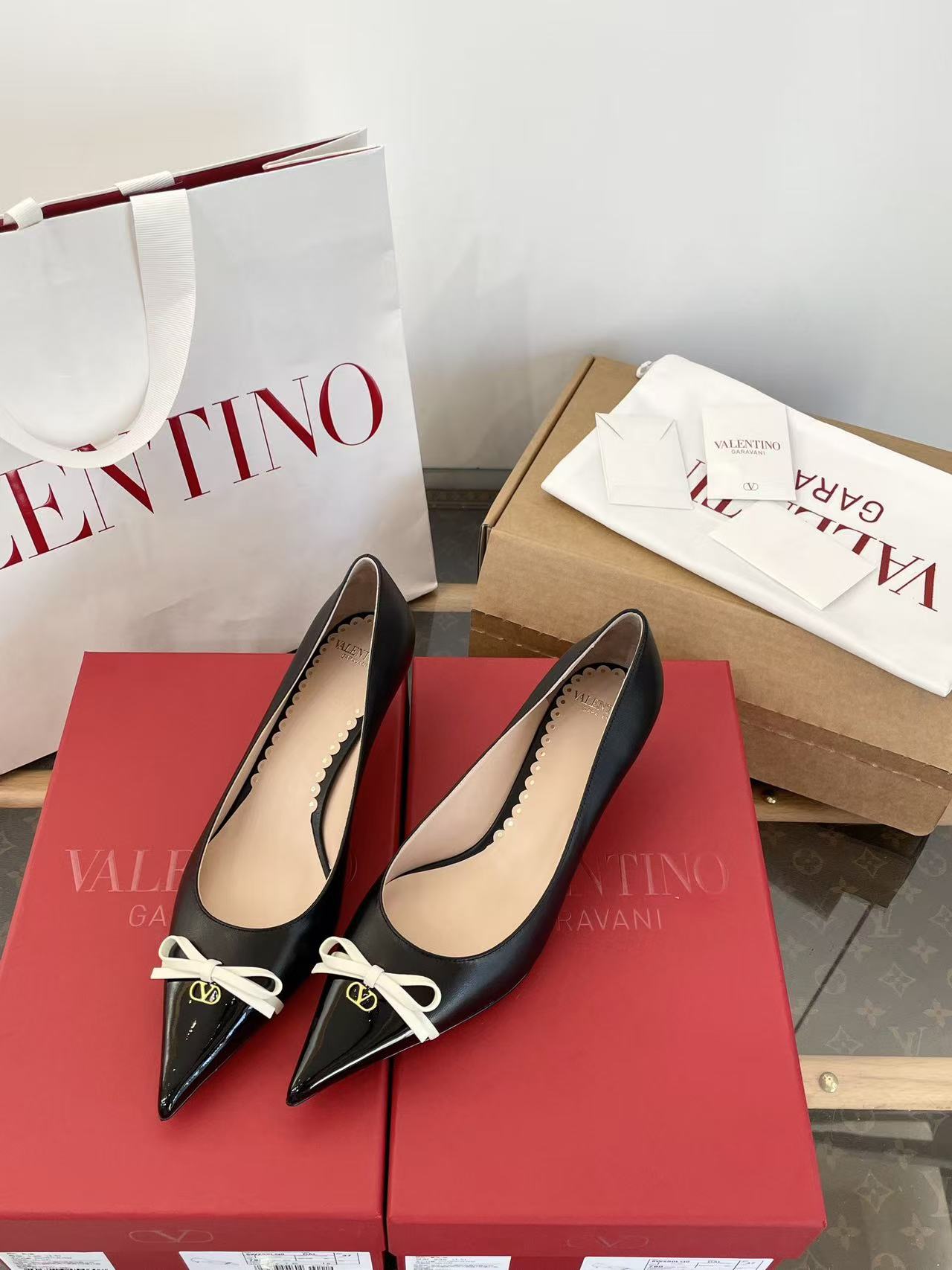 2025秋冬新品 V家 拼色蝴蝶結尖頭貓跟鞋